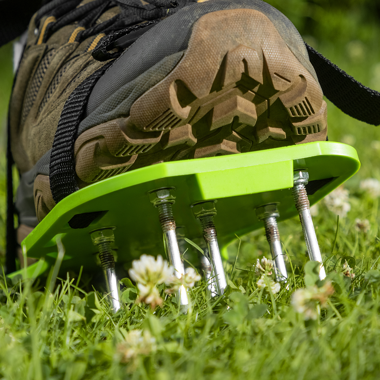 - Высокий ресурс — острые шипы из среднеуглеродистой стали оптимальны для аэрации газона, эластичная добавка в смеси с полипропиленом обеспечивает износоустойчивость и долговечность платформ.