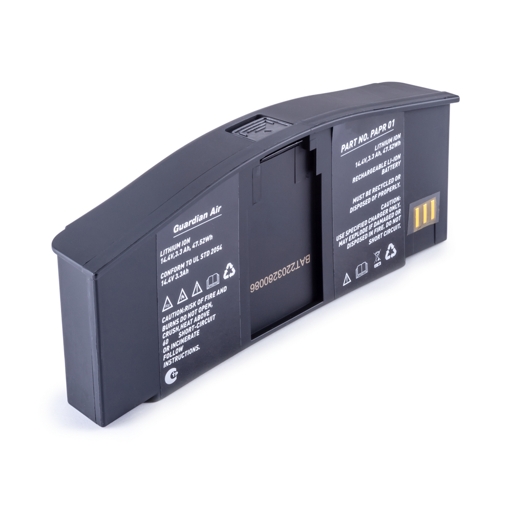 Аккумуляторная батарея предназначена для электропитания двигателя турбоблока маски Guardian. Тип АКБ Li-ion с повышенным количеством циклов заряда – разряда. Батарея съёмная, имеет гарантию 6 месяцев. Для заряда можно использовать USB зарядное устройство с кабелем разъёмом Type-C. Ёмкости 3,3 А/Ч хватит на длительное время работы. Напряжение батареи равно 14,4 Вольта.