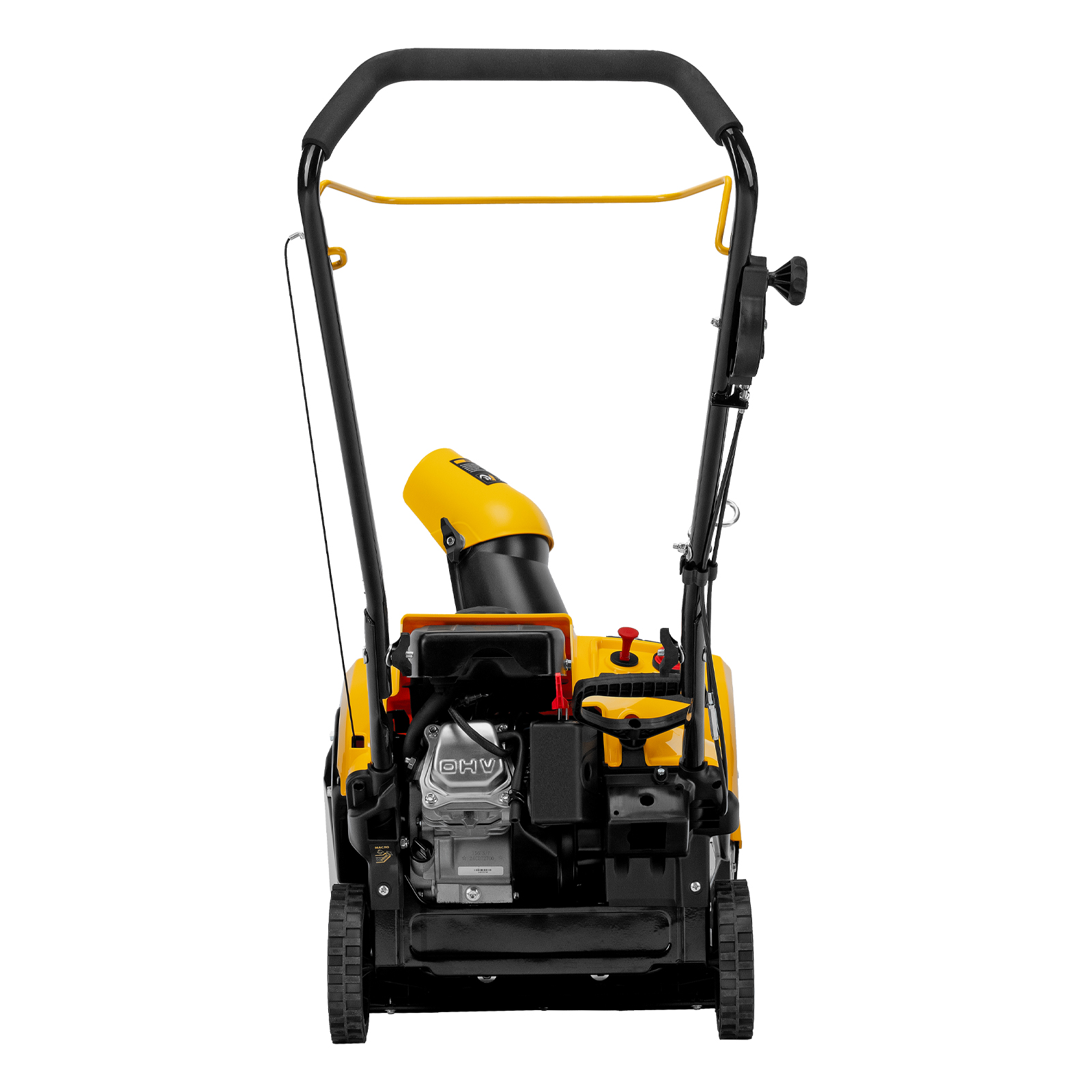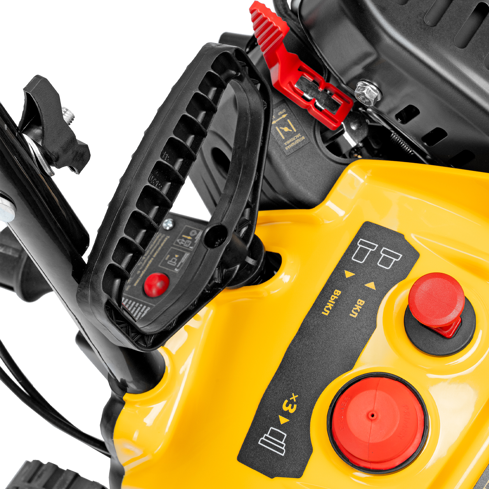 - Удобное управление — широкая рукоятка ручного старта облегчает запуск двигателя, для регулировки угла поворота желоба не нужно наклоняться.