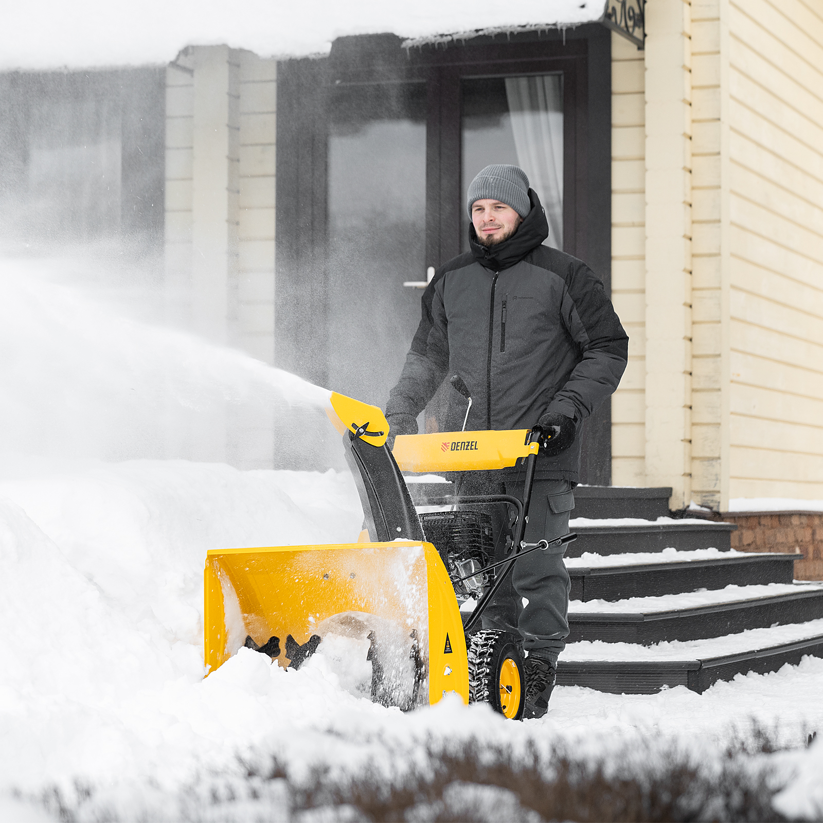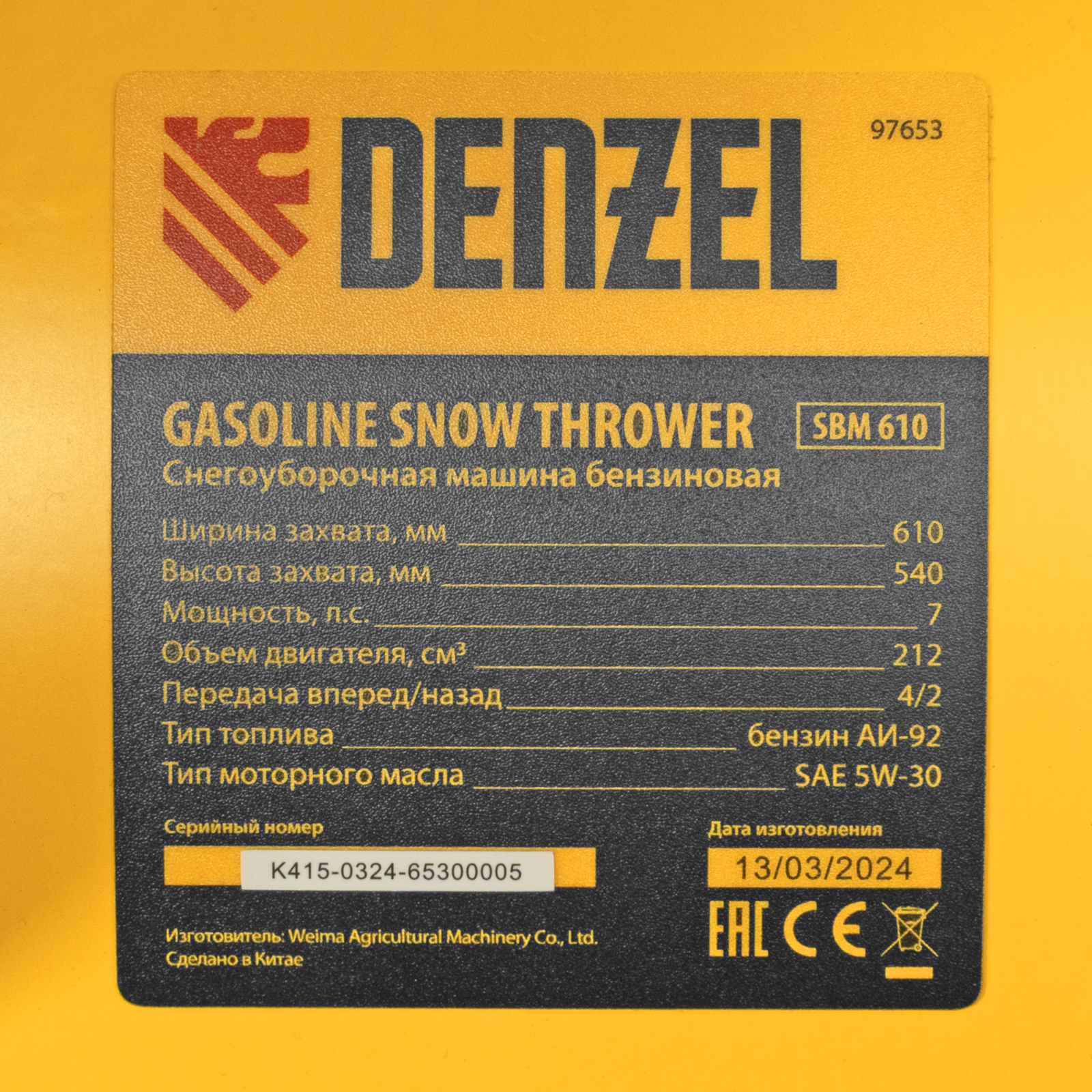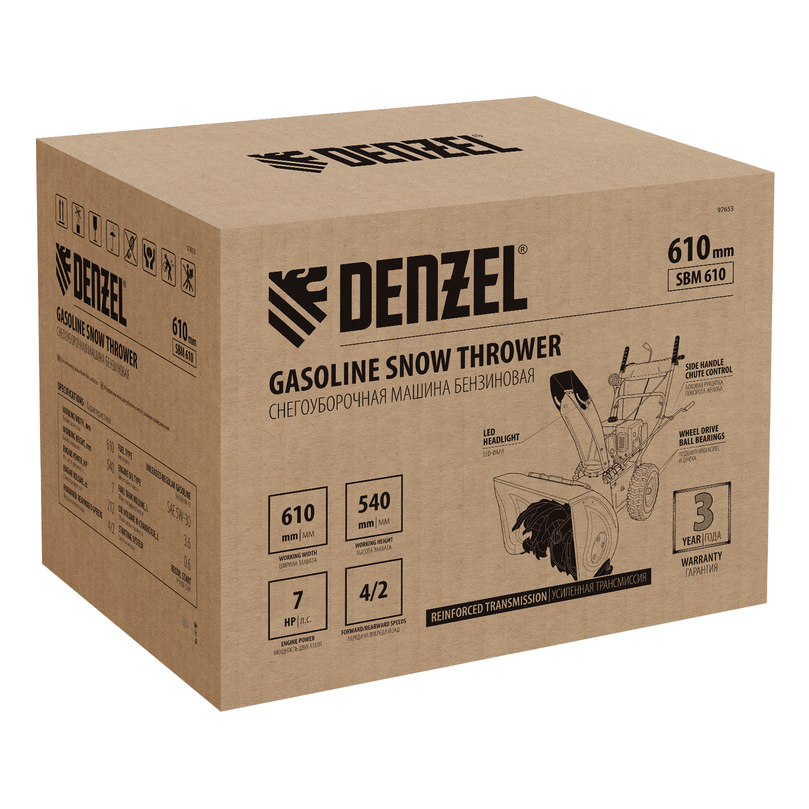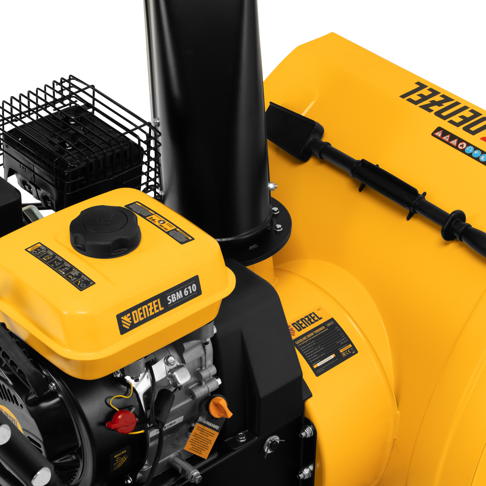 Бензиновая снегоуборочная машина Denzel SBM 610 97653 с двигателем объемом 212 cм3, ручным стартом и фарой предназначена для уборки территорий загородных домов, коттеджей, подъездных дорог и улиц СНТ, парковок и городских дворовых территорий.