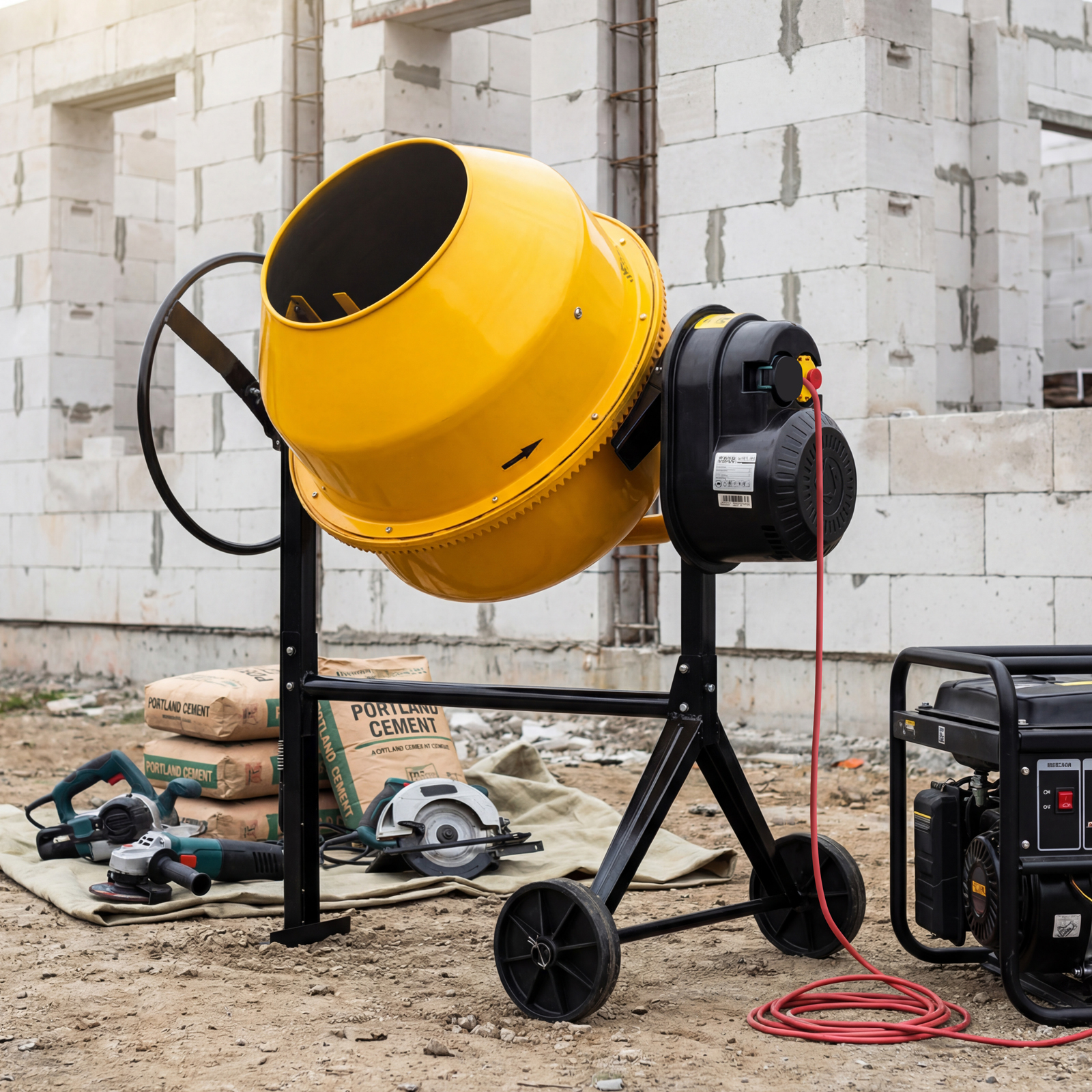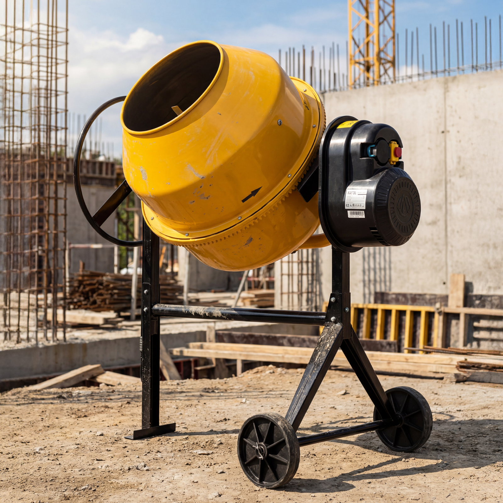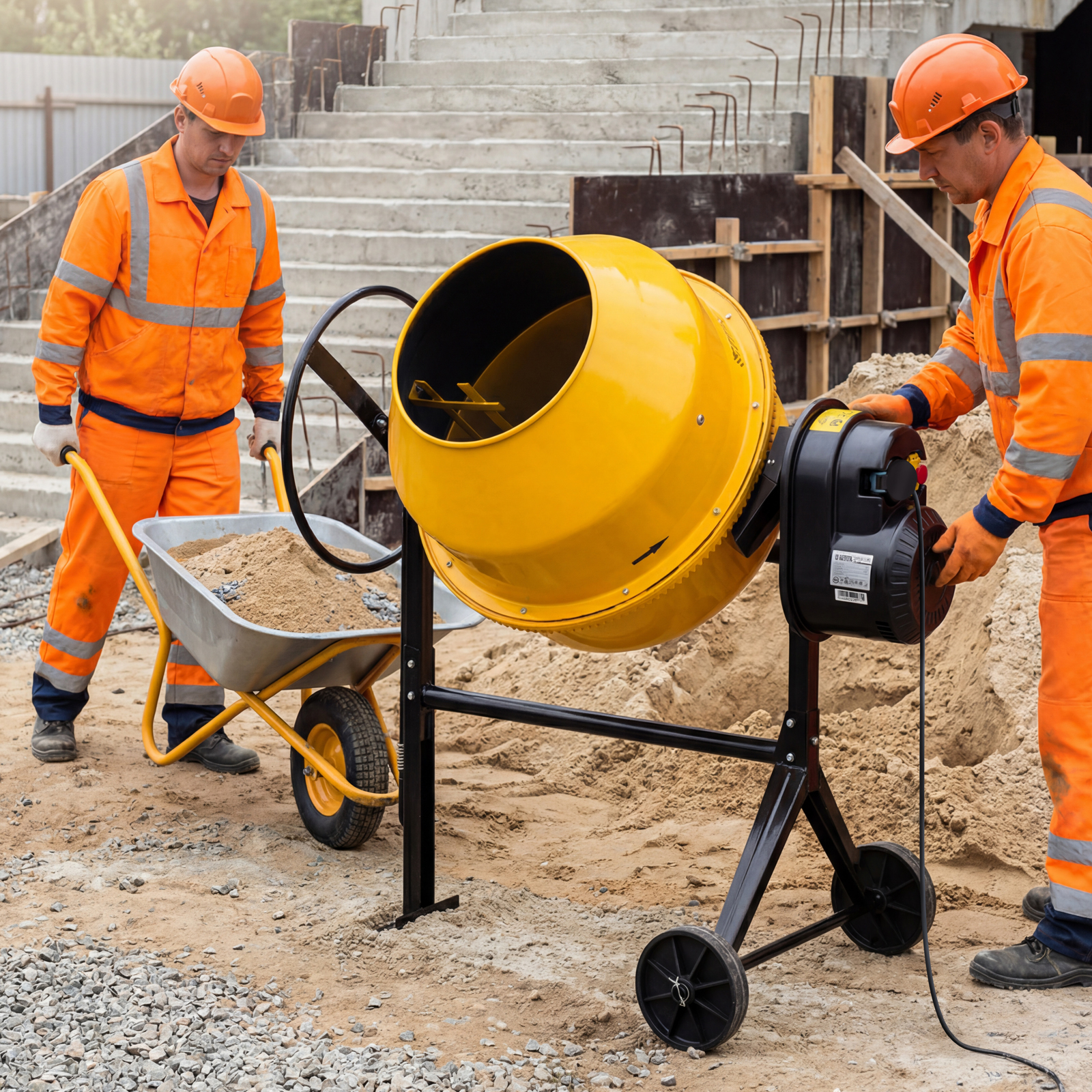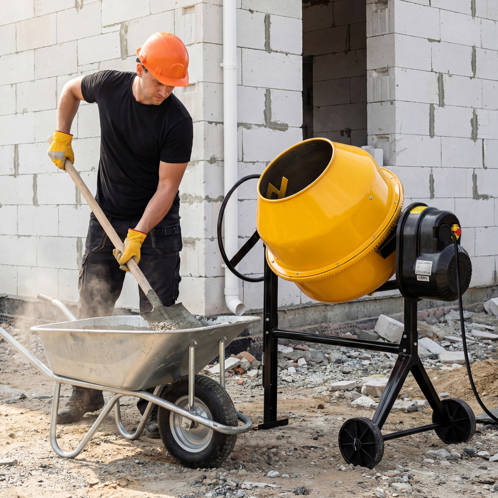 - Удобная транспортировка — колеса упрощают перемещение бетоносмесителя по строительной площадке.