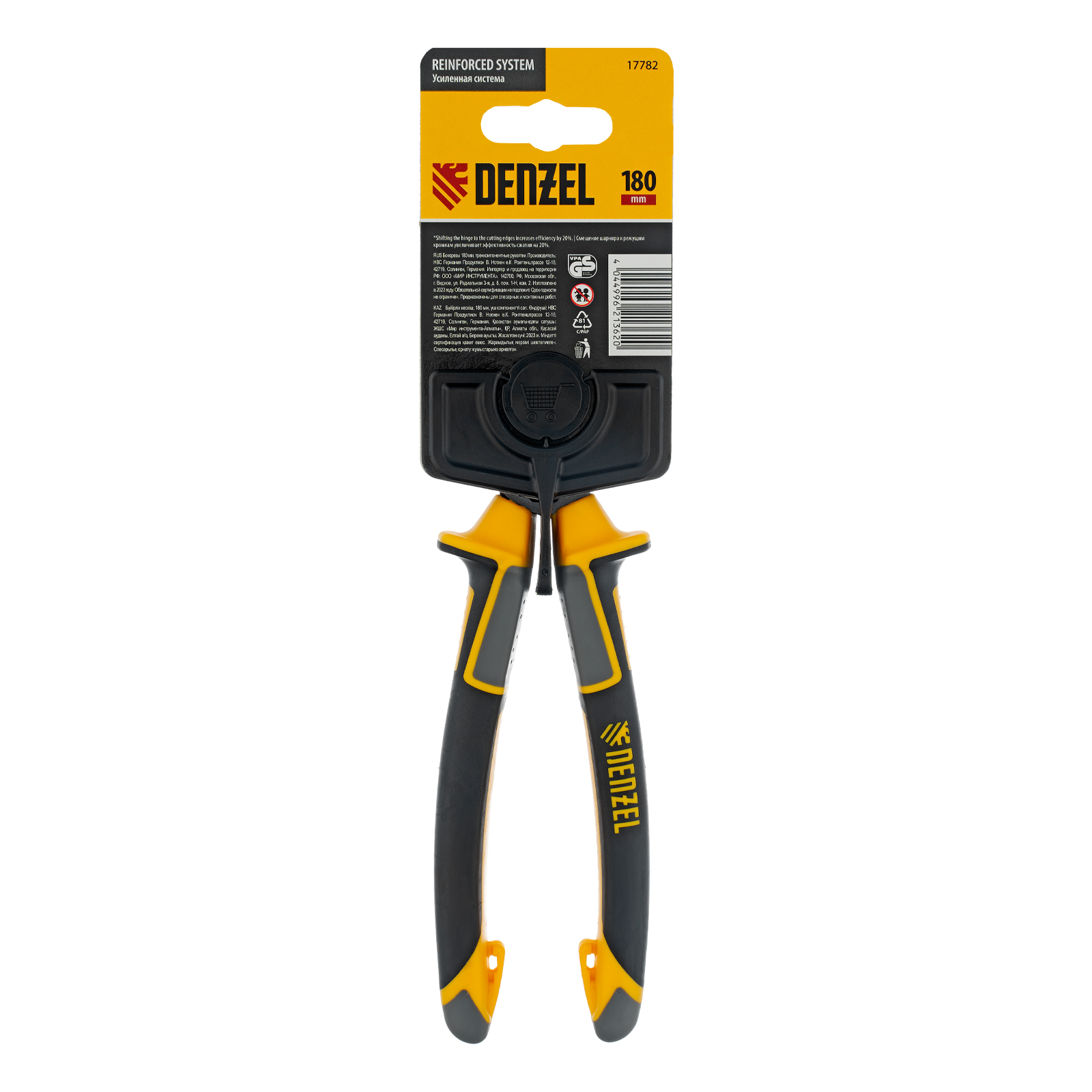 Бокорезы Denzel 17782 длиной 180 мм, с трехкомпонентными рукоятками, предназначены для разрезания кабелей из алюминия и меди, а также проволоки и стяжек. Максимальный диаметр перерезаемой мягкой проволоки (алюминиевой, медной, с пределом прочности 220 Н/мм2) составляет 7 мм, проволоки средней жесткости и гвоздей (750 Н/мм2) — 4 мм, жесткой (1800 Н/мм2) — 2,5 мм. Бокорезы используются для проведения слесарных и монтажных работ. Шарнир смещен к режущим кромкам, что позволяет сэкономить 20% усилий и максимально эффективно решать поставленные задачи.