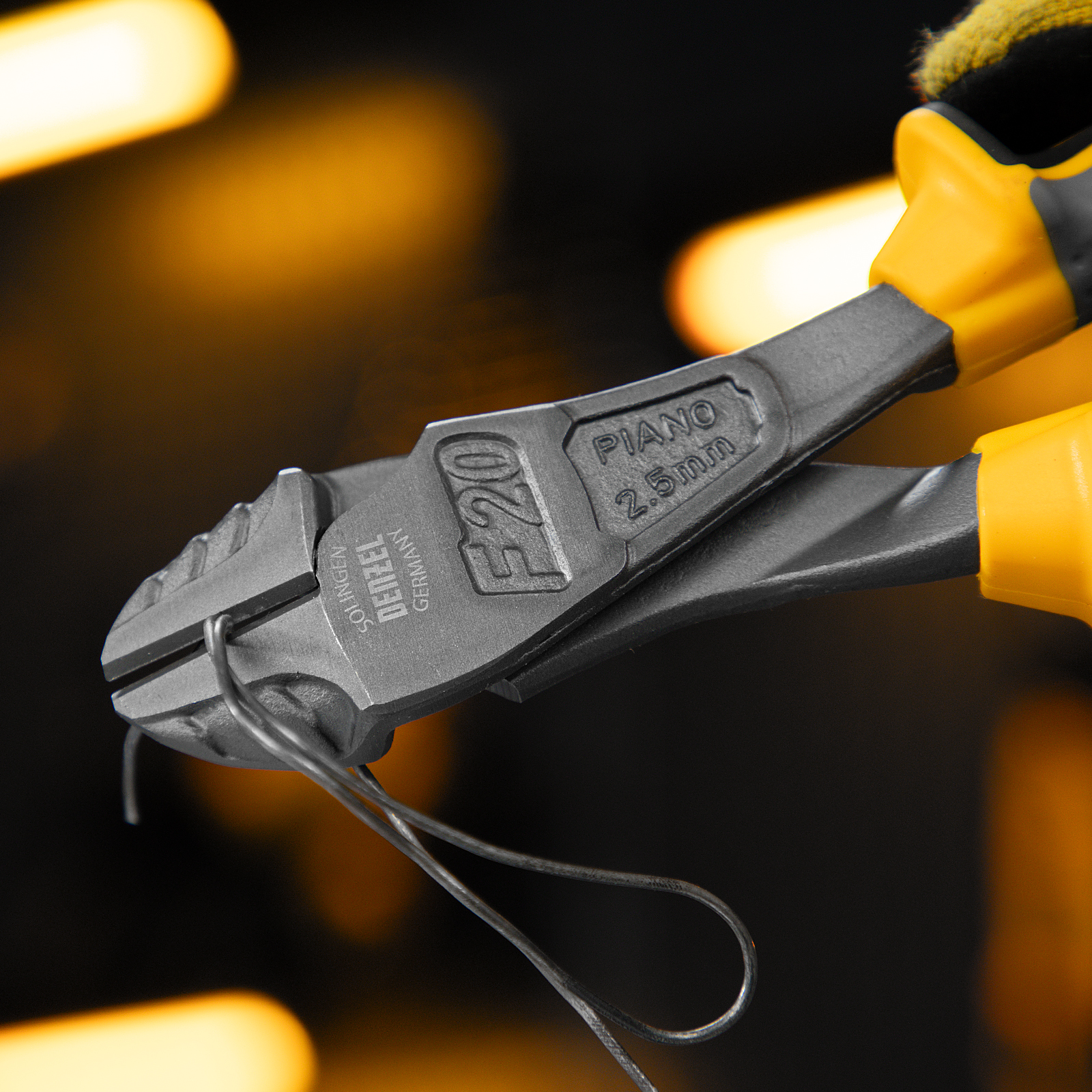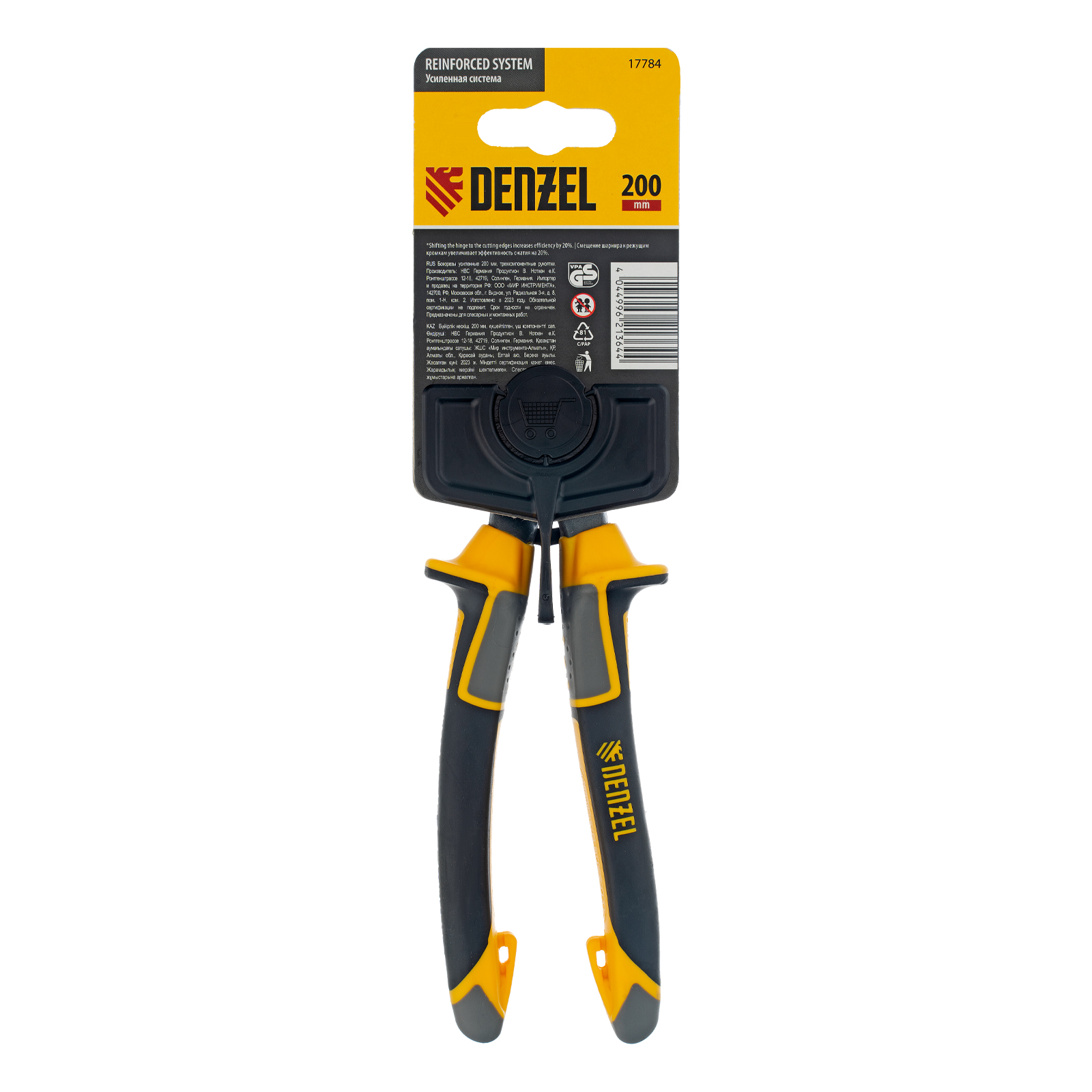 Усиленные бокорезы Denzel 17784 длиной 200 мм, с трехкомпонентными рукоятками, предназначены для разрезания кабелей, проводов, гвоздей и проволоки средней (750 Н/мм2) и высокой жесткости (1800 Н/мм2) диаметром 4 и 2,8 мм соответственно. Подходят для резки рояльных струн (предел прочности 2300 Н/мм2) диаметром до 2,5 мм. Успешно справляются не только с медными, алюминиевыми и пластмассовыми деталями, но и с более жесткими стальными элементами. Встроенный рычажный механизм и смещенный непосредственно к режущим кромкам шарнир увеличивают усилие реза на 20%.
