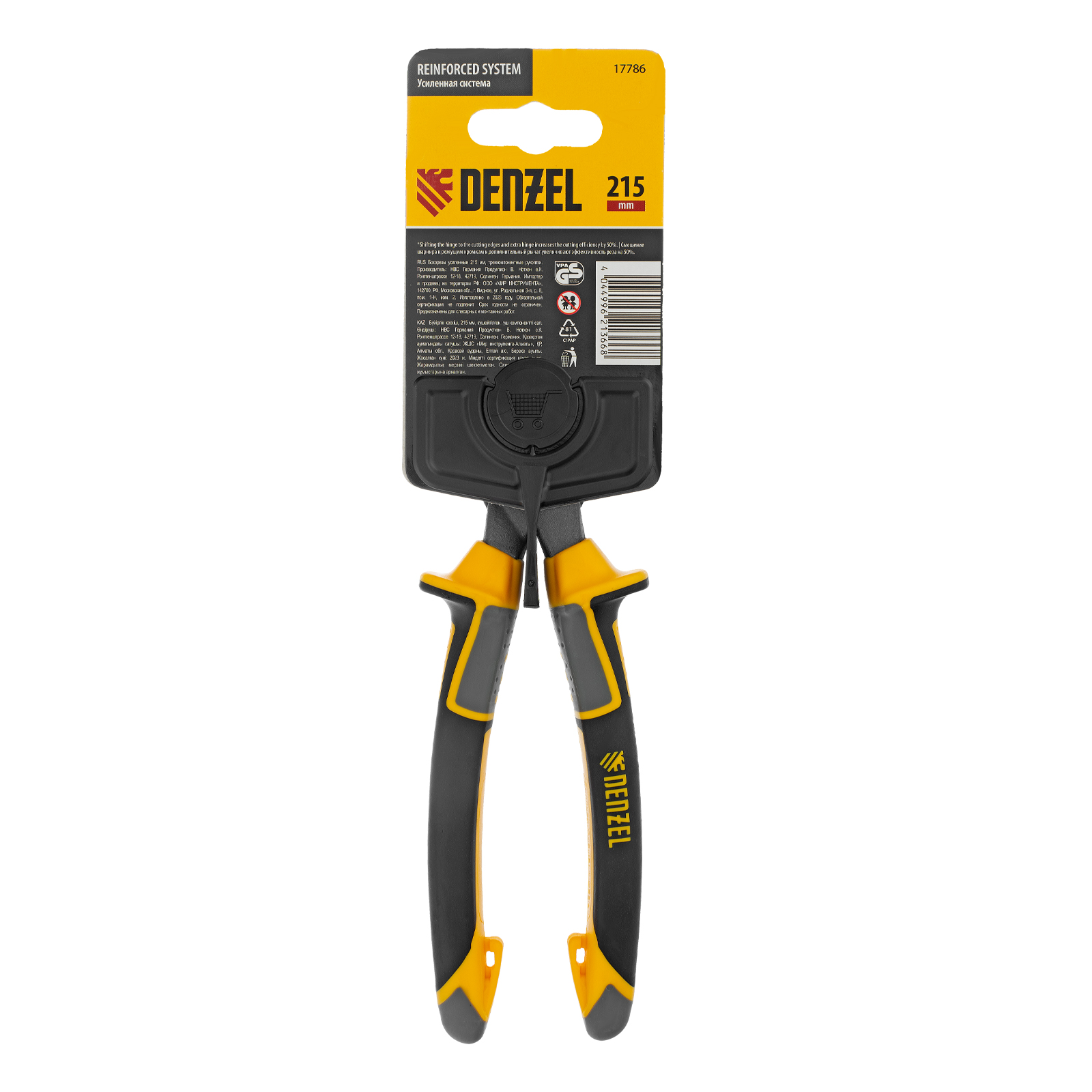 Усиленные бокорезы Denzel 17786 длиной 215 мм, с трехкомпонентными рукоятками, предназначены для разрезания кабелей, проводов, гвоздей и проволоки средней (750 Н/мм2) и высокой жесткости (1800 Н/мм2) диаметром 4,5 и 3,5 мм соответственно. Подходят для резки рояльных струн (предел прочности 2300 Н/мм2) диаметром до 3 мм. Успешно справляются не только с медными, алюминиевыми и пластмассовыми деталями, но и с более жесткими стальными элементами. Встроенный рычажный механизм и смещенный непосредственно к режущим кромкам шарнир увеличивают усилие реза на 50%.