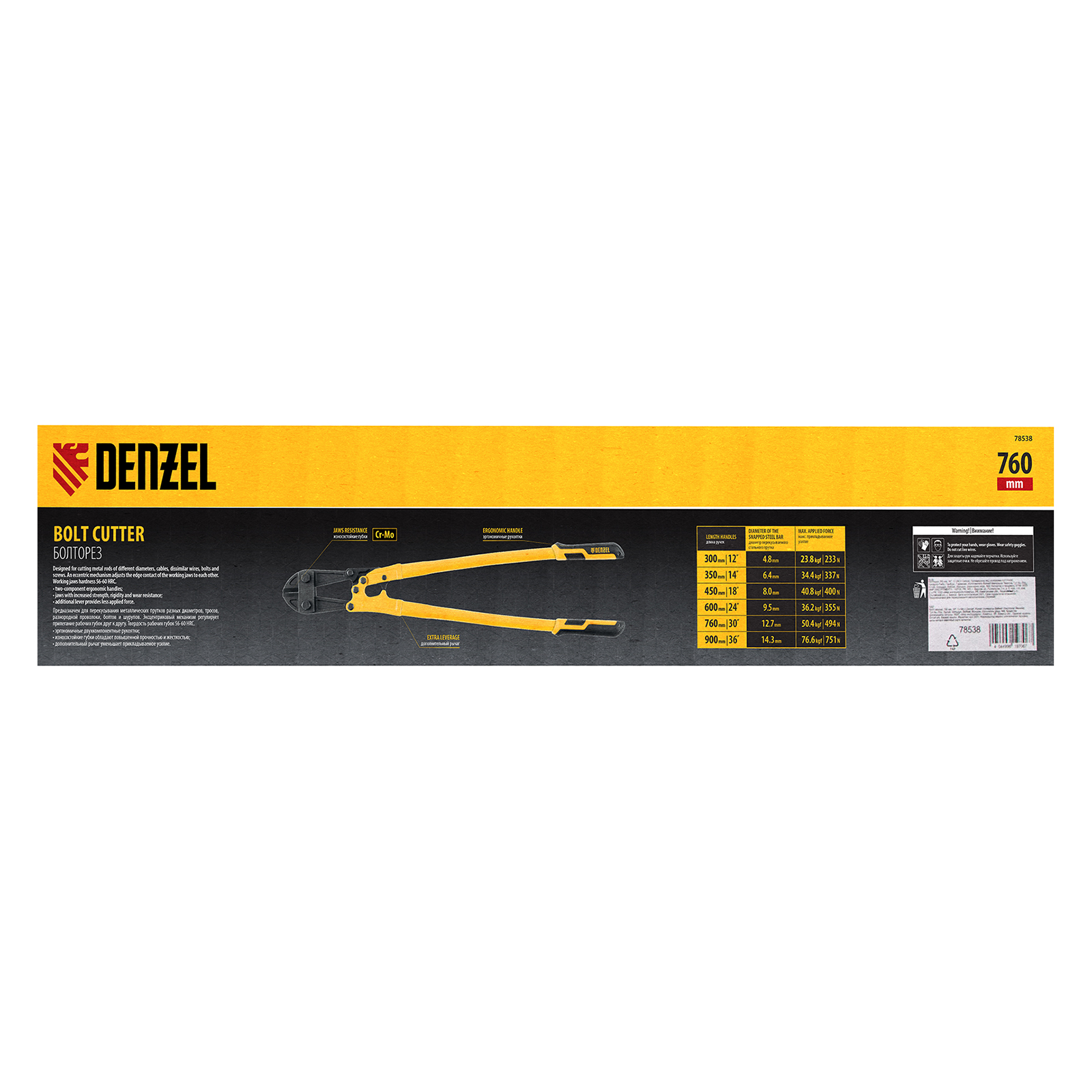 Болторез Denzel 78538 длиной 760 мм (30 дюймов), из стали Cr-Mo, предназначен для перекусывания стальных прутков диаметром 12,7 мм, болтов и шурупов, тросов, разнородной проволоки.