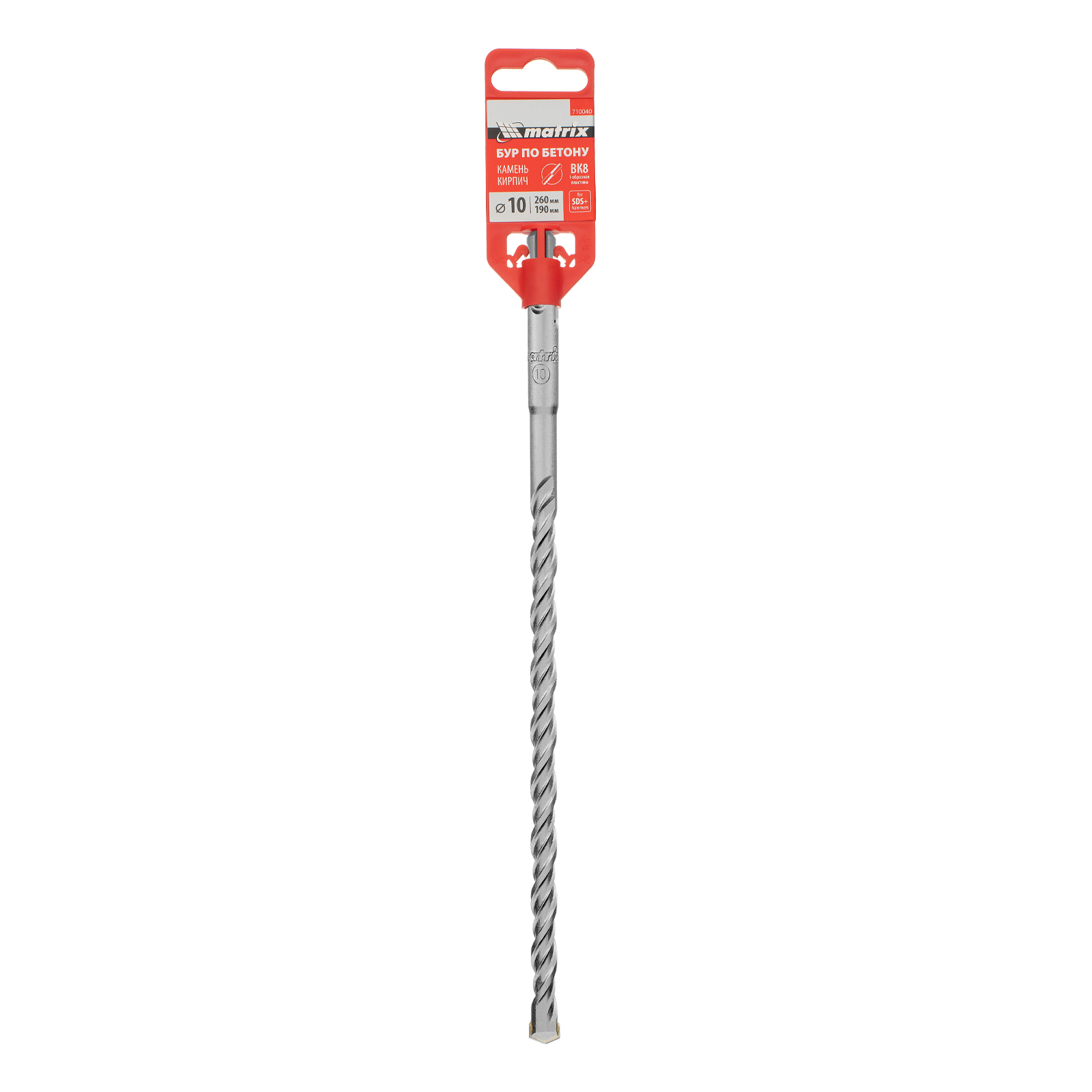 Бур по бетону Matrix 710040 длиной 260 мм, с хвостовиком SDS-plus, предназначен для установки на перфоратор и получения отверстий диаметром 10 мм в бетоне, камне и кирпиче. Позволяет эффективно решать поставленные задачи благодаря режущей пластине из высокотвердого сплава карбида вольфрама ВК8 твердостью 80-90 HRC.
