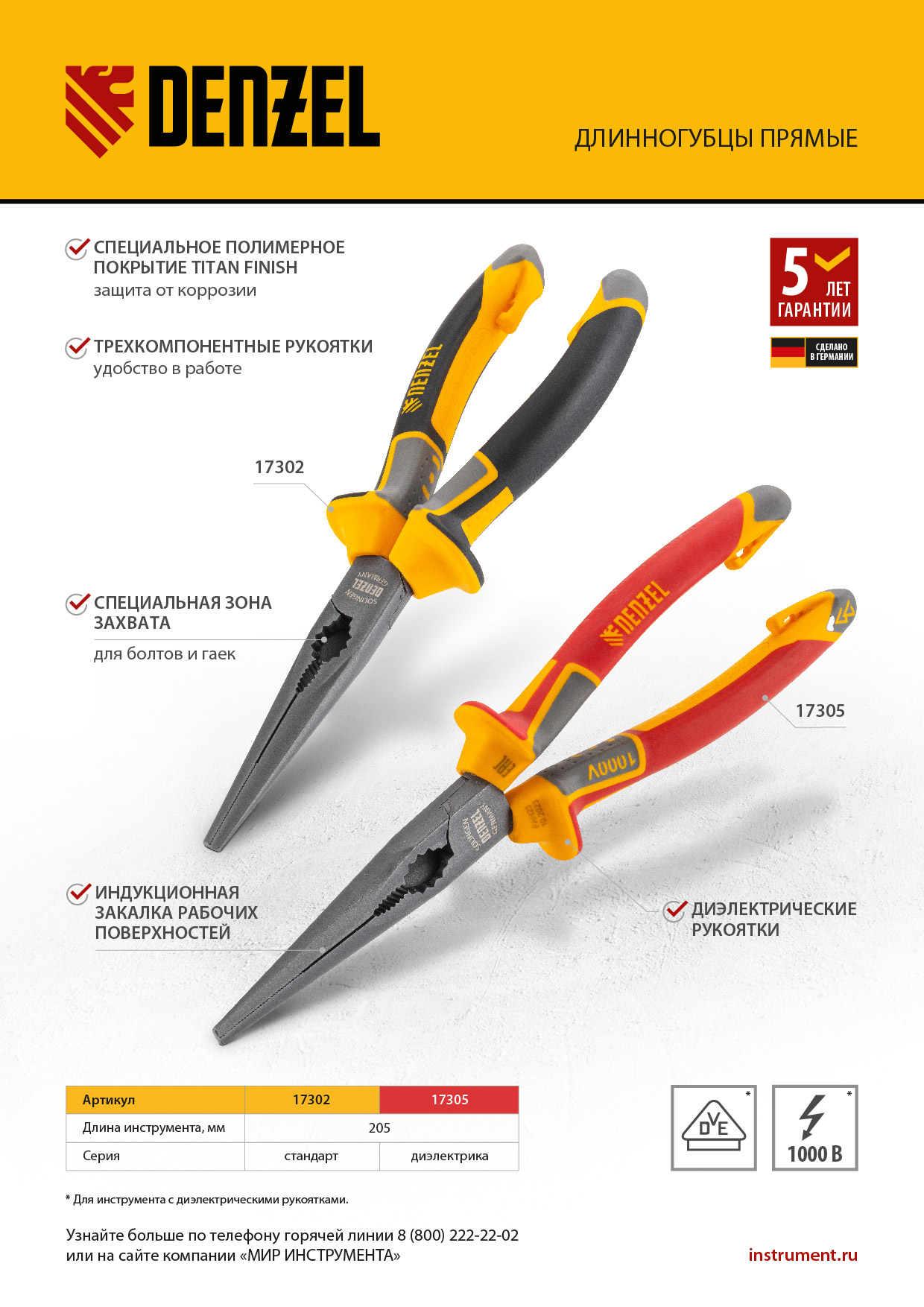 Длинногубцы прямые 205 мм, трехкомпонентные рукоятки Denzel в Краснодаре