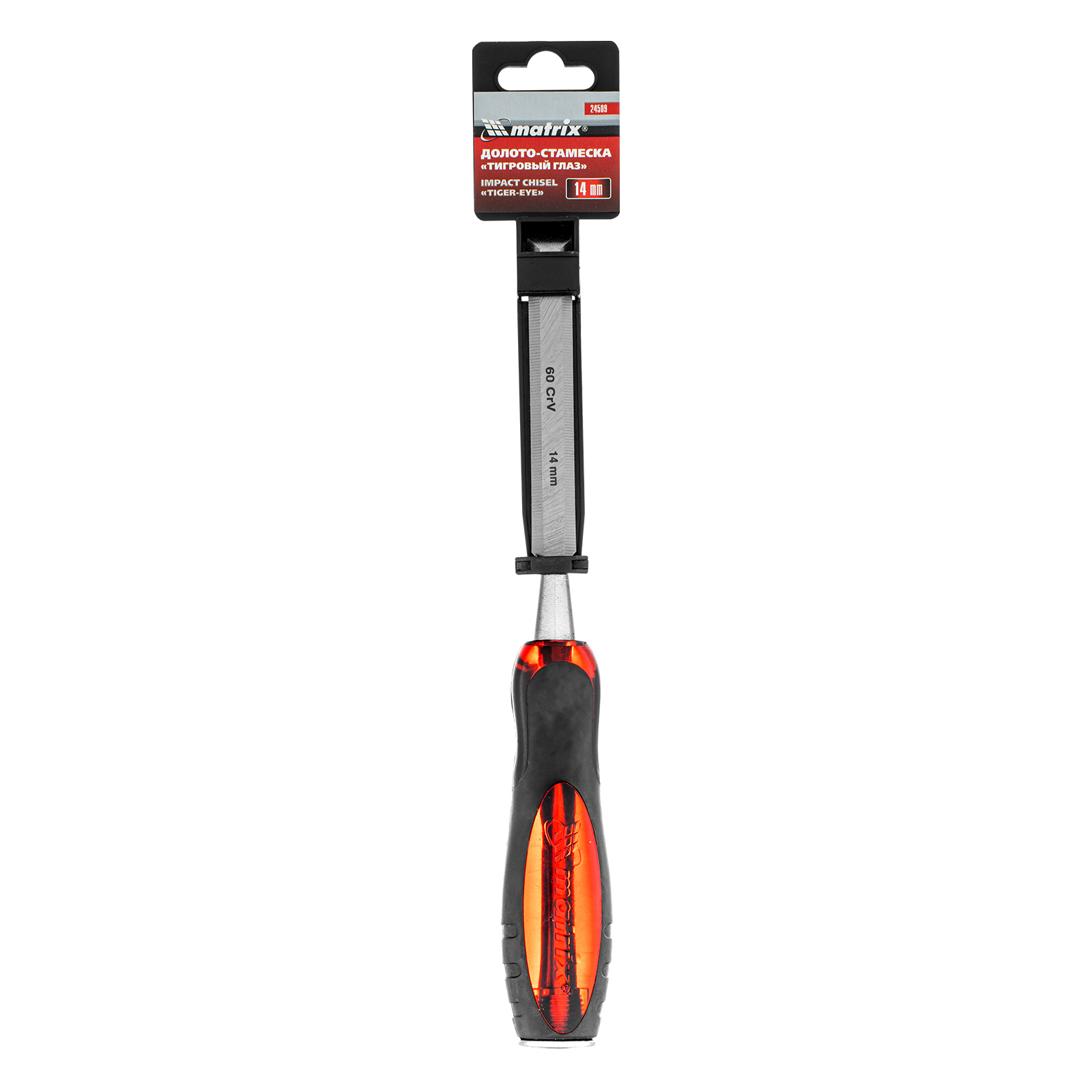 Долото-стамеска Matrix «Тигровый глаз» 24509 с полотном шириной 14 мм и двухкомпонентной обрезиненной рукояткой используется в столярном и плотницком деле, в производстве мебели. Позволяет вырезать углубления, формировать пазы, зачищать шипы и гнезда, снимать фаски. Инструмент выдерживает удары киянкой или молотком, т. к. металлический затыльник защищает его от деформации. Долото относится к профессиональному ручному инструменту, но может применяться и в домашних условиях.