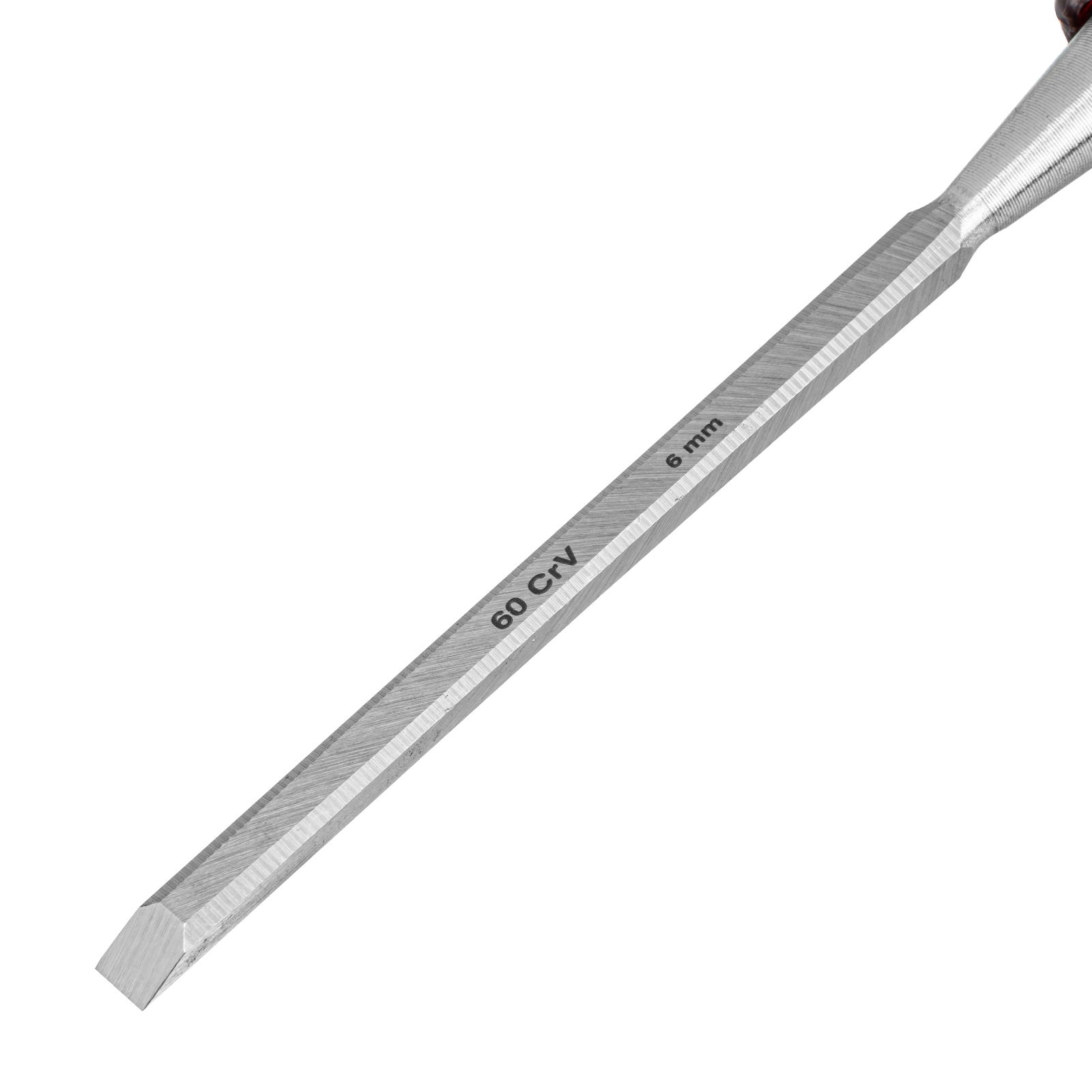- Длительное сохранение режущих свойств — долото-стамеска обладает твердостью 65 HRC (0,7 длины рабочей части полотна), острое, как бритва, лезвие обработано на заводе под углом 20-35°, повторная заточка потребуется минимум через 6 месяцев.