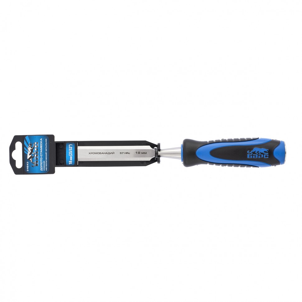 Плоское долото-стамеска Барс 24643 с шириной режущей части 18 мм, с двухкомпонентной рукояткой и металлическим затыльником, предназначено для выборки прямоугольных пазов, снятия фасок, обработки шиповых соединений и выполнения других столярно-плотницких работ. Используется для работы с массивом дерева любой твердости. По затыльнику рукоятки можно наносить удары киянкой или небольшим молотком, поэтому инструмент легко погружается в древесину и обеспечивает аккуратный ровный контур среза.