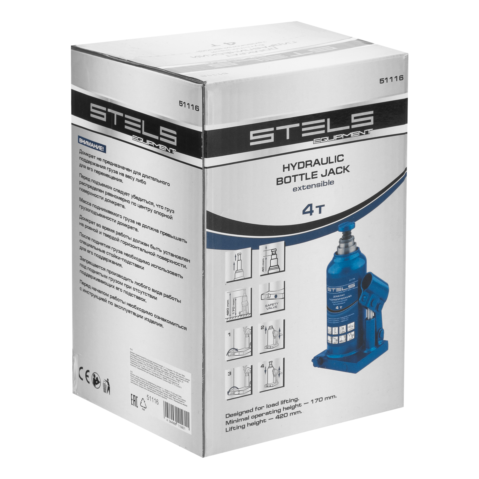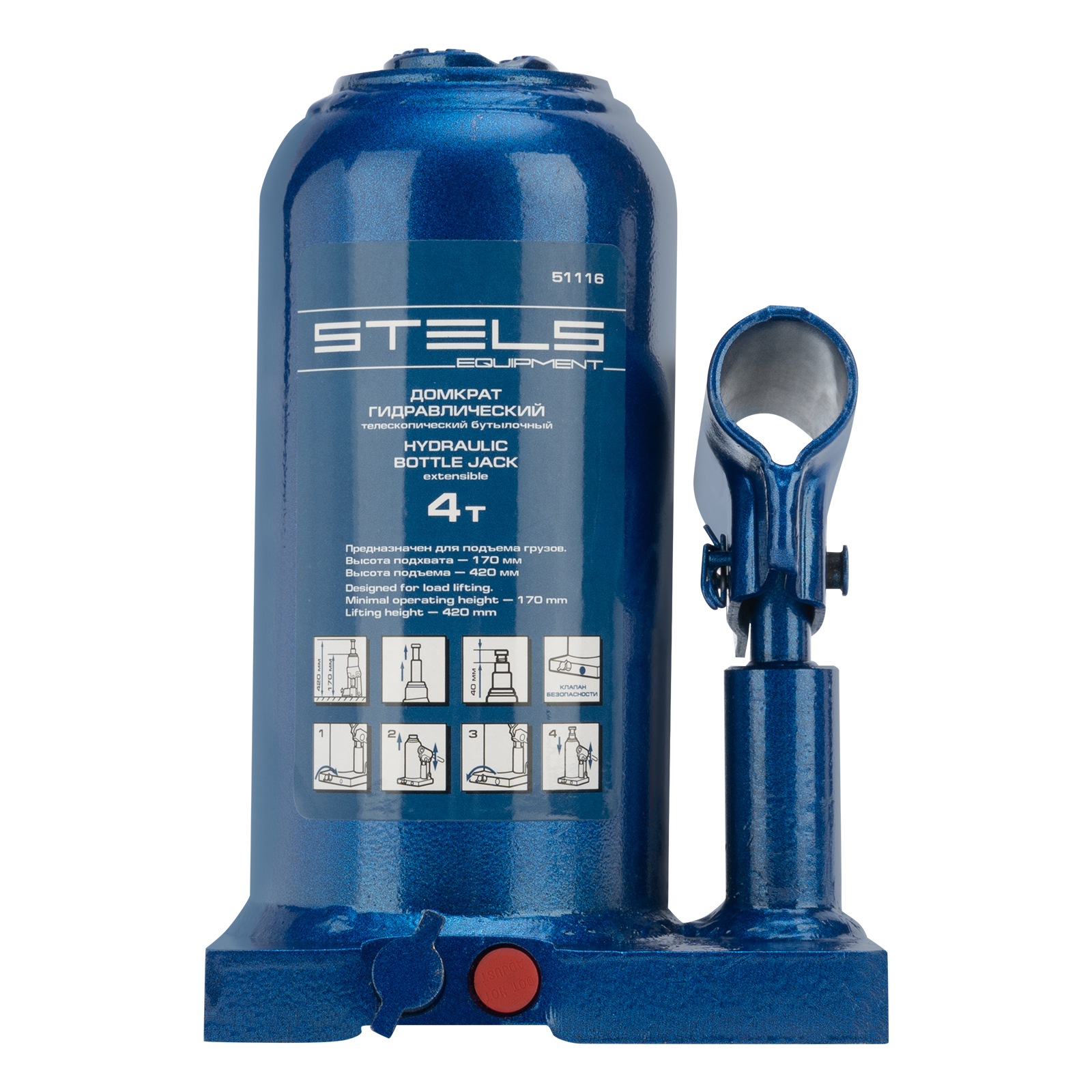 Гидравлический бутылочный телескопический домкрат Stels 51116 используется для поднятия грузов весом до 4 т с на высоту 170-420 мм. Не требует больших усилий и оптимален для автомобилей с большим клиренсом. Домкрат можно использовать в гараже для самостоятельного ремонта машины или в автосервисе для решения профессиональных задач.