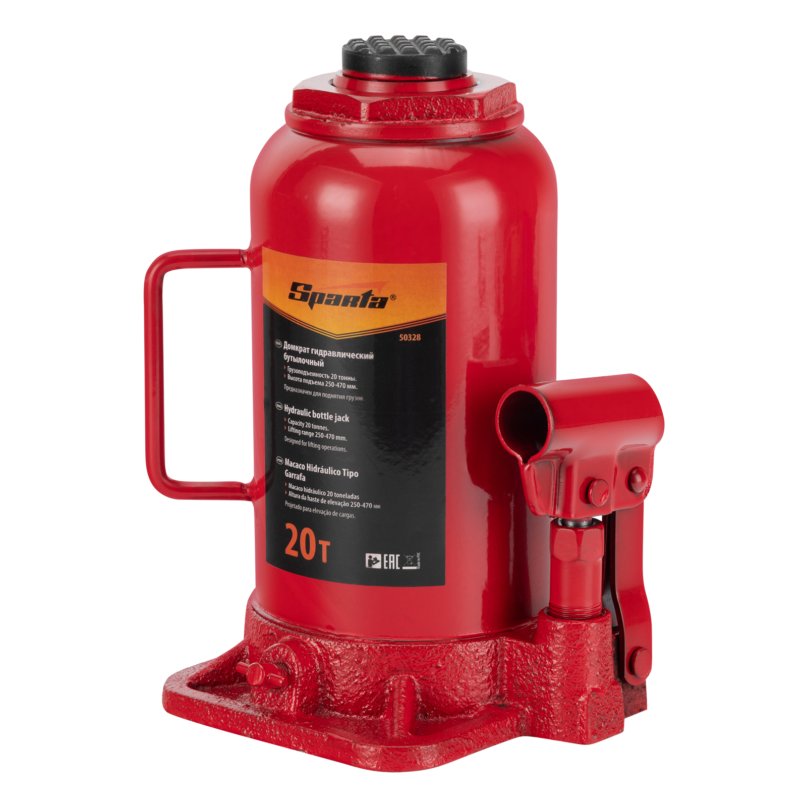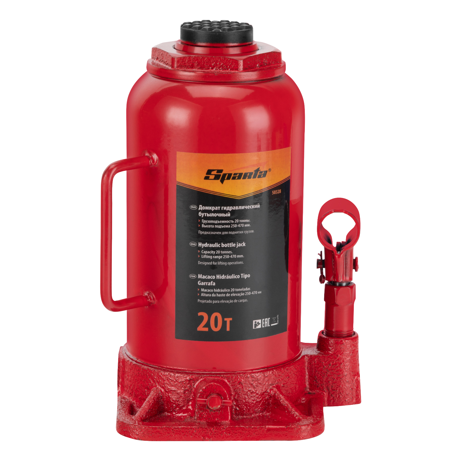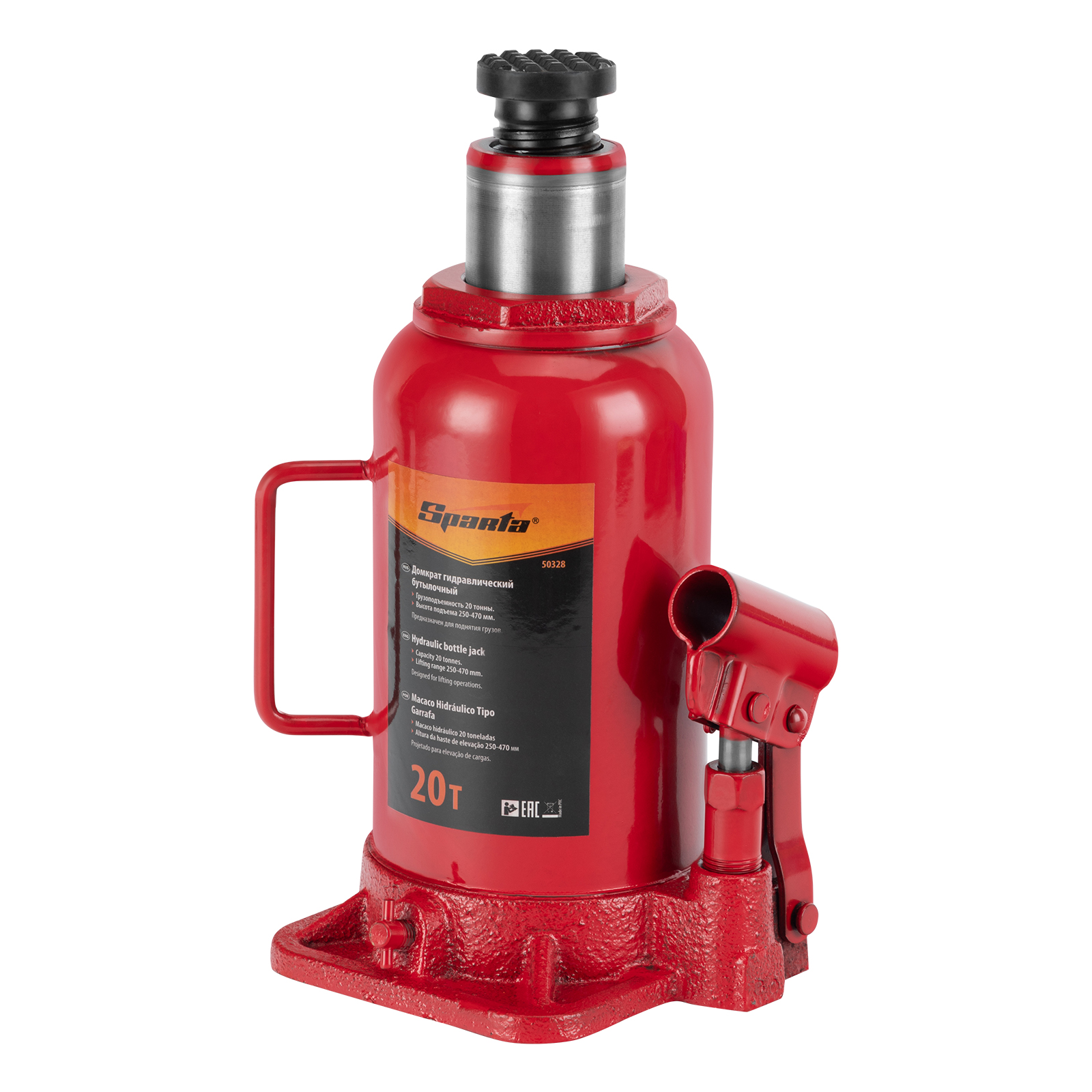 Гидравлический бутылочный домкрат Sparta 50328 рассчитан на подъем грузов весом до 20 т на высоту от 250 до 470 мм. Он пригодится как автолюбителям в гараже, так и профессиональным мастерам в автосервисах. Домкрат обеспечивает плавный подъем груза без особых усилий со стороны пользователя.