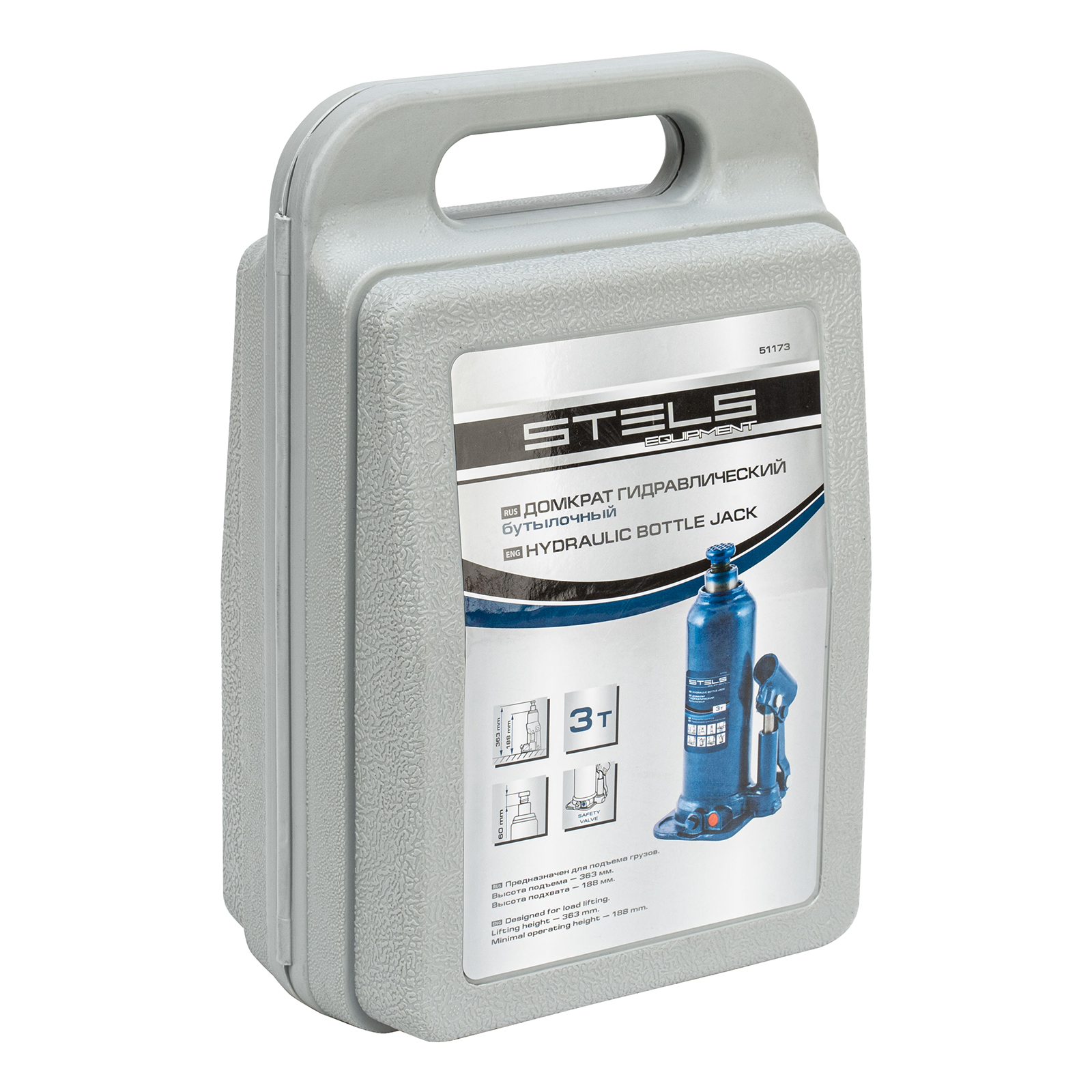 Гидравлический бутылочный домкрат Stels 51173 в пластиковом кейсе предназначен для поднятия грузов весом до 3 т на высоту 188-363 мм. Он не занимает много места и легко помещается в багажник, поэтому его можно брать с собой в дорогу или хранить в гараже. Используется для самостоятельного ремонта авто, также подходит для профессионального применения на станциях технического обслуживания.