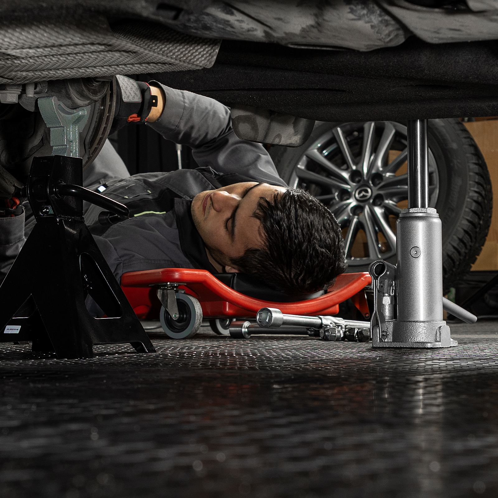 - Удобное хранение и транспортировка — домкрат поставляется в прочном пластиковом кейсе с ручкой.
