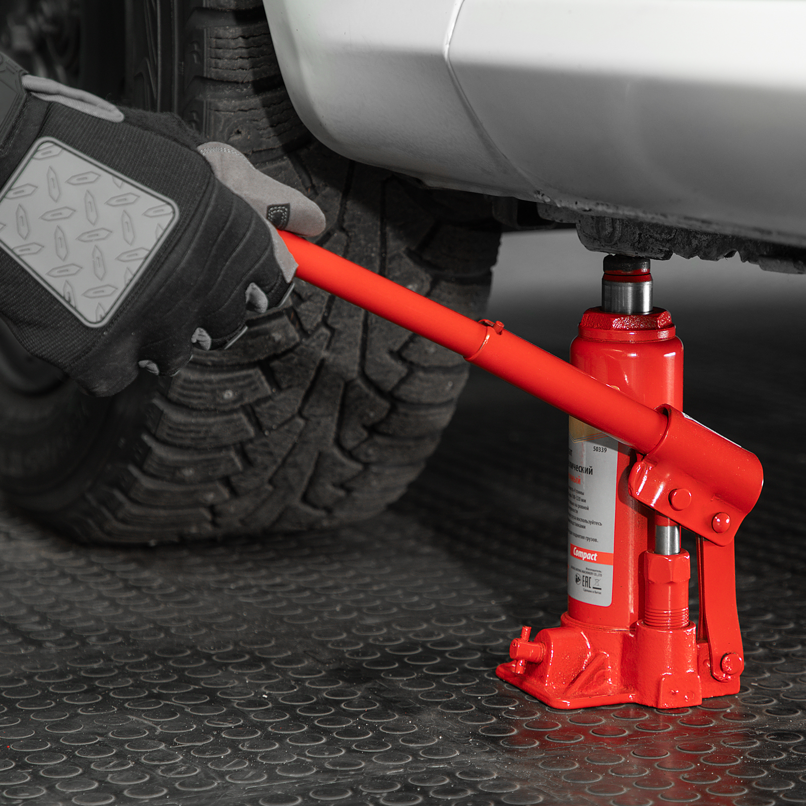 - Удобное хранение и транспортировка — домкрат весит всего 2,4 кг, а благодаря съемному рычагу не занимает много места.
