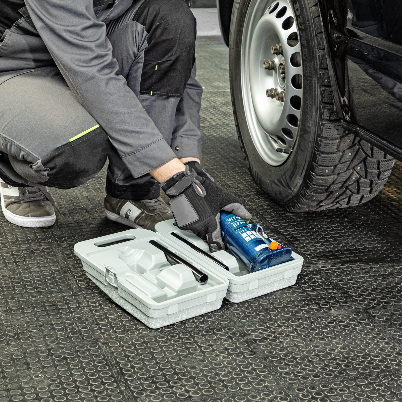 - Удобное хранение и транспортировка — домкрат поставляется в пластиковом кейсе.