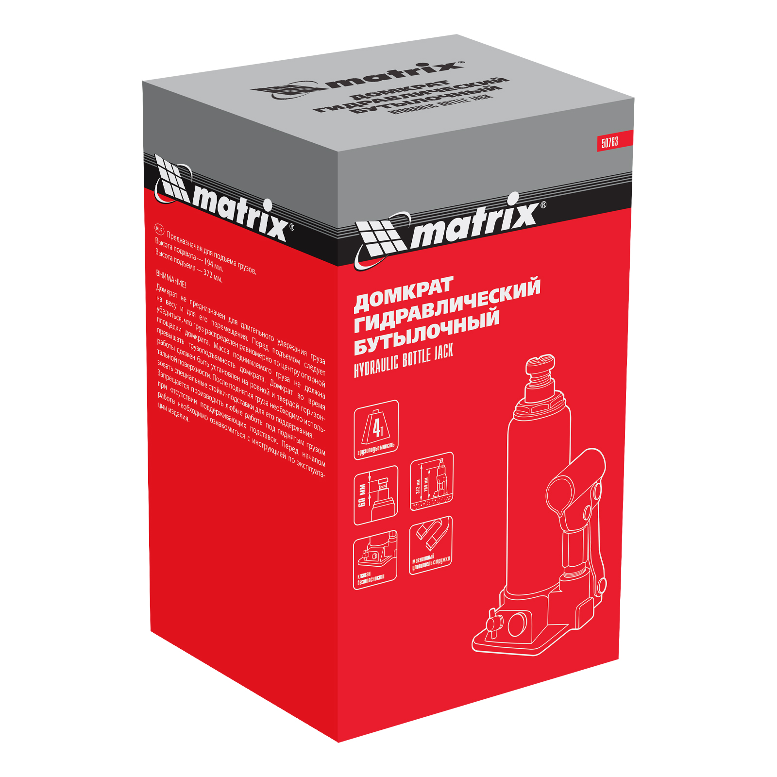Гидравлический бутылочный домкрат Matrix 50763 предназначен для быстрого поднятия грузов массой до 4 т на высоту 194-372 мм. Будет полезен автолюбителям и мастерам СТО в качестве полупрофессионального инструмента. Встроенный магнитный уловитель металлической стружки защищает резиновые уплотнители от повреждений.