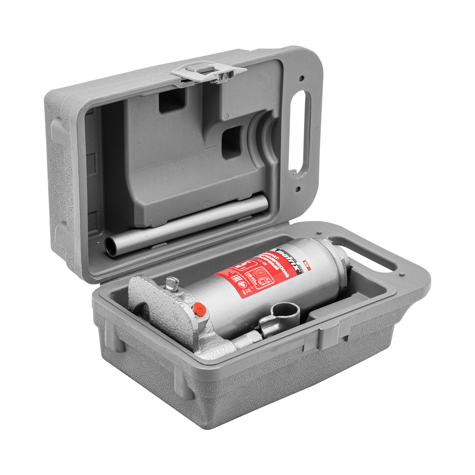 - Удобное хранение и транспортировка — домкрат поставляется в прочном пластиковом кейсе с ручкой.