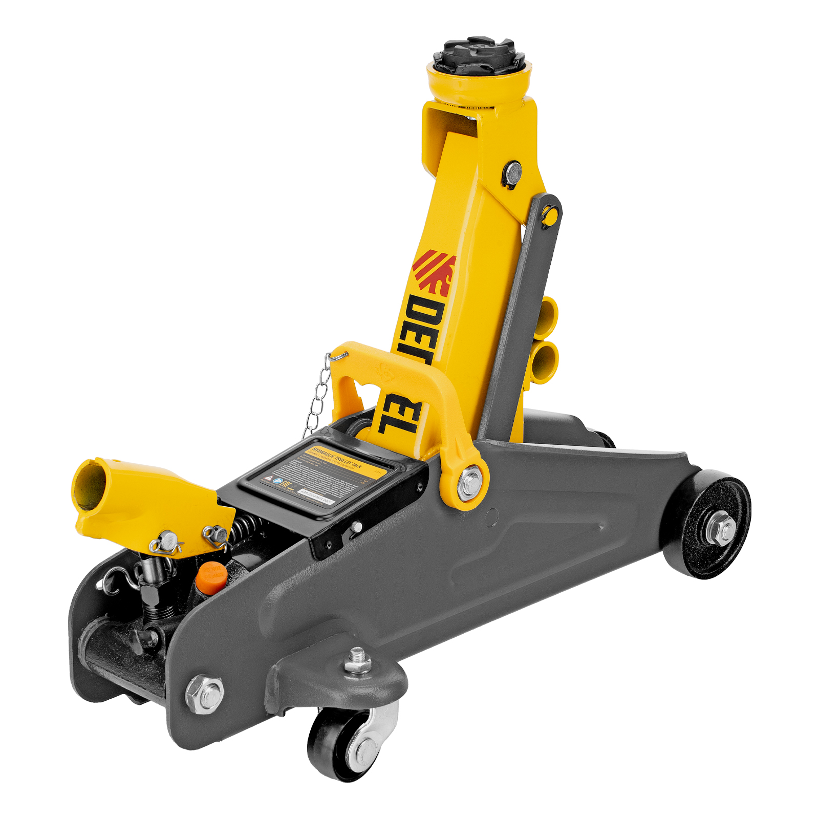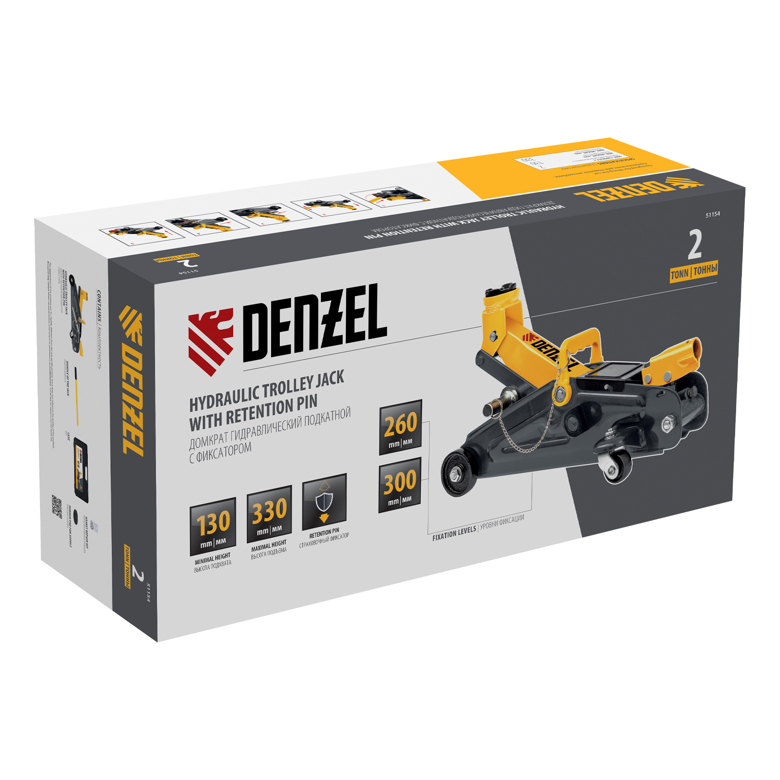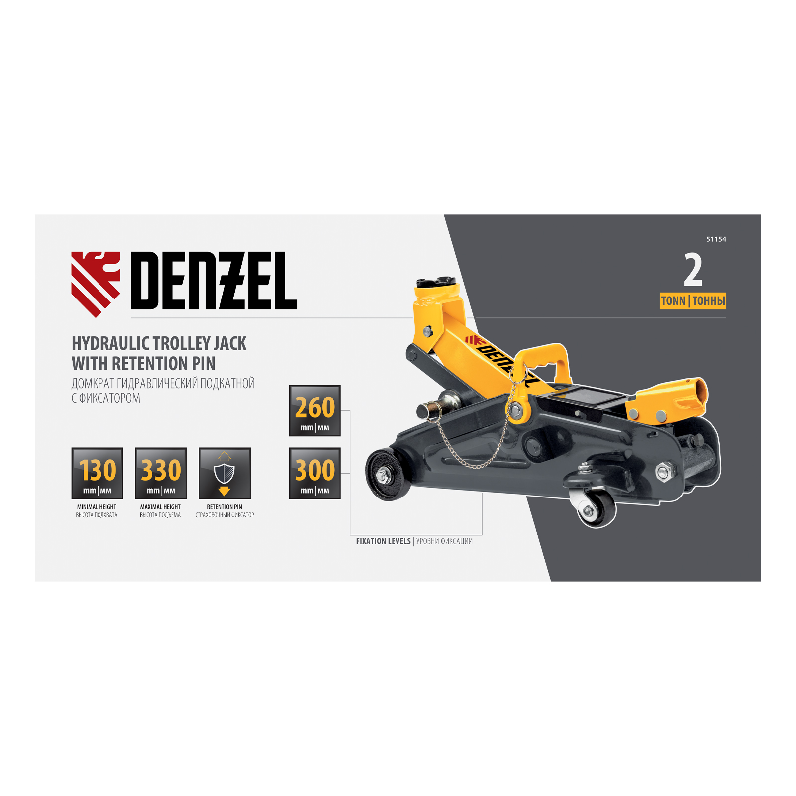 Гидравлический подкатной домкрат с фиксатором Denzel 51154, с высотой подхвата 130 мм, предназначен для плавного подъема грузов массой до 2 т на высоту до 330 мм. Страховочный штифт позволяет фиксировать подъемный рычаг на высоте 260 и 300 мм для безопасной работы. Домкрат пригодится владельцам легковых автомобилей со стандартным клиренсом.