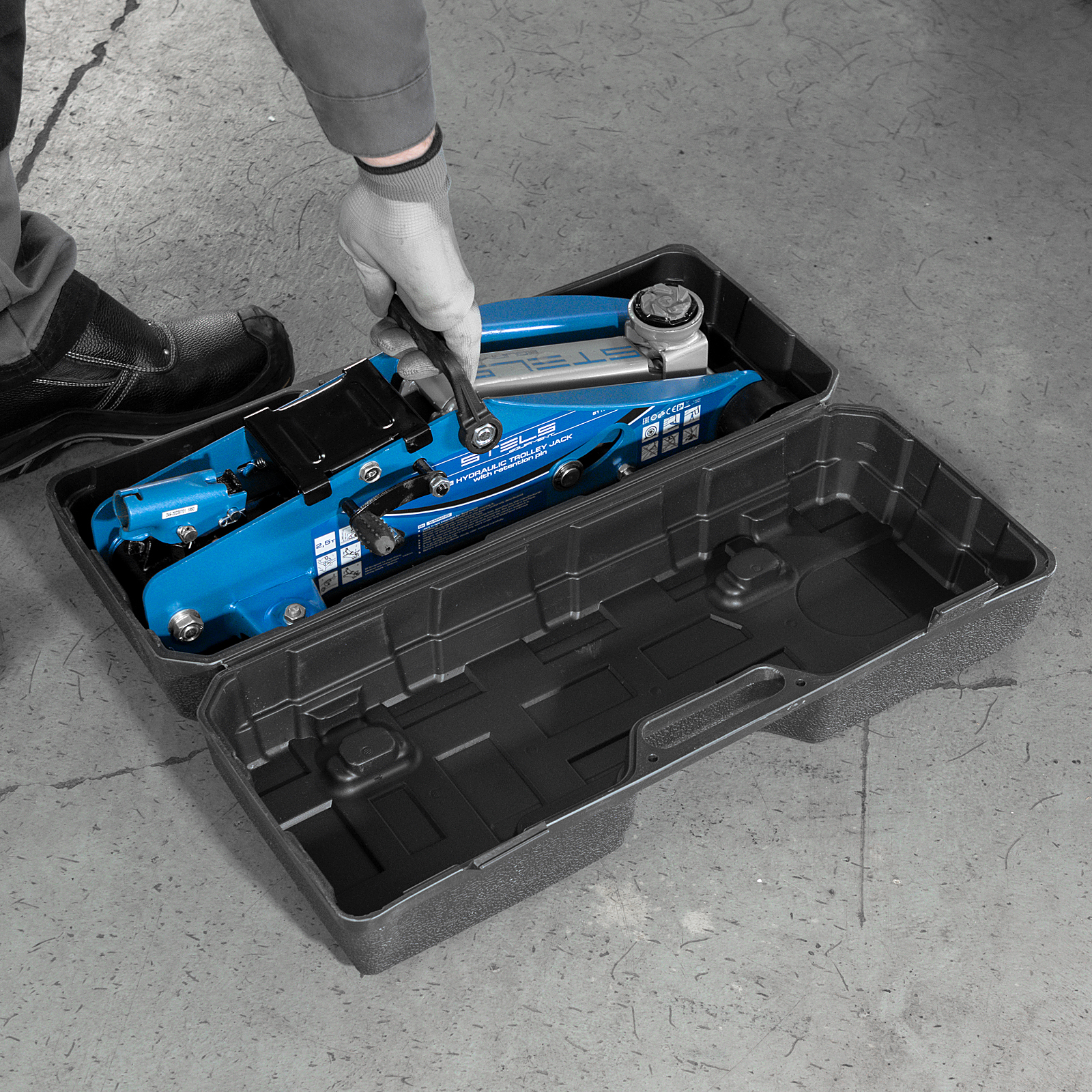- Удобное хранение и транспортировка — домкрат поставляется в прочном пластиковом кейсе.