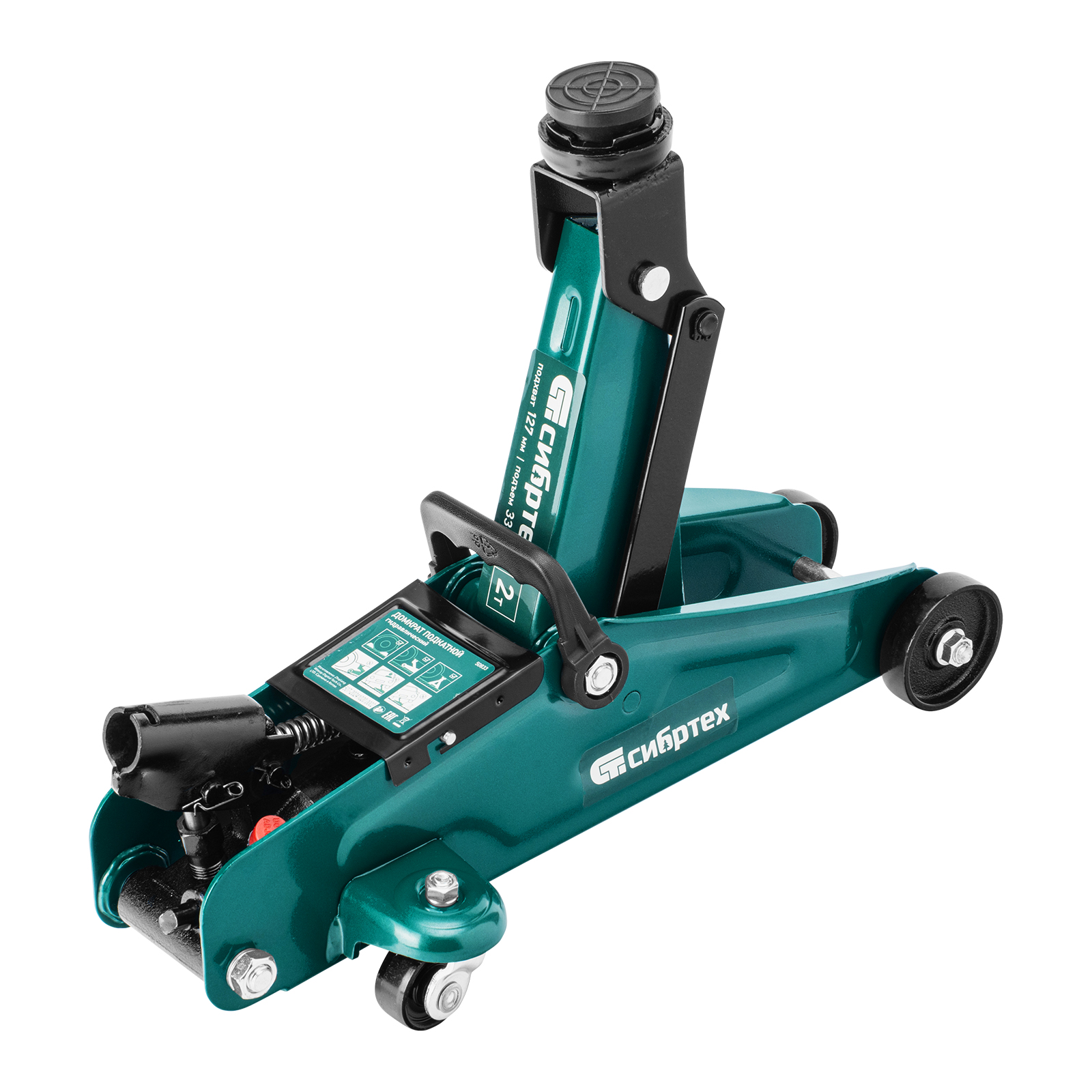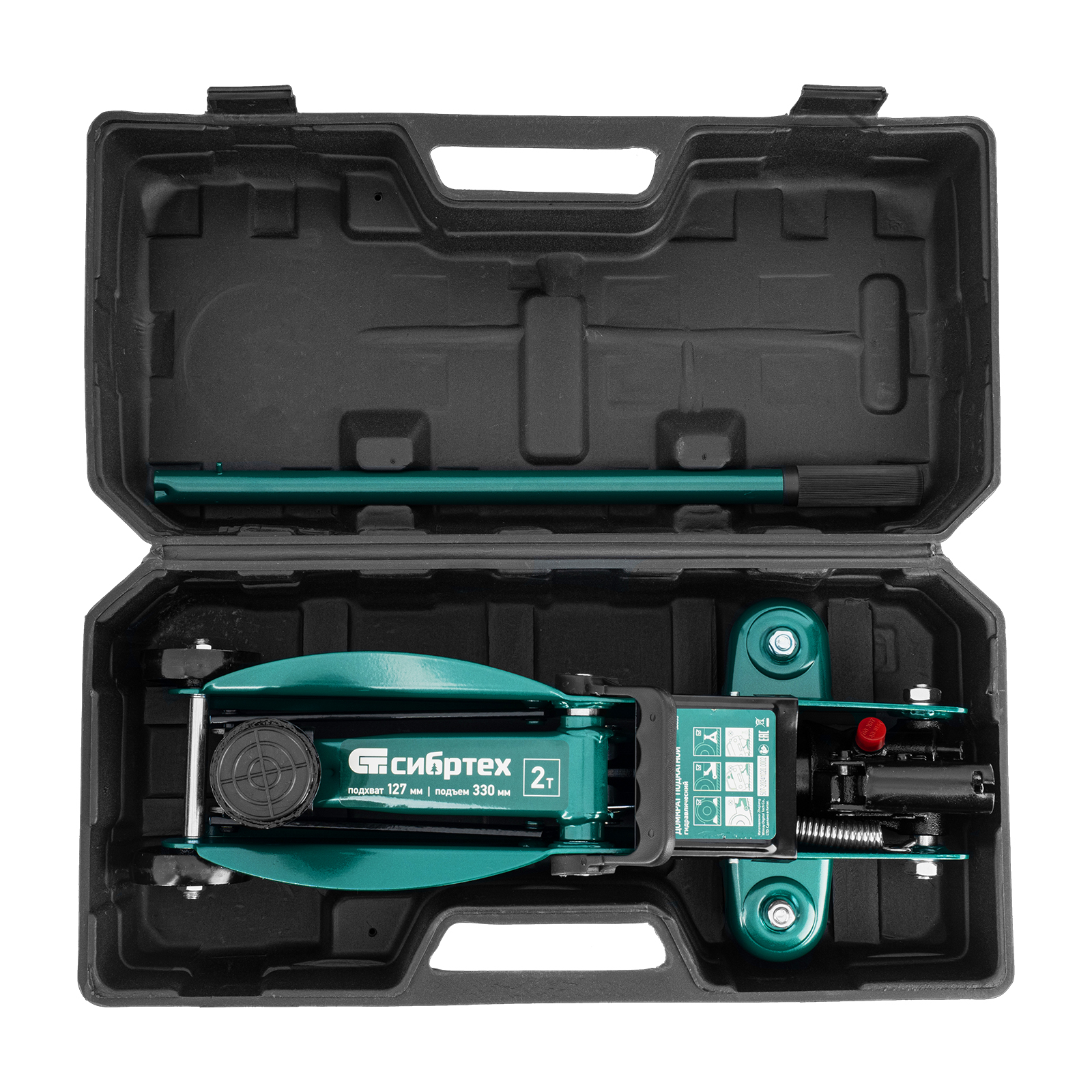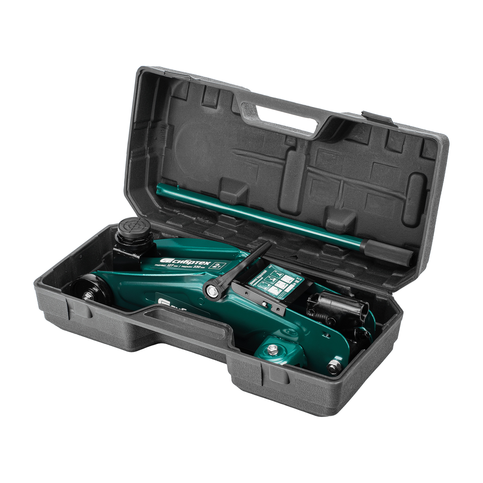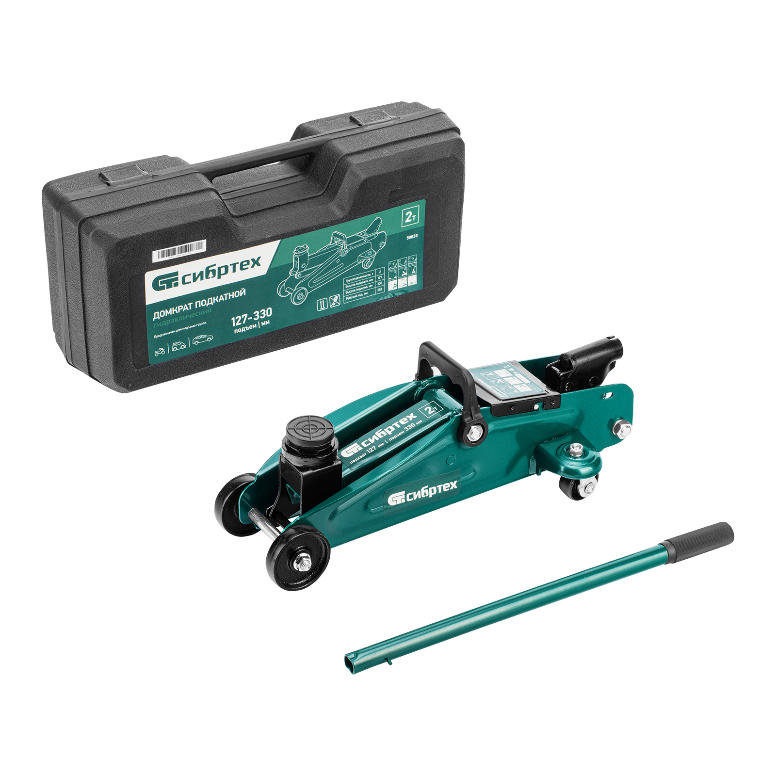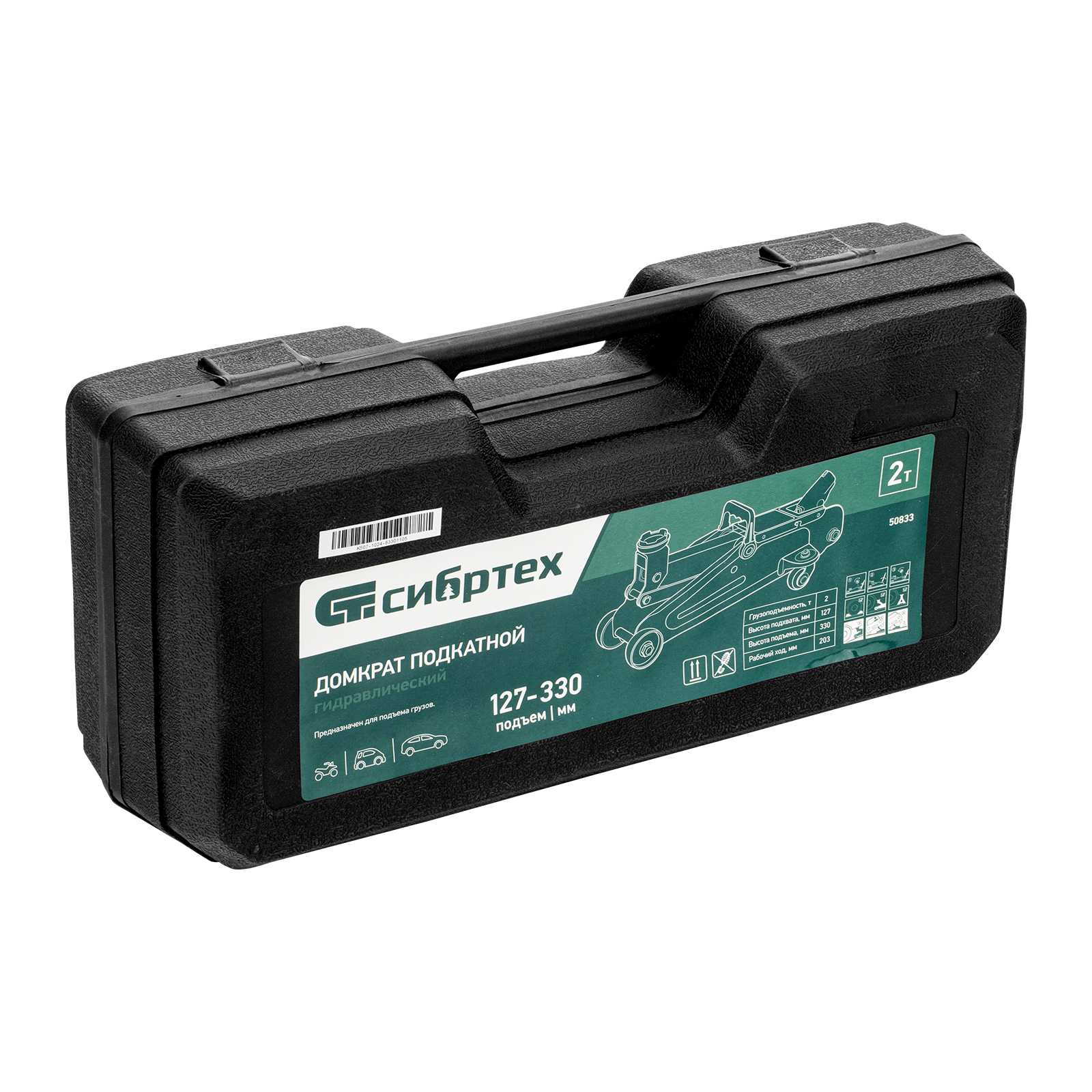 Гидравлический подкатной домкрат Сибртех 50833, поставляющийся в пластиковом кейсе, с высотой подхвата 127 мм, предназначен для подъема грузов массой до 2 т на высоту до 330 мм. Применяется для обслуживания автомобилей со стандартным клиренсом. Компактный домкрат подходит для самостоятельного использования автовладельцами.