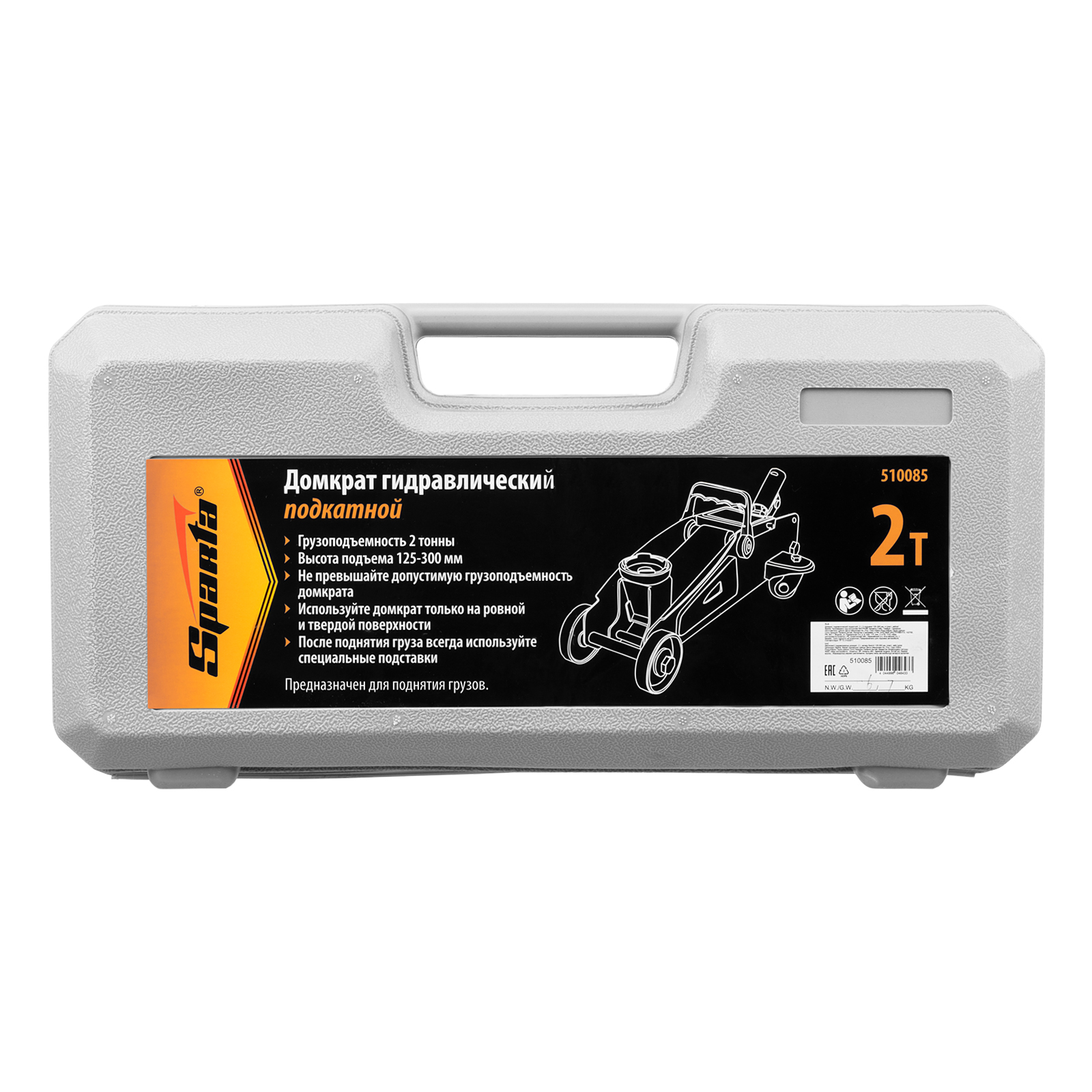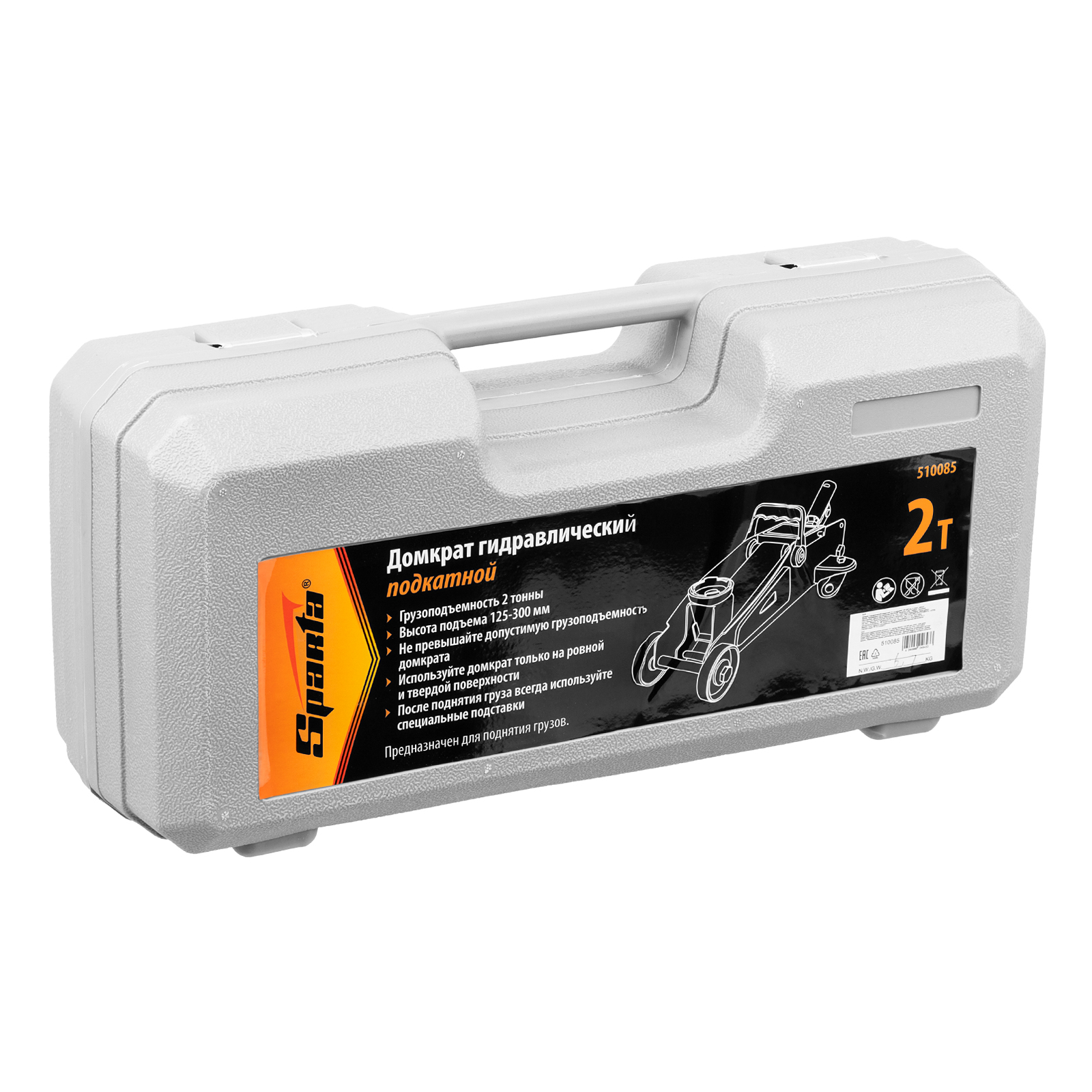 Домкрат гидравлический подкатной Sparta 510085 с высотой подъема 125 мм, в пластиковом кейсе, используется для подъема автомобилей массой до 2 тонн на высоту до 300 мм для их ремонта и обслуживания. Подходит для автомашин со стандартным клиренсом. Надежная конструкция станины обеспечивает прочность и долговечность оборудования. Домкрат входит в оснащение гаражей и автосервисов.