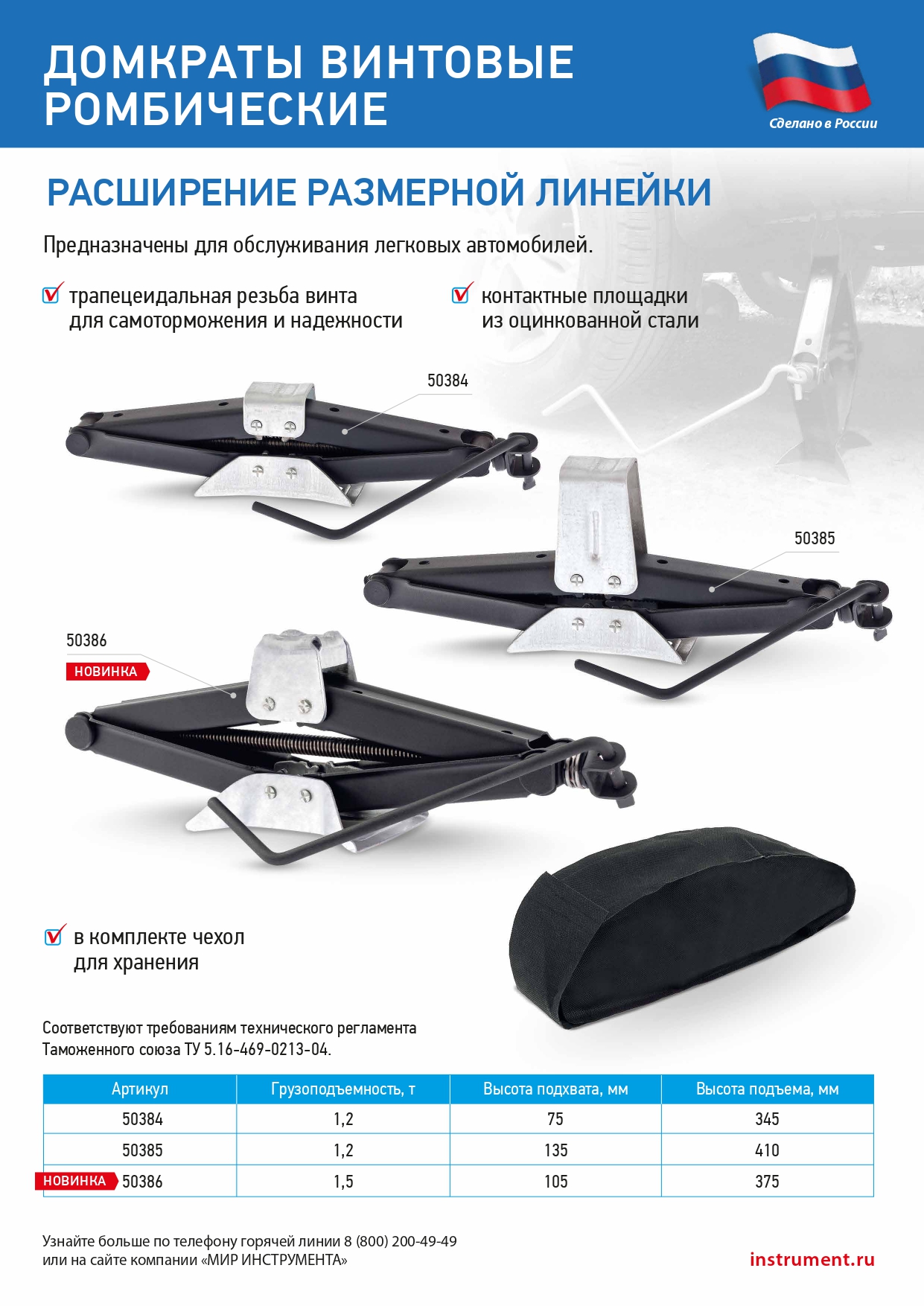 Универсальный винтовой ромбический домкрат 50384 соответствует ТУ 5.16-469-0213-04 и предназначен для обслуживания легковых автомобилей массой не более 1,2т и подъема их на высоту 75-345 мм. Благодаря небольшой высоте подхвата домкрат для машин с низким клиренсом. Он приводится в действие посредством простого и надежного винтового механизма. Будет полезен в гараже, пригодится также и в дороге.