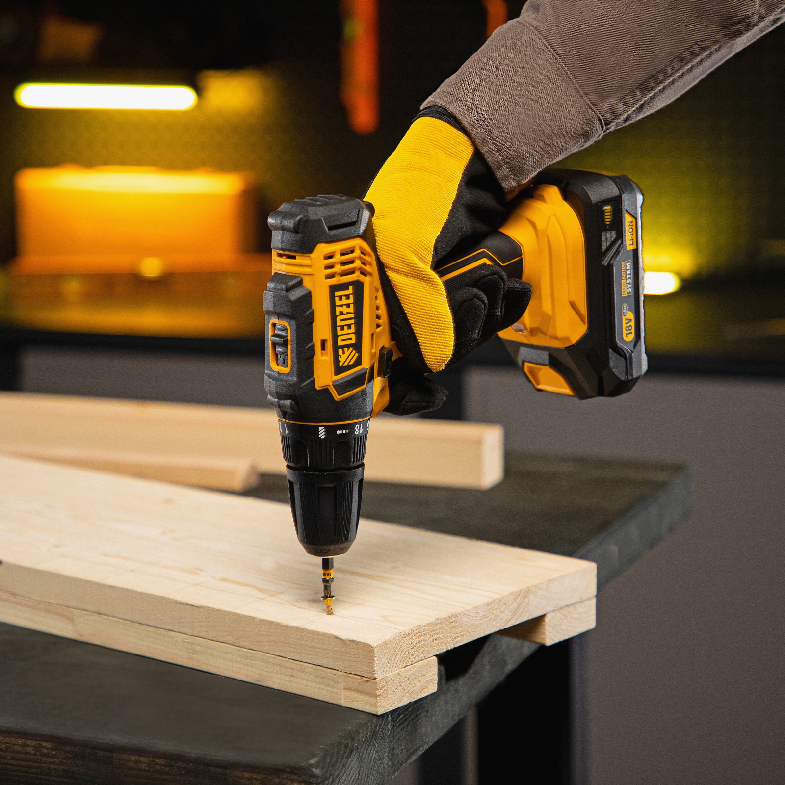 - Универсальность — дрель-шуруповерт совместима с любым Li-Ion аккумулятором единой платформы Denzel Battery System 18V.