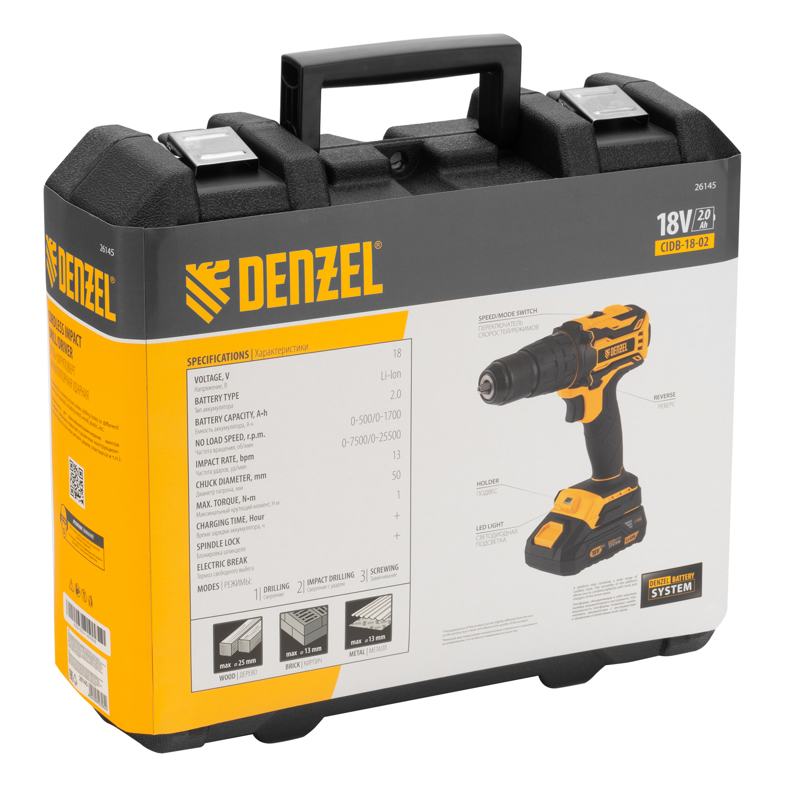 Ударная аккумуляторная дрель-шуруповерт Denzel CIDB-18-02 26145 с бесщеточным двигателем поставляется с 2 аккумуляторами Li-Ion емкостью 2 А·ч, с рабочим напряжением 18 В. Позволяет закручивать и откручивать резьбовый крепеж, а также сверлить отверстия в твердых материалах. Максимальная величина крутящего момента 50 Н·м обеспечивает высокую эффективность работы. Диаметр отверстий в древесине достигает 25 мм, металле — 13 мм, кирпиче — 8 мм. Благодаря ударной функции инструмент успешно справляется с туго затянутым и заржавевшим крепежом, а также со сверлением особо прочных материалов. Металлический патрон выдерживает высокие динамические нагрузки.