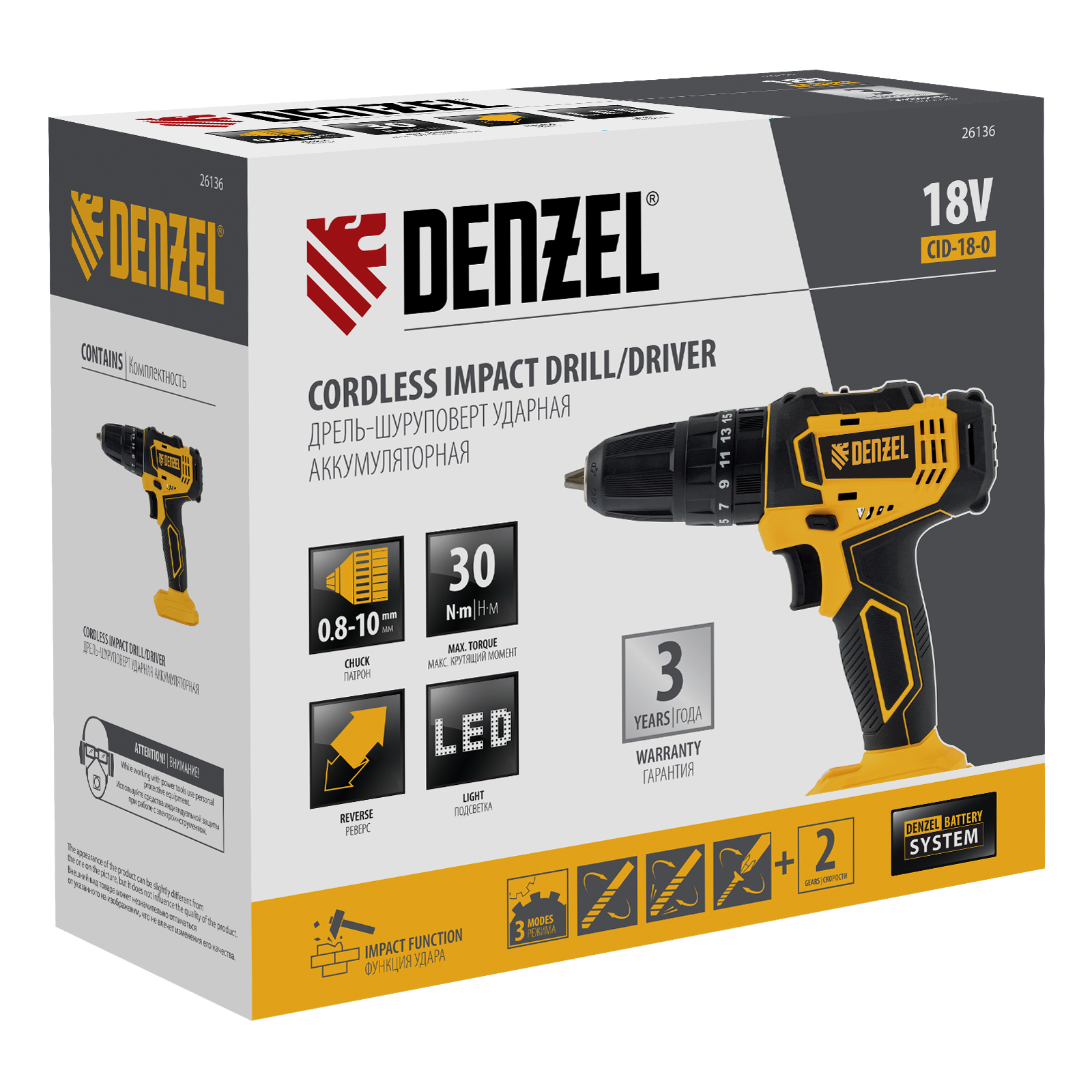 Ударная аккумуляторная дрель-шуруповерт Denzel CID-18-0 26136 работает от аккумулятора с рабочим напряжением 18 В и используется для сверления отверстий, а также монтажа и демонтажа резьбовых соединений. Инструмент развивает крутящий момент до 30 Н·м. Ударная функция позволяет справляться с перетянутым и прикипевшим крепежом, а также сверлить отверстия в твердых материалах, например, в кирпиче. Максимальный диаметр отверстий в кирпиче составляет 10 мм, в металле — 13 мм, в древесине — 25 мм.,Инструмент работает от аккумулятора Li-Ion с рабочим напряжением 18 В. Аккумулятор и зарядное устройство приобретаются отдельно.