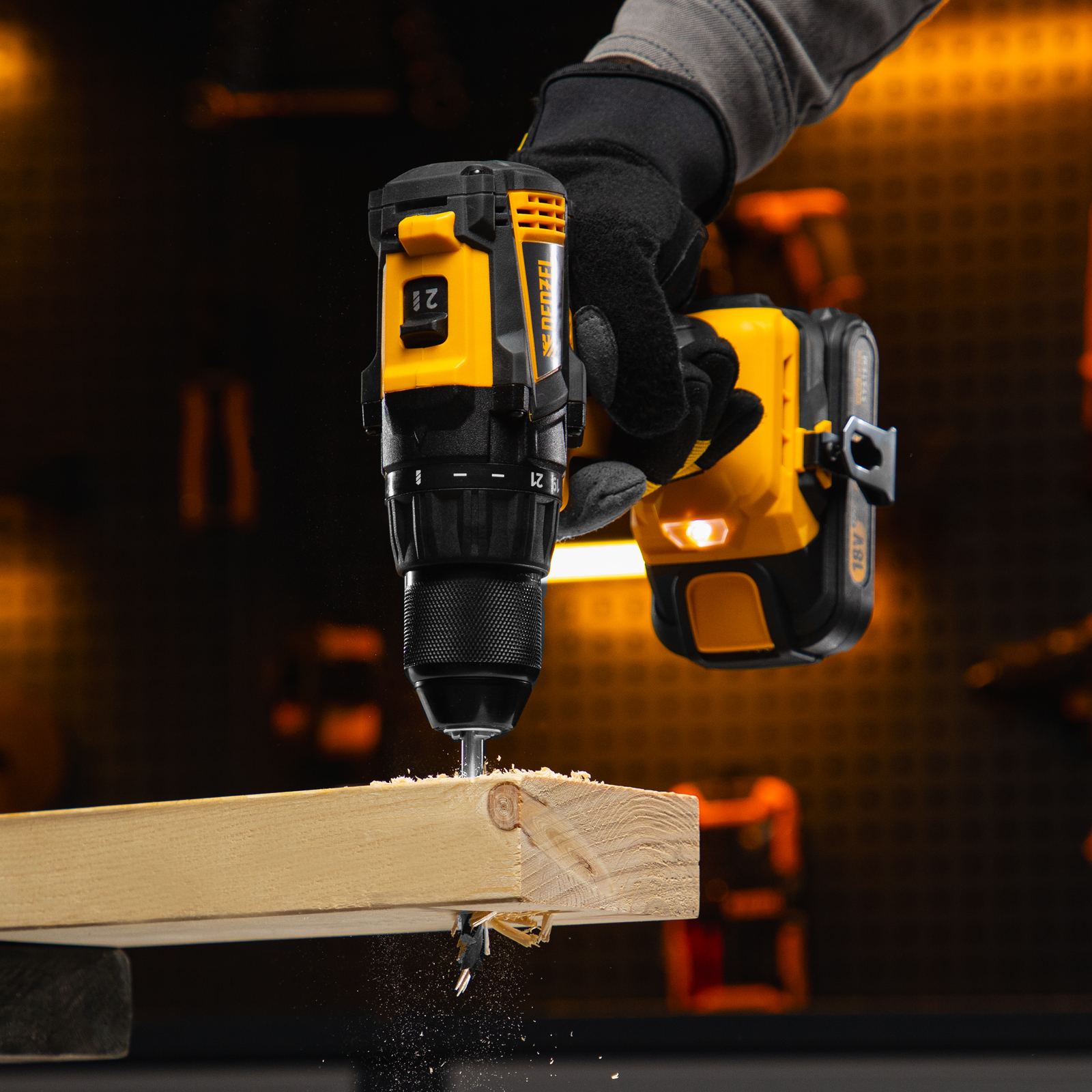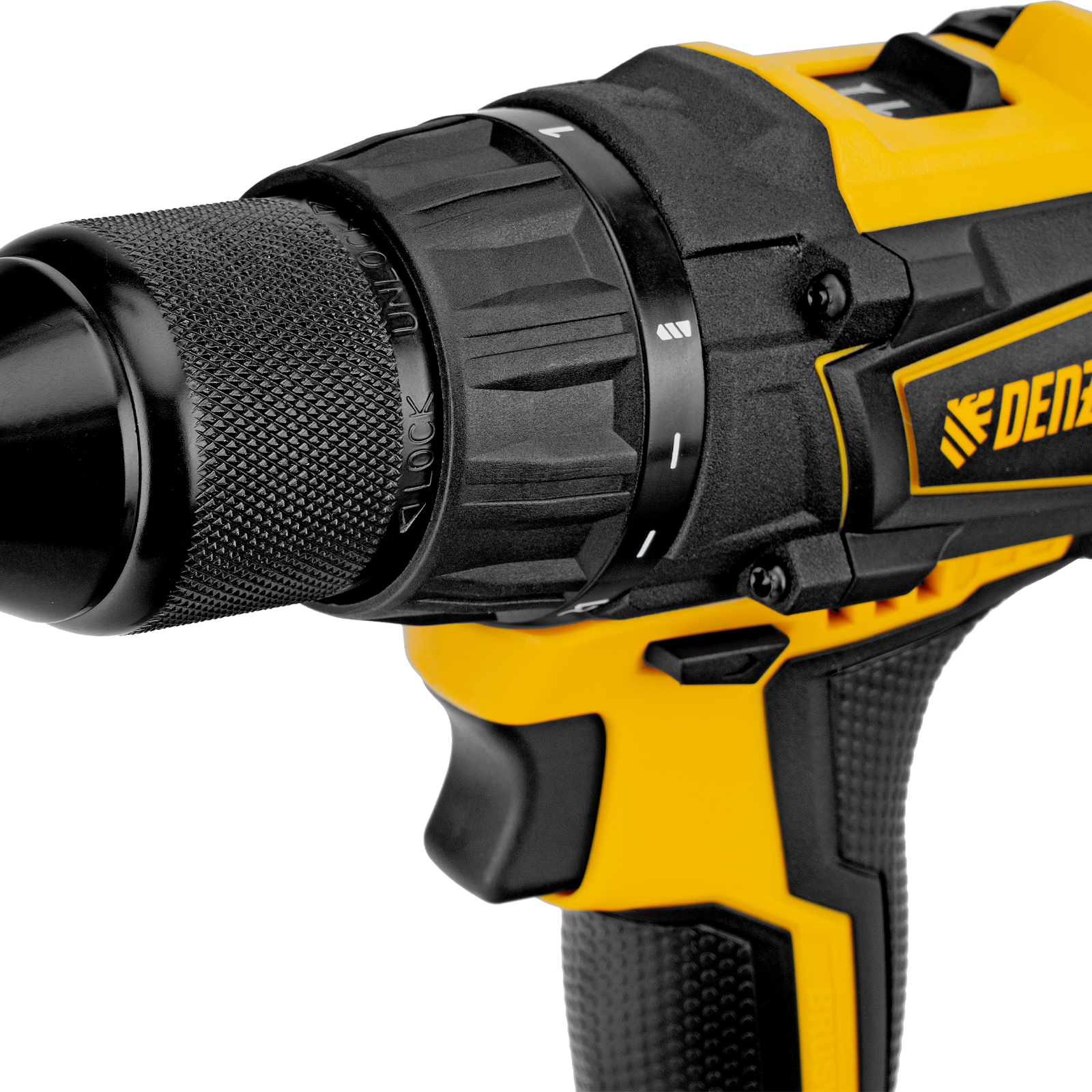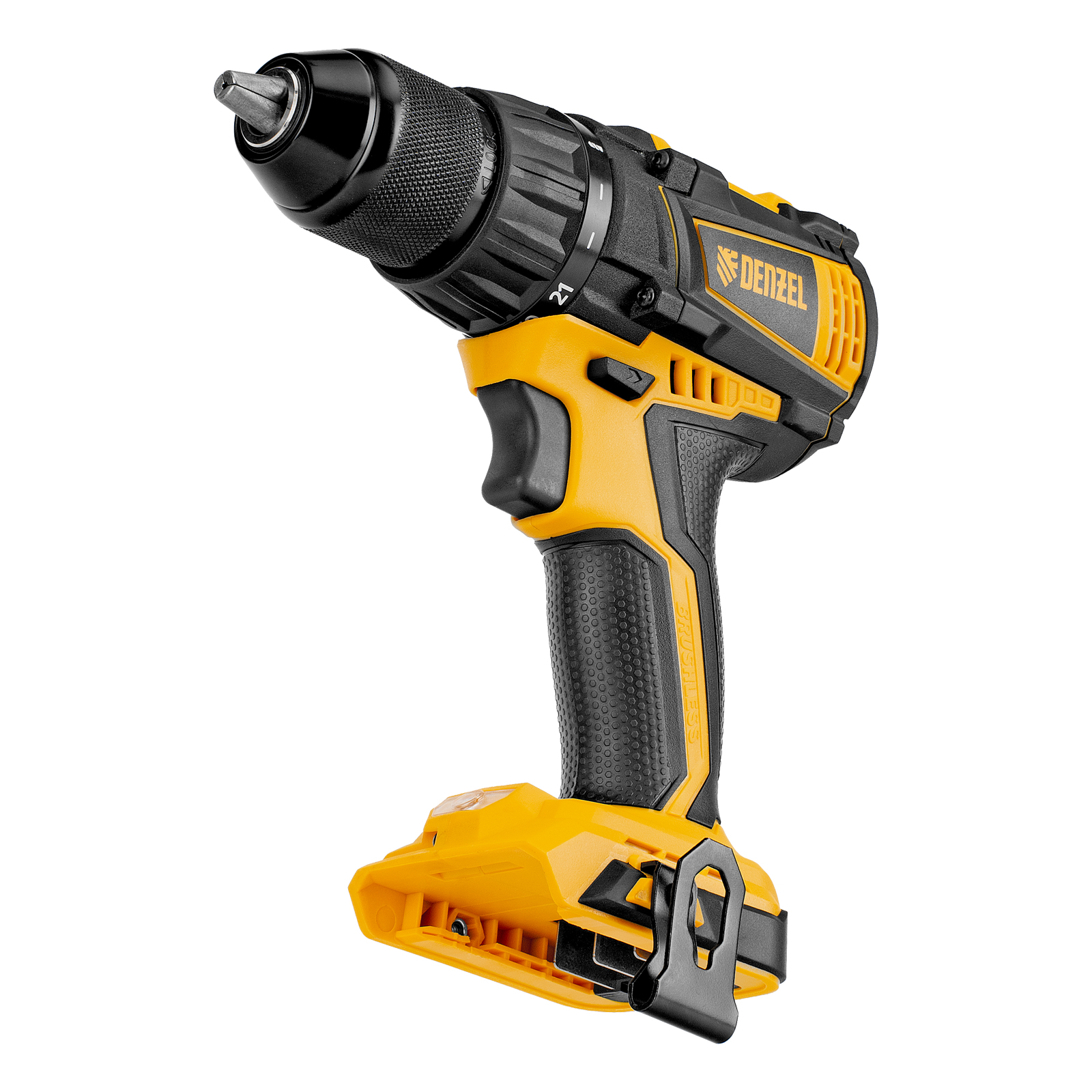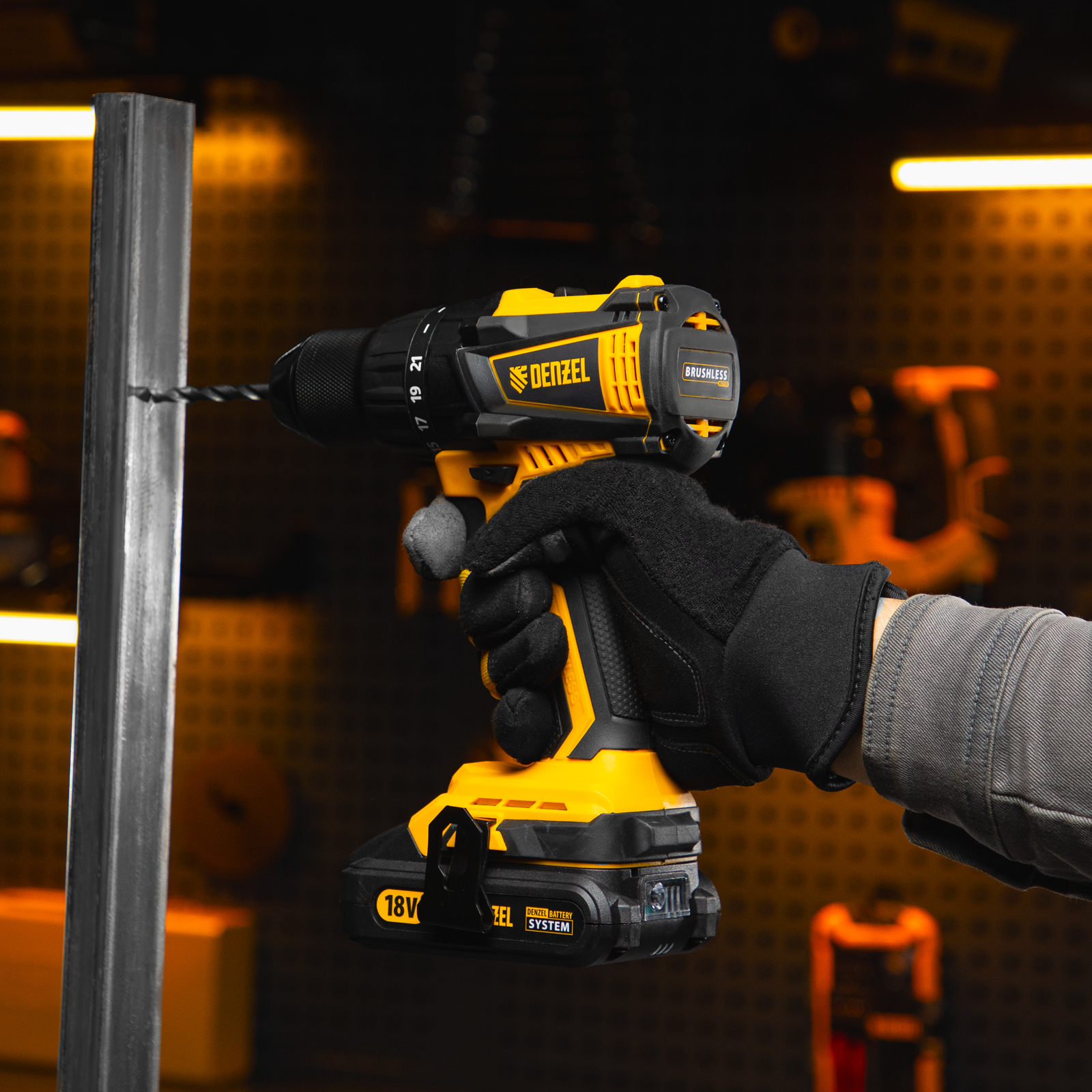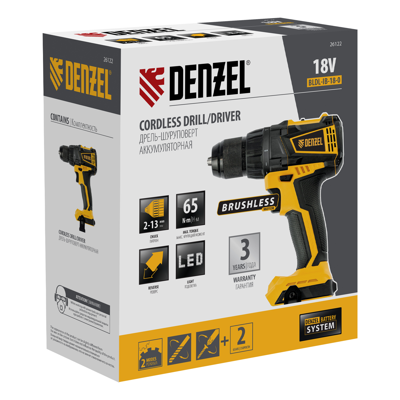 - Универсальность — дрель-шуруповерт совместима с любым Li-Ion аккумулятором и зарядным устройством единой платформы Denzel Battery System 18V.
