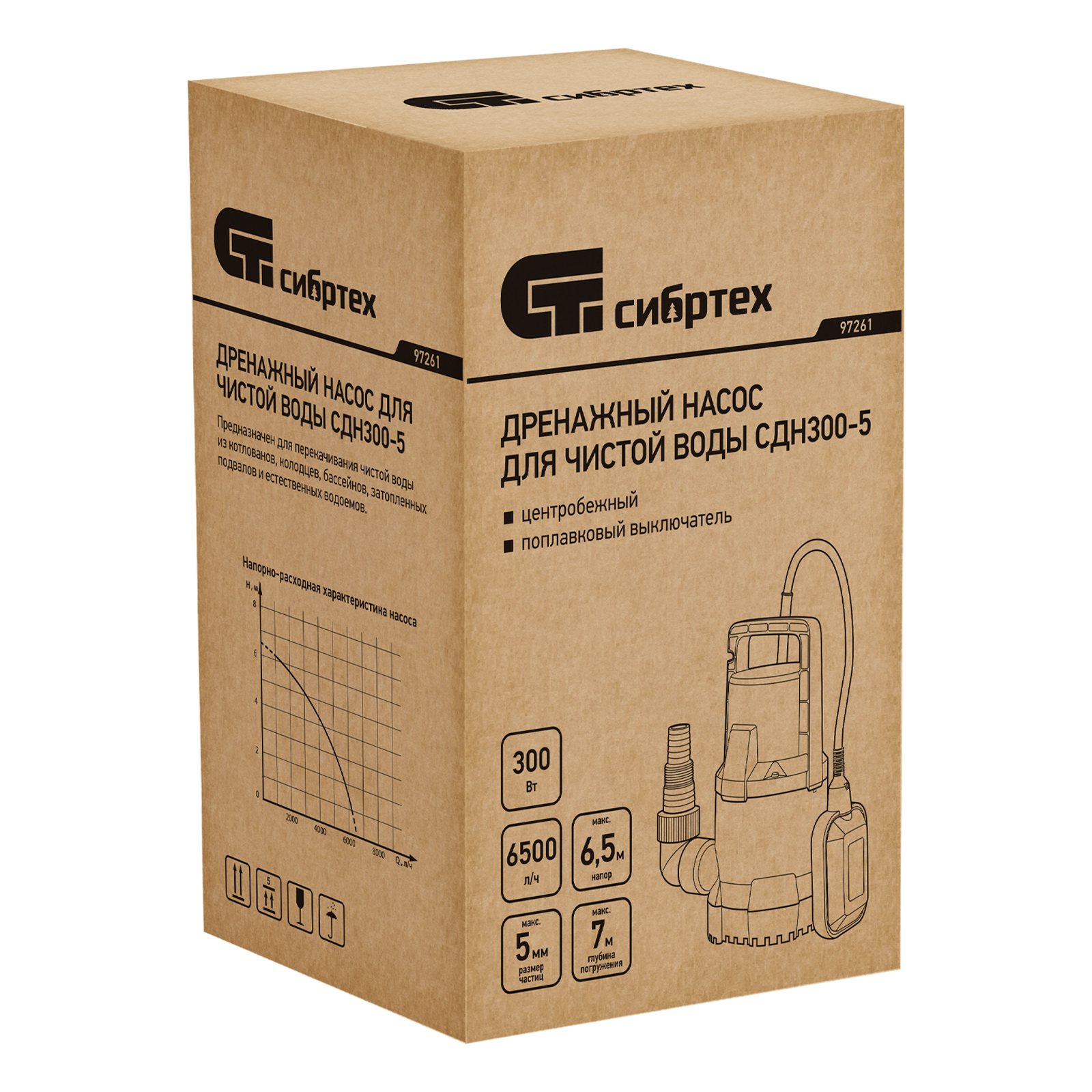 Дренажный насос для чистой воды СДН300-5, 300 Вт, напор 6.5м, 6500 л/ч Сибртех в Краснодаре
