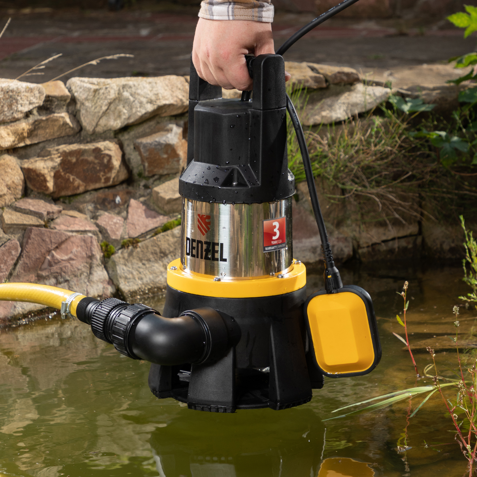 - Комфортное использование — сетевой кабель длиной 10 м удобен для подключения к удаленной розетке, ручка на корпусе облегчает транспортировку и погружение.