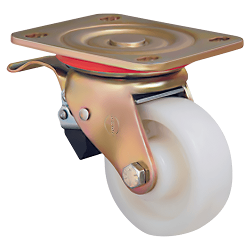 Большегрузное колесо ED01HKZ125F бренда EMES изготовлено из нейлона, устойчиво к воздействию различных агрессивных химических веществ. Подходит для эксплуатации в условиях, требующих соблюдения высоких санитарно-гигиенических требований — например, на предприятиях пищевой промышленности, в лабораториях и медицинских учреждениях. Кронштейн у модели поворотный, изготовлен из оцинкованной стали. Наличие тормозного механизма позволяет при необходимости надежно блокировать колесо, предотвращая его самопроизвольное перемещение.