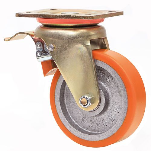 Большегрузное колесо EMES ED01 VBP 100 F имеет поворотный кронштейн с ножным тормозом. Полиуретановая шинка устойчива к истиранию и механическим повреждениям. Максимальная грузоподъемность колесной опоры составляет 350 кг, общая высота — 140 мм. Литой обод из чугуна хорошо распределяет нагрузку. Модель подходит для установки на платформенные тележки, передвижное большегрузное оборудование.