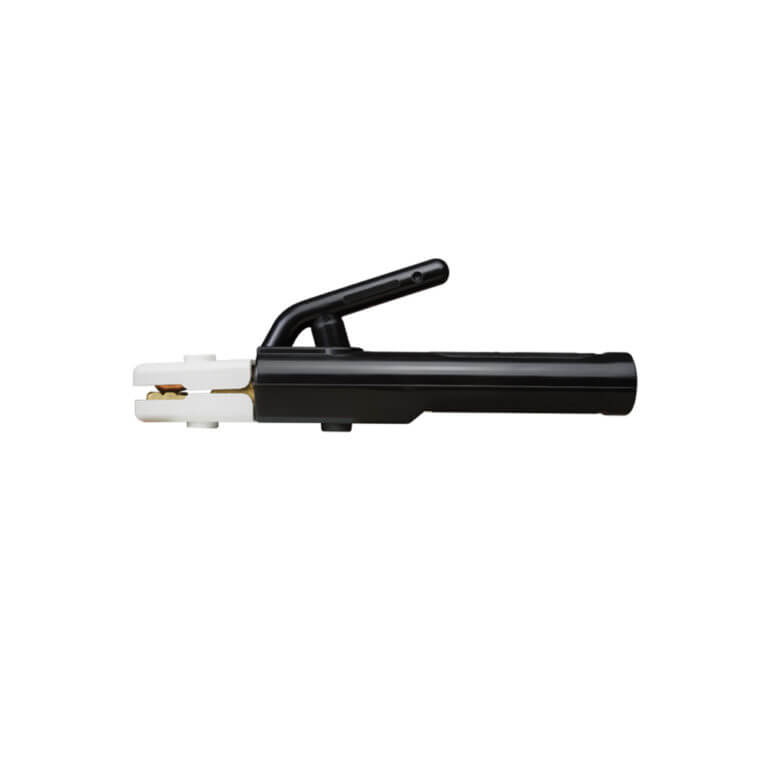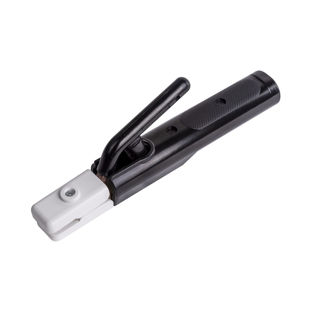 Электрододержатель EH-300А немецкого типа предназначен для крепления электродов при ручной электродуговой сварке. Обеспечивает установку и надёжное закрепление покрытых металлических электродов, а также освобождение огарка, чтобы при возбуждении дуги или при сварке не происходило смещения электрода в месте закрепления. Соответствует требованиям ГОСТ 14651-78 (р.3), ГОСТ 22917-78 (р.3) и обеспечивает защиту от случайного прикосновения к токопроводящим частям.ЭРГОНОМИЧНОСТЬ: Эргономичная противоскользящая рукоятка хорошо лежит в руке. Термостойкий пластик обеспечивает безопасность во время рабочего процесса.ПРЕИМУЩЕСТВА:Универсален в применении, для электродов любого типаТермостойкая изолированная ручка с рифлением, исключающая проскальзывание рукиРассчитан на высокие механические и тепловые нагрузкиЖёсткая фиксация электродов в четырёх положенияхНадёжное механическое крепление сварочного кабеля
