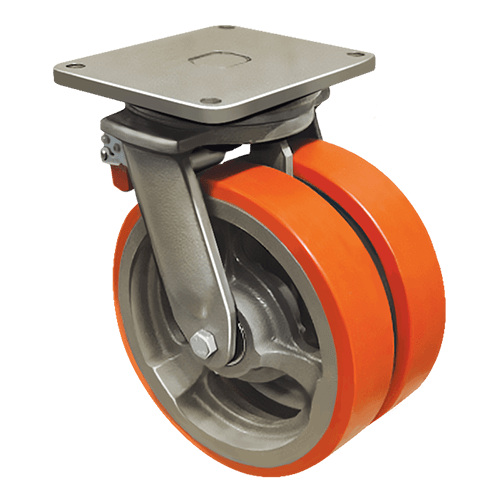 Сдвоенное колесо с ножным тормозом EMES EW01 VBP 350 F имеет диаметр 350 мм, способно выдерживать супернагрузки — максимальная грузоподъемность составляет 4800 кг. Модель станет отличным выбором для установки на тяжелое складское, промышленное и строительное оборудование, платформенные тележки.