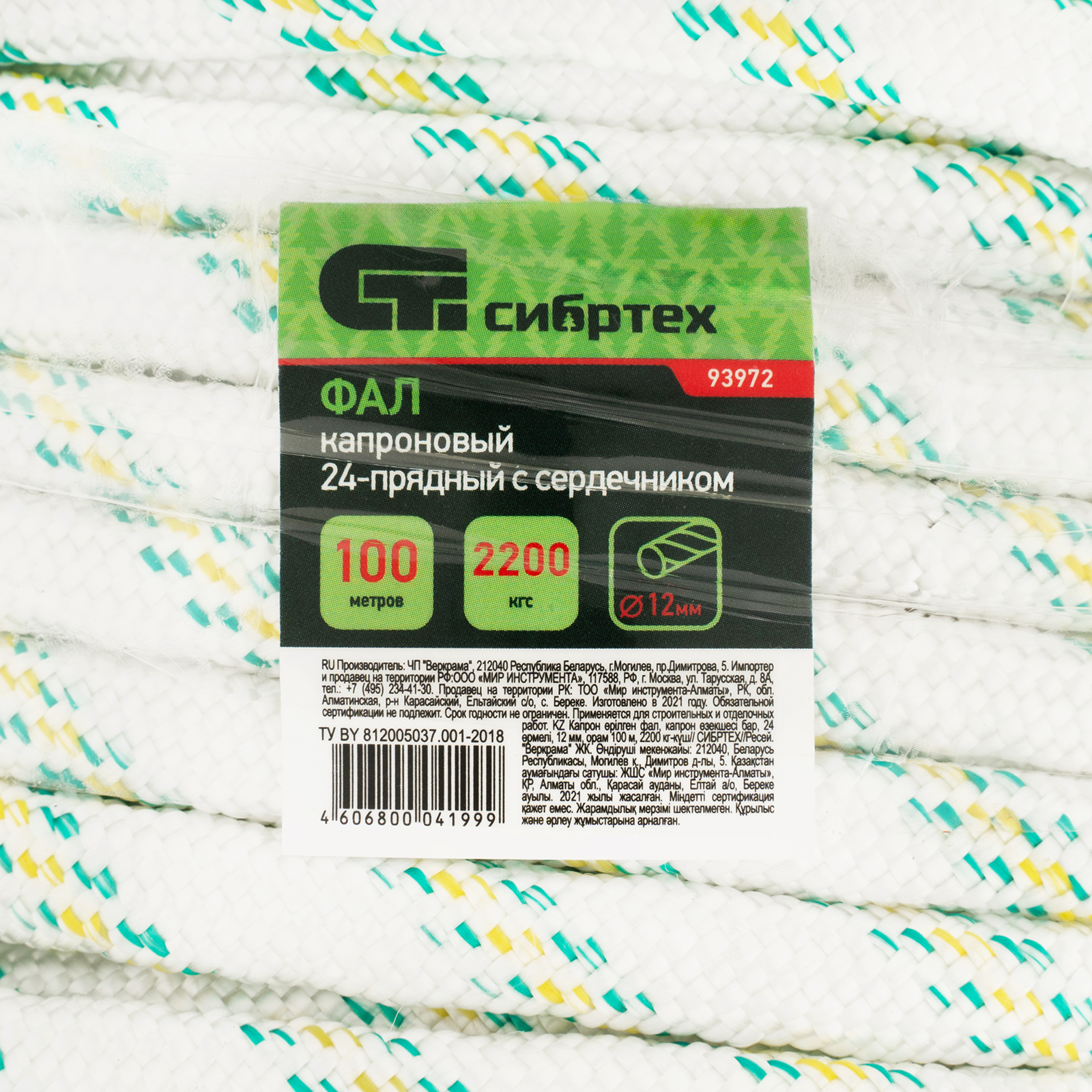 Фал плетеный капроновый с сердечником, 12 мм, L 100 м, 24-прядный, Сибртех в Краснодаре
