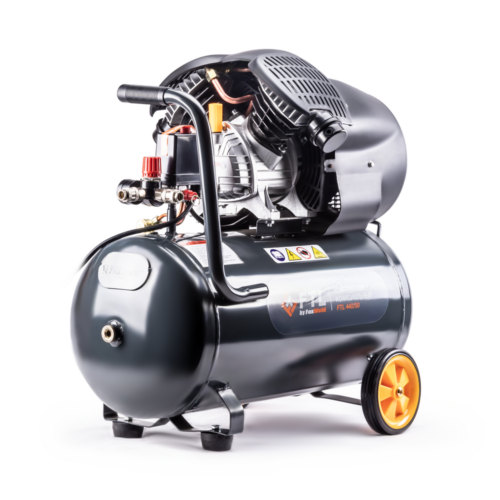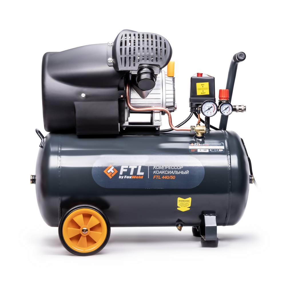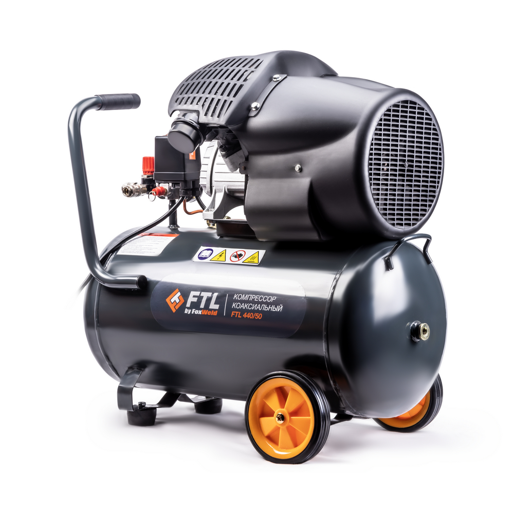 FTL 440/50 – воздушный двухпоршневой коаксиальный масляный компрессор. Мощный однофазный индукционный электродвигатель в 2,2 кВт с прямым приводом в сочетании с высокопроизводительной двухпоршневой V-образной компрессорной головкой с диаметром поршней в 51 мм производят высокий объем – 440 л/мин воздуха с давлением до 8 бар. Перечисленные характеристики в сочетании с вместительным 50-литровым ресивером делают данную модель компрессора настоящим универсальным агрегатом для решения большинства задач там, где требуется подача сжатого воздуха. Модель незаменима для применения в гараже загородного дома или небольшой автомастерской. Высокая производительность FTL 440/50 позволяет работать с широким ассортиментом самого различного пневмоинструмента. Компрессор оснащен автоматическим реле давления с манометром, аварийным (перепускным) клапаном и сливным краном для конденсата, вместительным масляным картером и встроенным регулятором с дополнительным манометром для установки выходного давления, а также двумя быстросъёмными выходами. Для удобства работы и гашения вибраций модель имеет две фронтальных прорезиненных опоры. Безопасность дополнительно гарантируется наличием большого обтекаемого кожуха, защищающего головки цилиндров и исключающего риск обжечься в случае непреднамеренного касания горячих рабочих поверхностей. Для удобства транспортировки предусмотрено наличие двух задних прорезиненных колес и U-образной рукоятки.РЕГУЛЯТОР ДАВЛЕНИЯ С МАНОМЕТРОМ: Предусмотрены регулировка и визуальный контроль выходного давления за счёт встроенных манометров и регулятора.НИЗКИЙ УРОВЕНЬ ШУМА: Данный компрессор отличается низким уровнем шума, что обеспечивает комфортную работу в любое время дня без помех для окружающих.ПРЕИМУЩЕСТВА:Сеть – 230 ВДвухпоршневая V-образная компрессорная головкаБольшой диаметр поршней 51 ммВысокая производительность на входе 440 л/минВместительный 50-литровый ресиверБыстросъёмные выходыАвтоматические реле давления с манометромРегулятор для настройки выходного давления с манометромБезопасность и простота обслуживанияU-образная рукоятка – удобство транспортировкиГарантийный срок - 1 годКОМПЛЕКТАЦИЯ:FTL Компрессор коаксиальный 440/50 – 1 шт.;Колёса с комплектом крепления – 2 шт.;Резиновые нижние опоры с комплектом крепления – 2 шт.;Сапун масляного картера – 1 шт.;Воздушный фильтр – 2 шт.;Масло в бутылке – 1 шт.;Инструкция по эксплуатации + Гарантийный талон – 1 компл.*Производитель оставляет за собой право менять комплектацию оборудования.