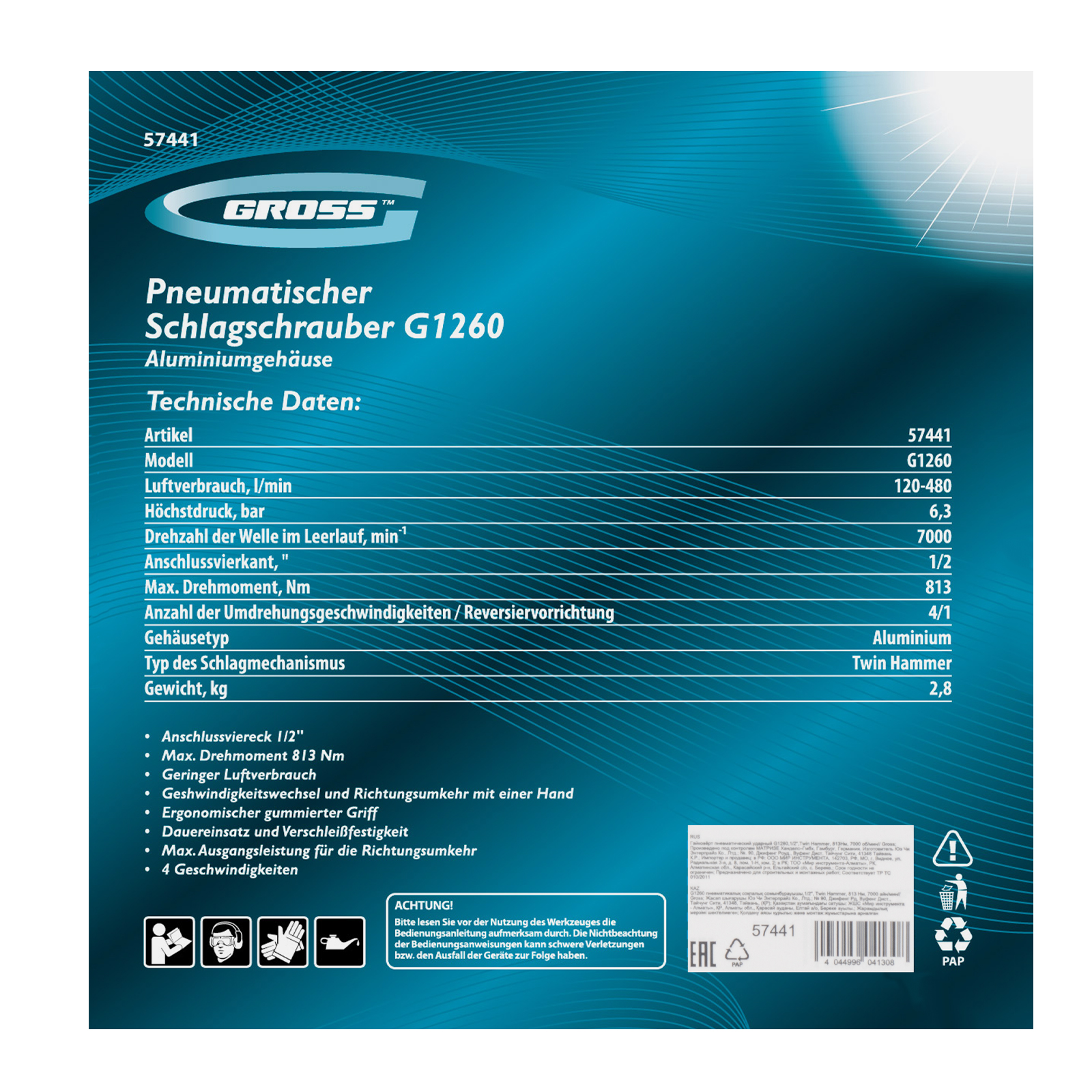 Гайковерт пневматический ударный G1260,1/2, Twin Hammer, 813Нм, 7000 об/мин Gross в Краснодаре
