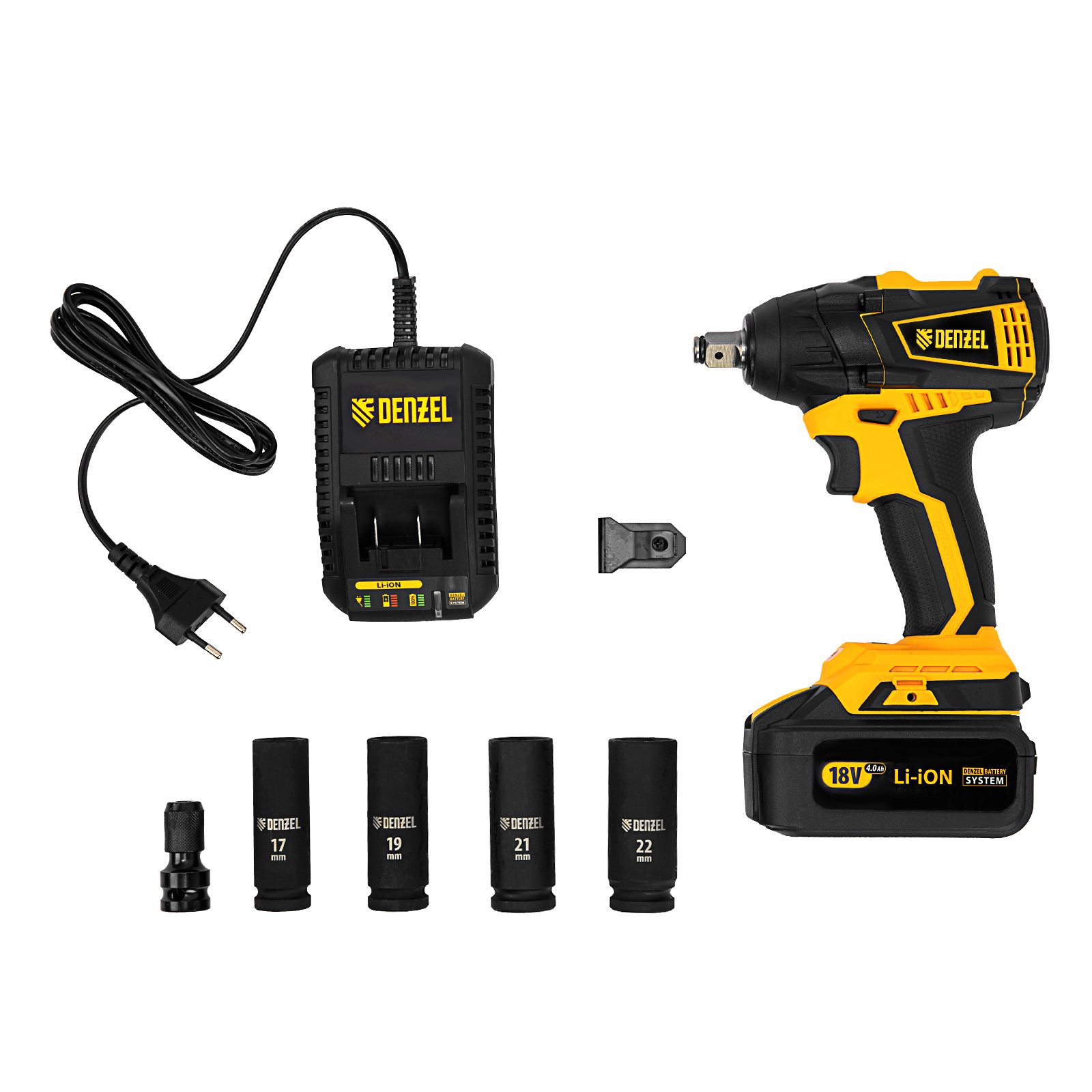 - Полная готовность к работе — в комплект входит зарядное устройство, аккумулятор, адаптер HEX 1/4 дюйма и 4 ударные торцевые головки размером 17, 19, 21 и 22 мм.