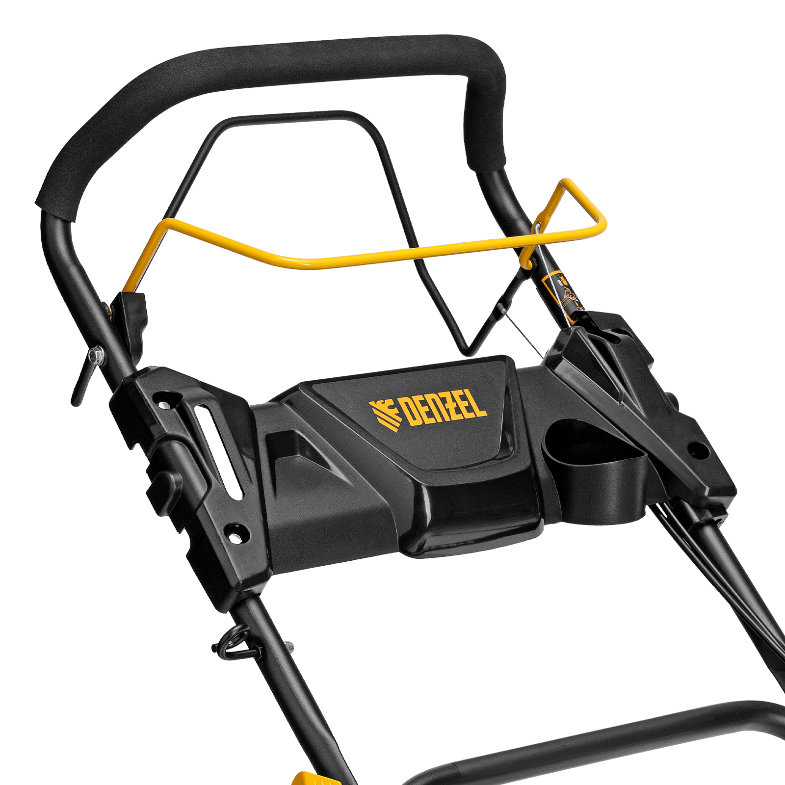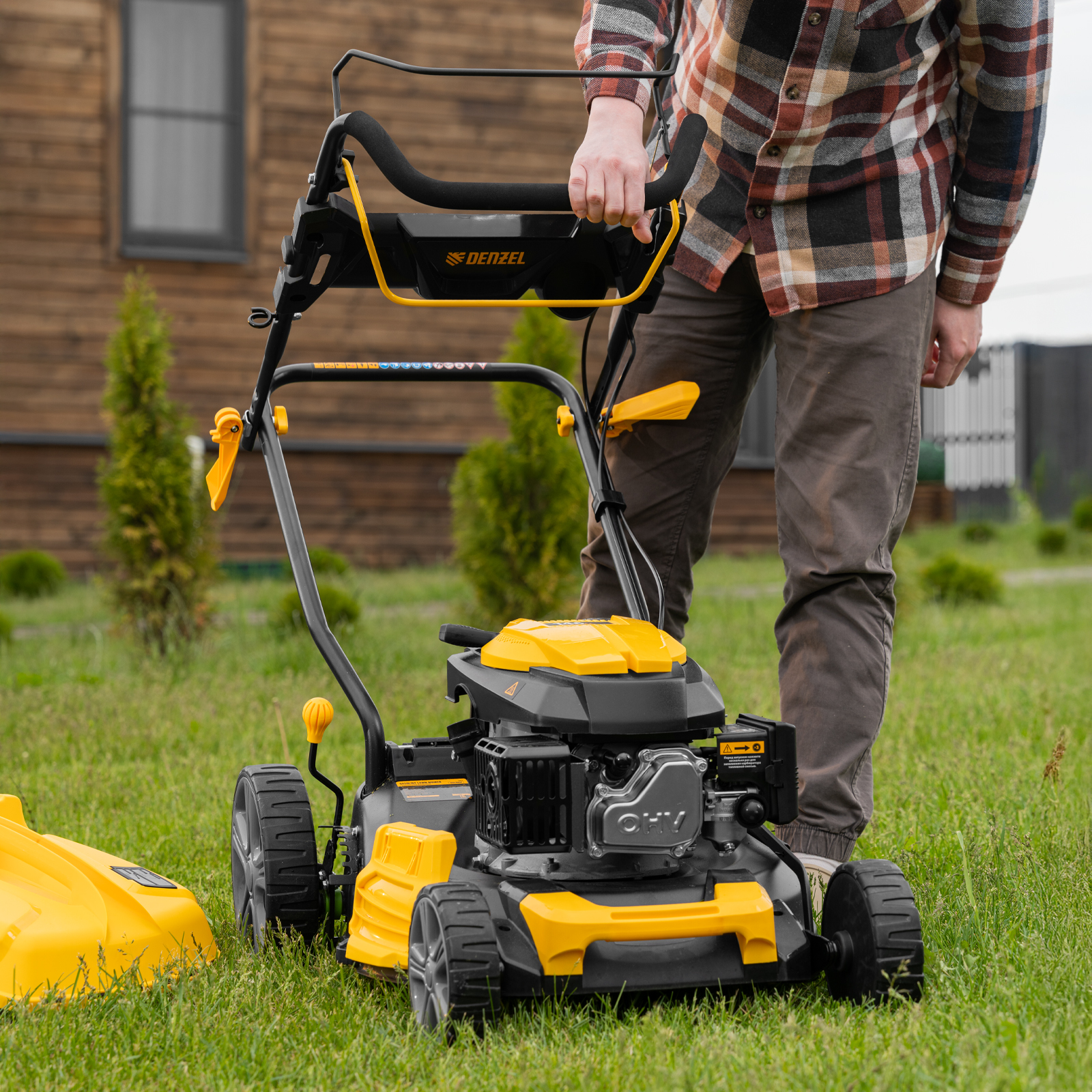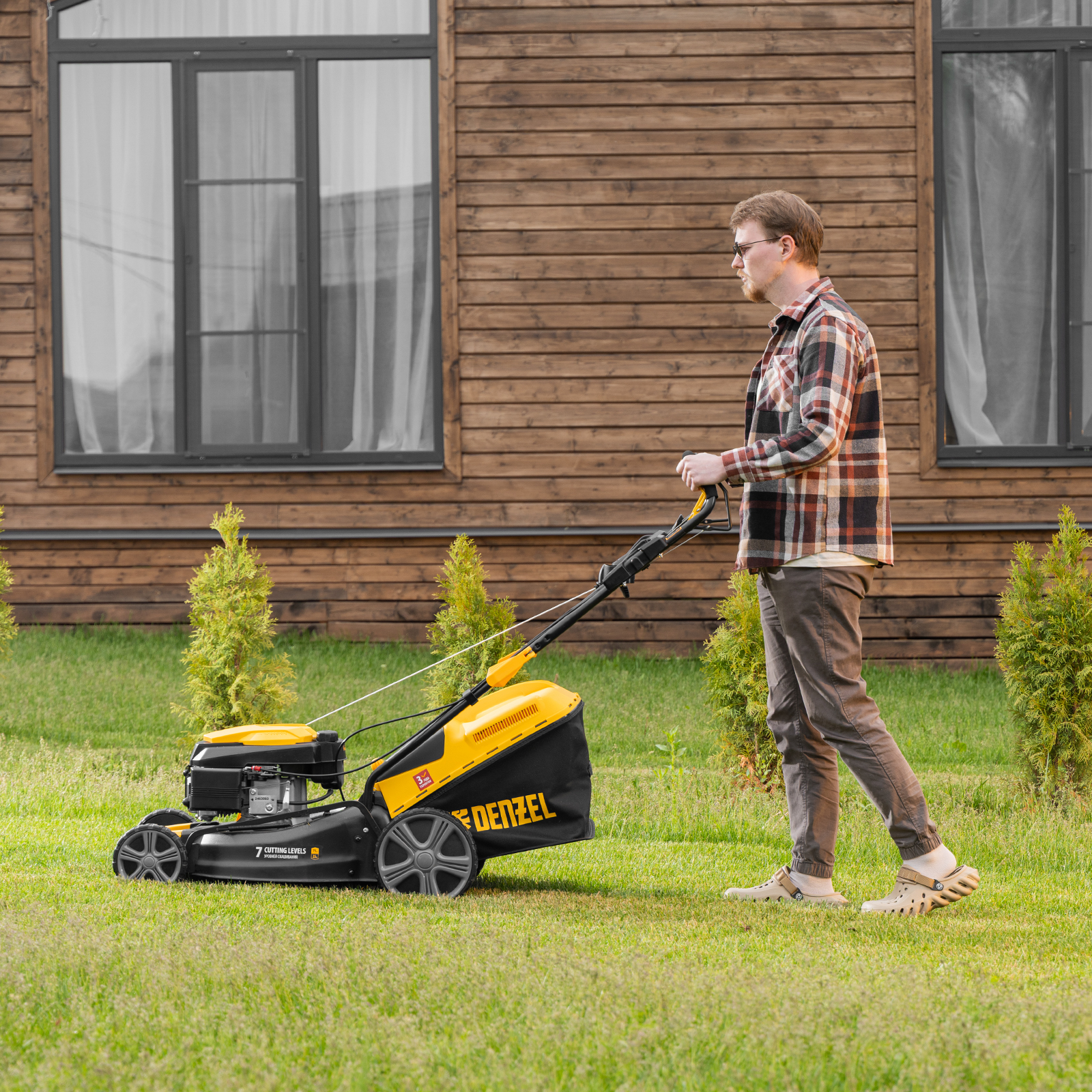 Двигатель Denzel обеспечивает высокую скорость вращения ножа 3000 об/мин, разумно потребляя топливо. Одного бака хватает на 40-60 минут работы. Ширина скашивания травы за один проход составляет 46 см — таким образом, за 1,5 часа Вы обработаете около 2500 м2. Косилка формирует газон высотой от 25 до 75 мм. Всего доступно 7 уровней скашивания, поэтому можно создать как спортивную площадку, так и элитный партерный газон.