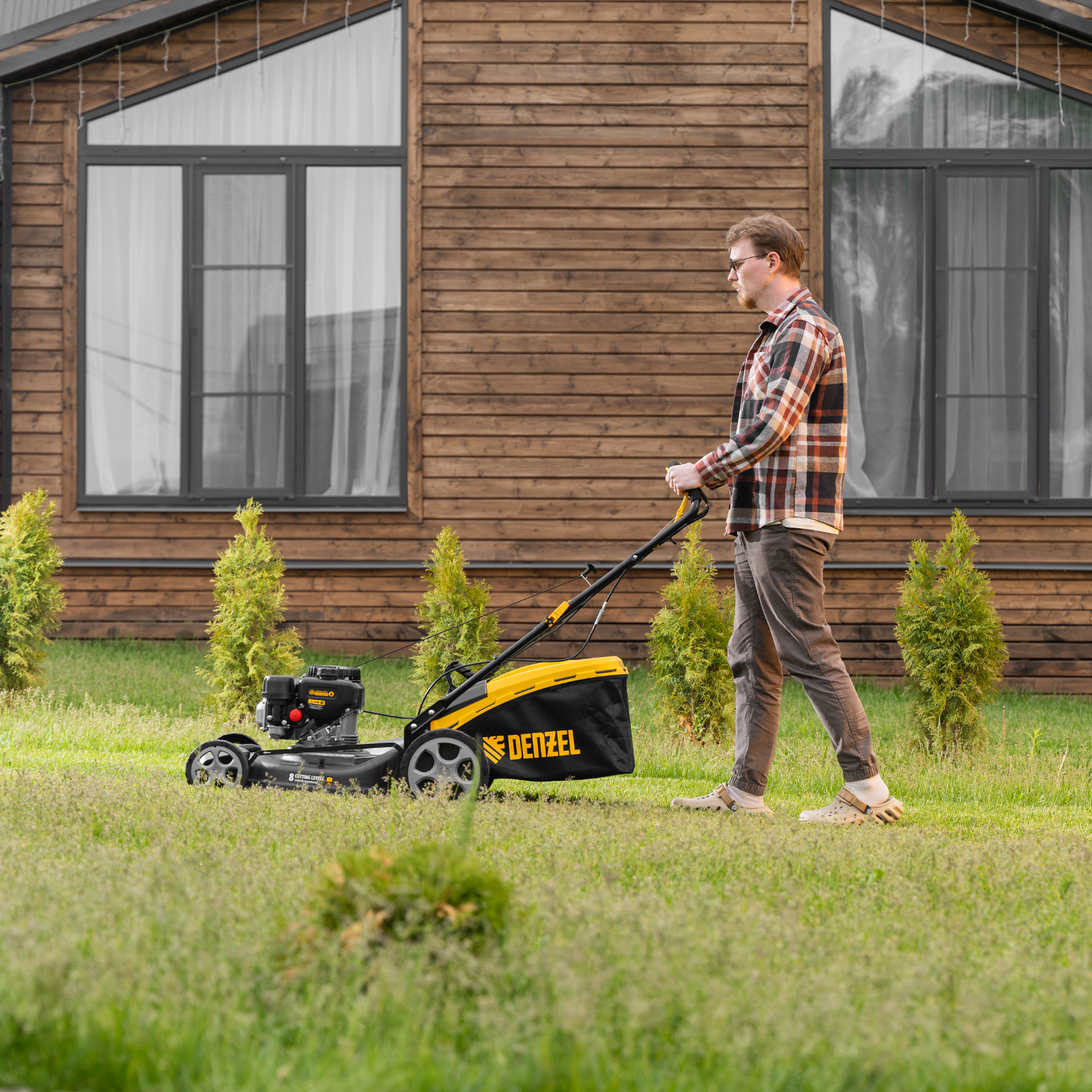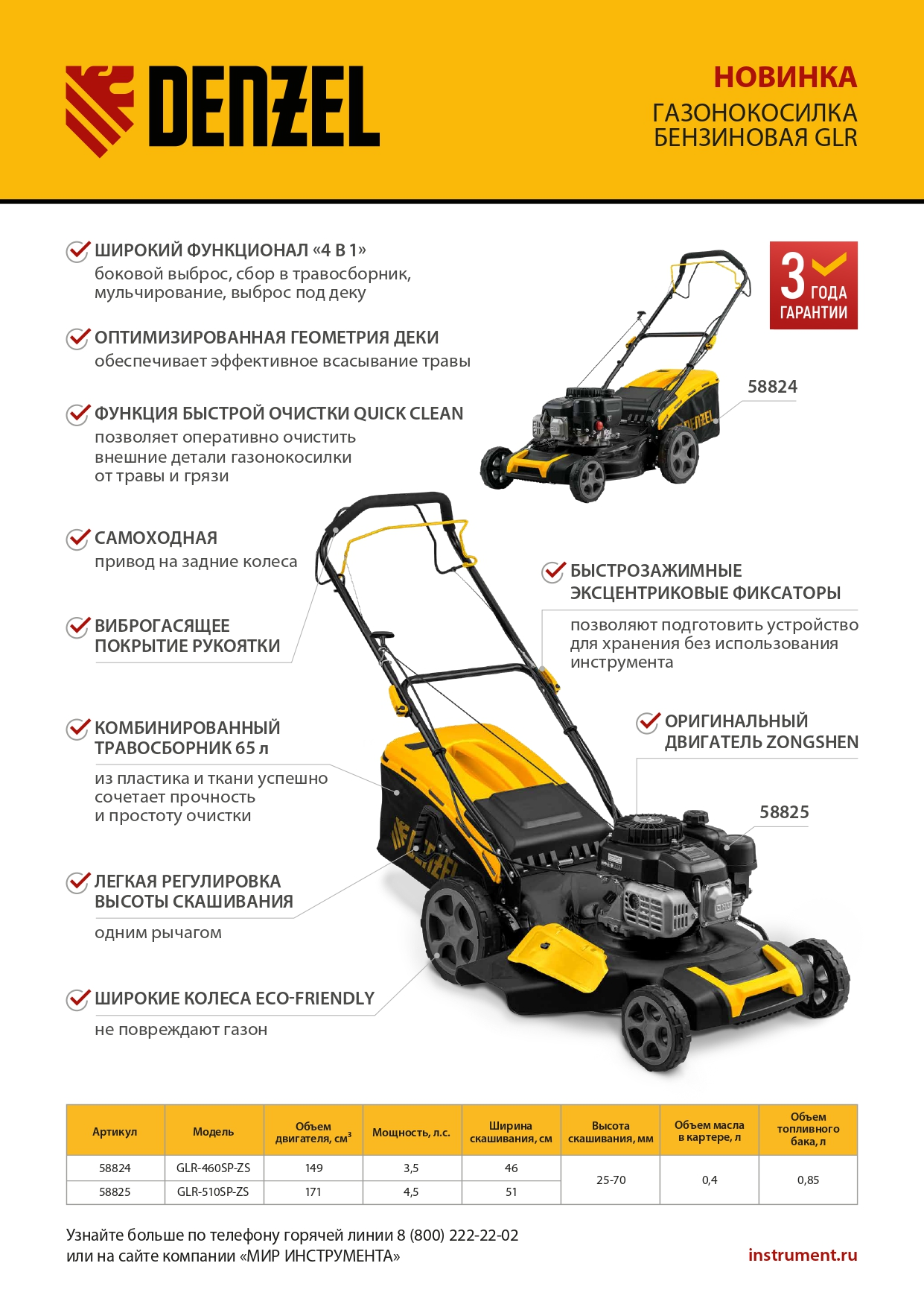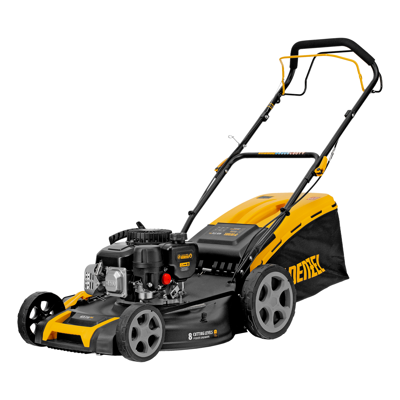 Бензиновая газонокосилка Denzel GLR-510SP-ZS 58825 с приводом на колеса и травосборником вместимостью 65 л, с надежным и экономичным 4-тактным двигателем объемом 171 см3, обеспечивает ширину прохода 51 см. Предназначена для стрижки газонов и скашивания травы в саду, будет полезна для ухода за дачным участком или придомовой территорией большой площади. Высота скашивания легко регулируется одним рычагом в диапазоне 25-70 мм (предусмотрено 8 уровней).