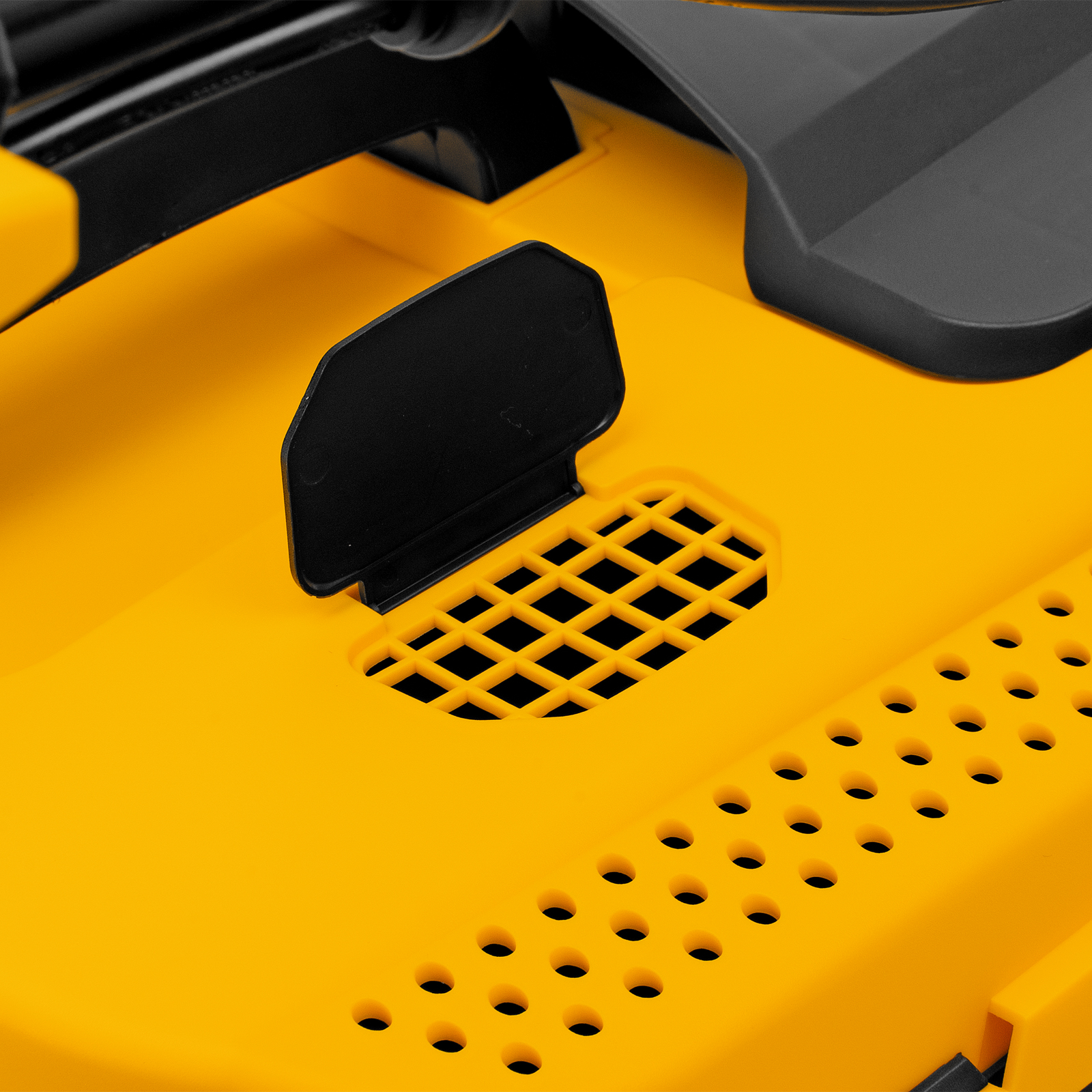 - Безопасность — функция блокировки исключает случайный запуск двигателя, а держатель кабеля предотвращает отключение техники от сети и уменьшает риск попадания провода под нож.