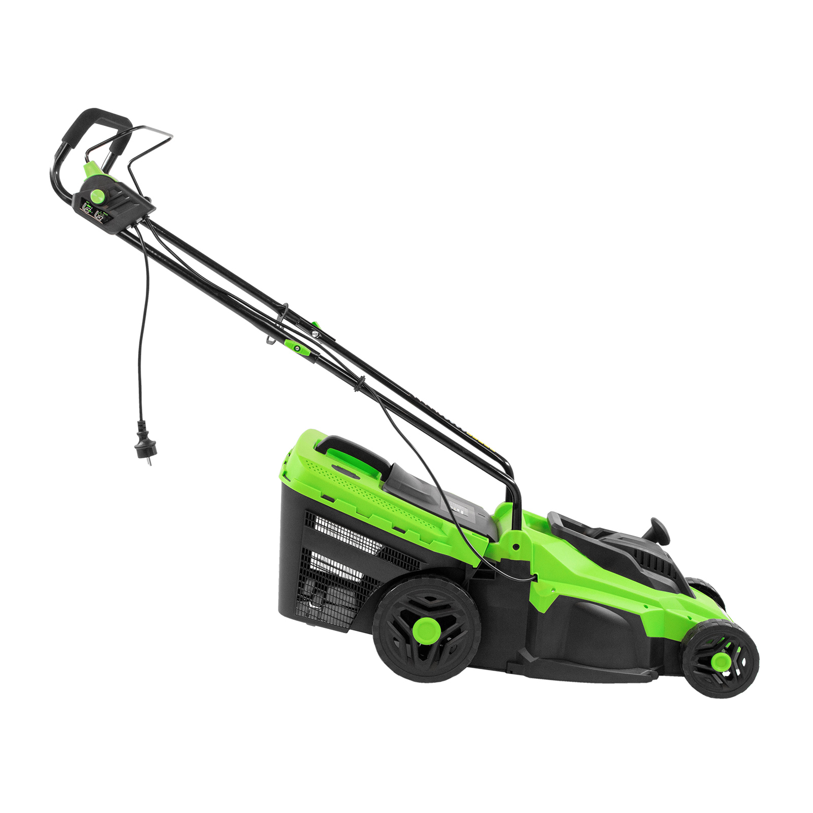 - Комфортная эксплуатация — для управления используется скоба, а не рычаг, как на большинстве электрокосилок, что делает работу удобной, особенно для левшей.
