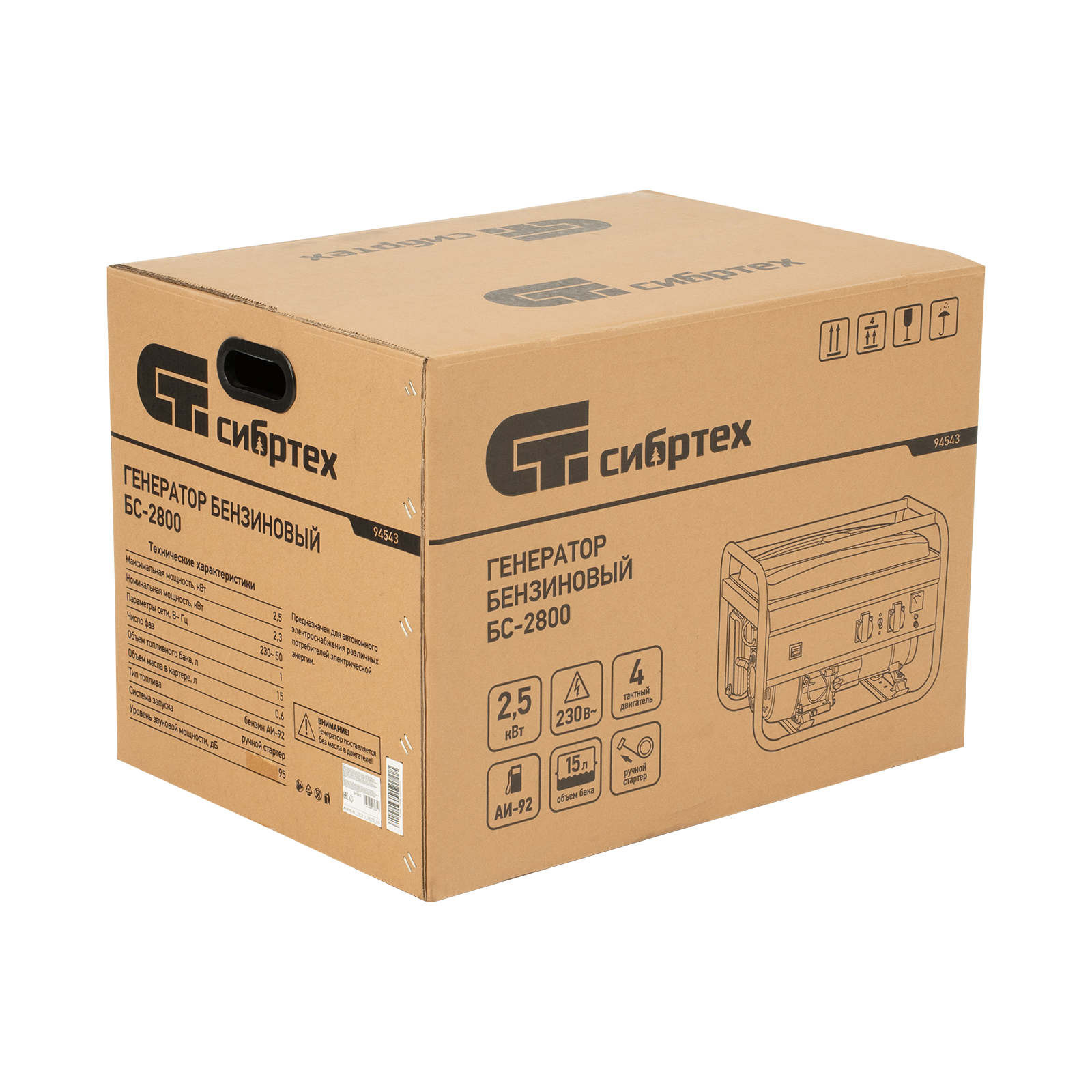 Генератор бензиновый БС-2800, 2.5 кВт, 230В, четырехтактный, 15 л, ручной стартер Сибртех в Краснодаре
