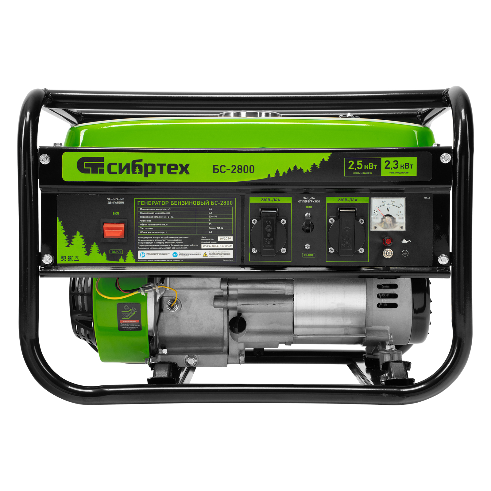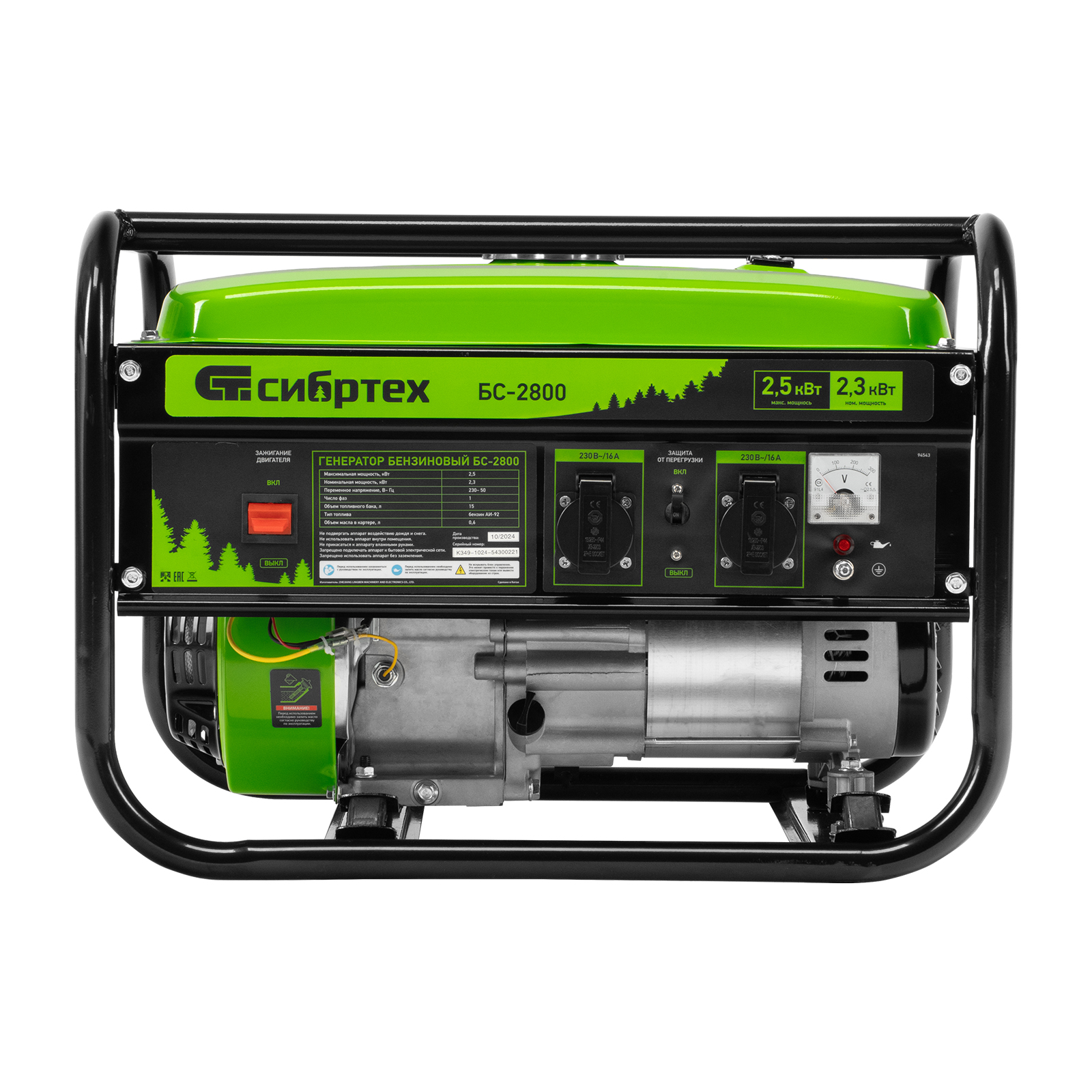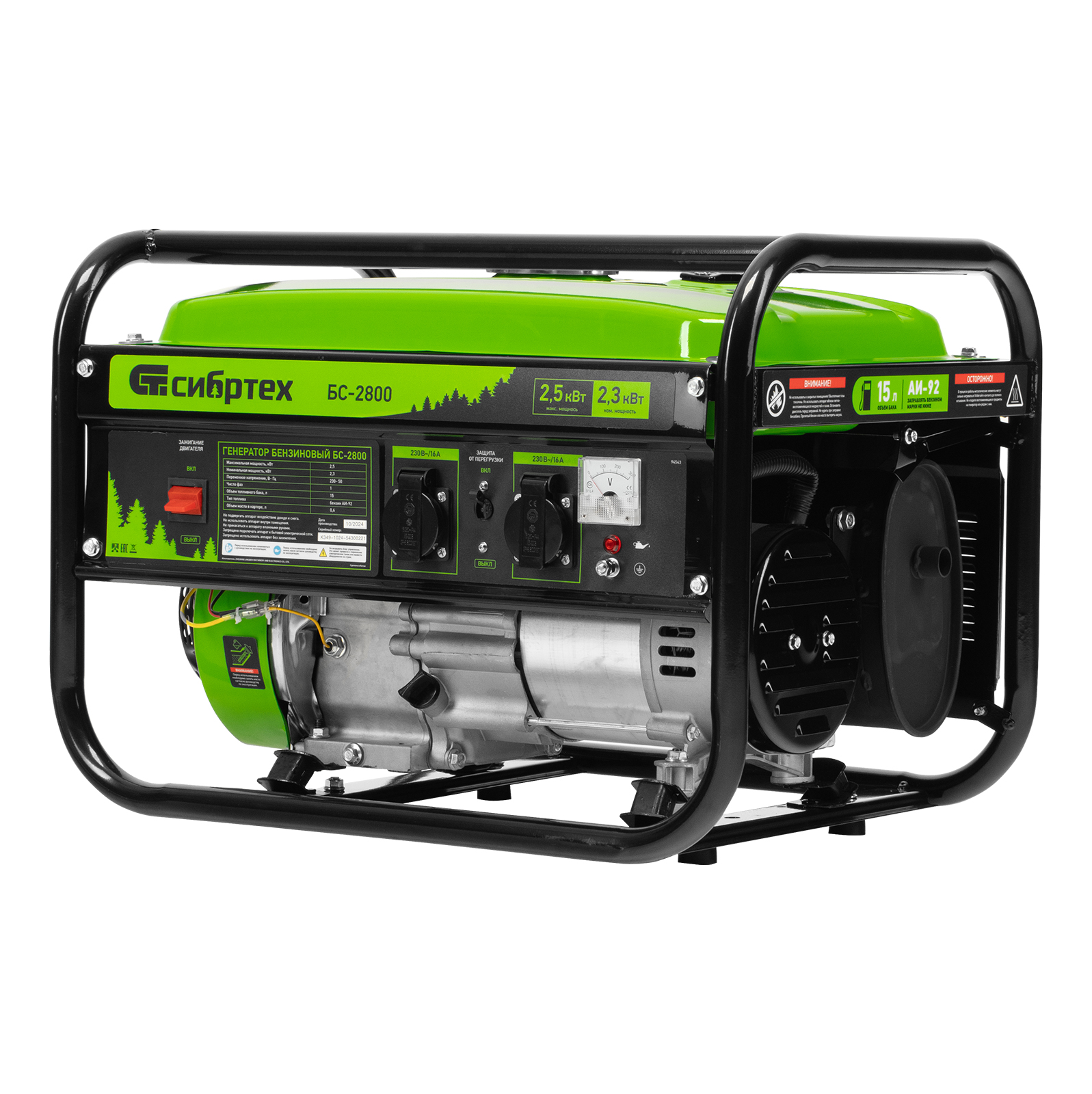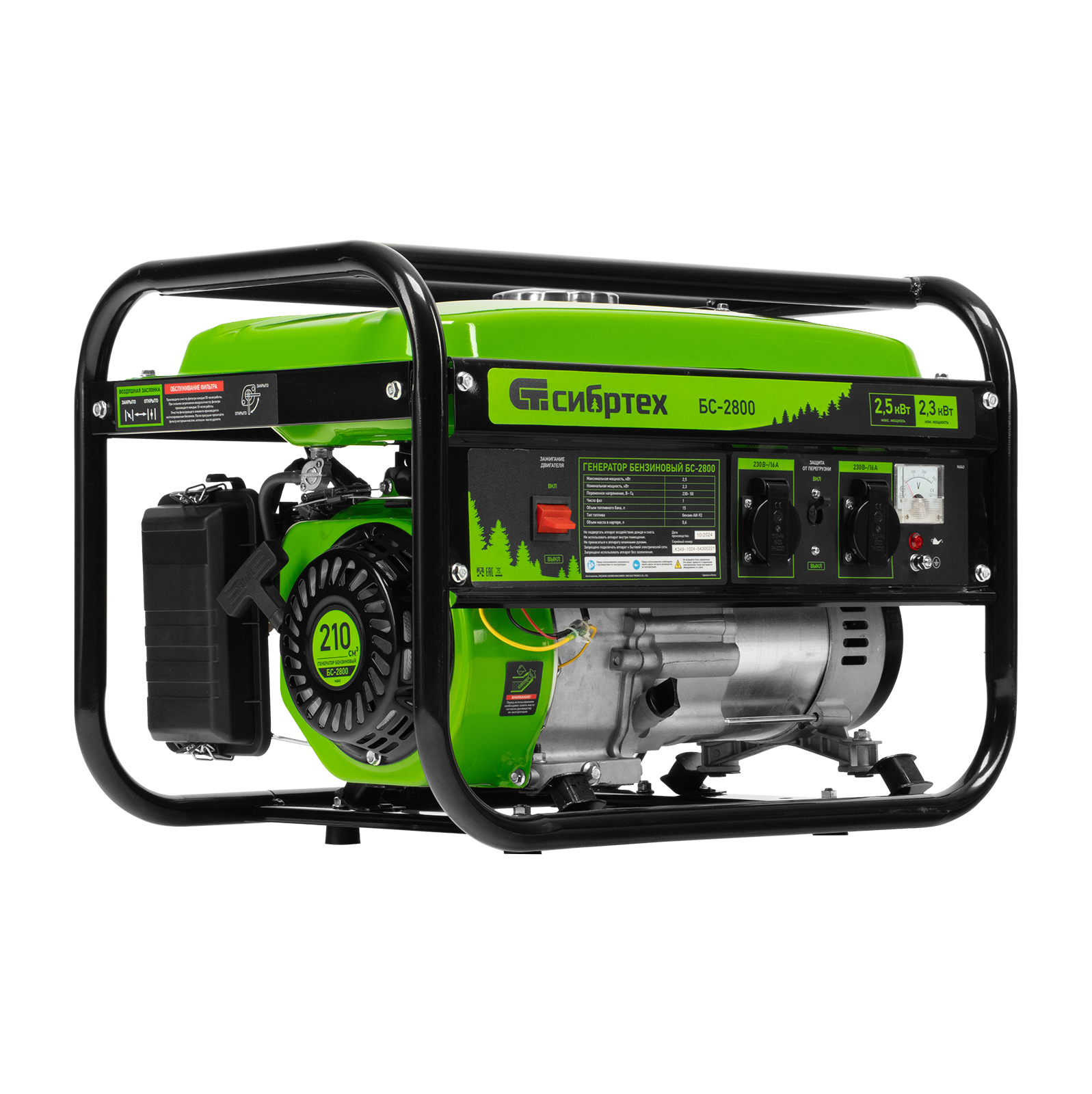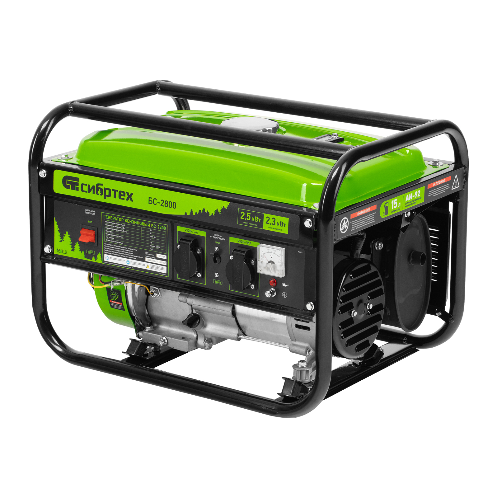 Бензиновый генератор Сибртех БС-2800 94543 на 230 В, максимальной мощностью 2,5 кВт, с 4-тактным двигателем и баком объемом 15 л, подходит для использования на даче, в гараже, мастерской или на стройке. Небольшой вес 37,6 кг позволяет брать генератор с собой на выездные работы или на природу. Мощности 2,5 кВт достаточно для одновременного питания 2 ламп накаливания, холодильника, СВЧ-печи и телевизора. 2 розетки упрощают одновременное подключение нескольких приборов.
