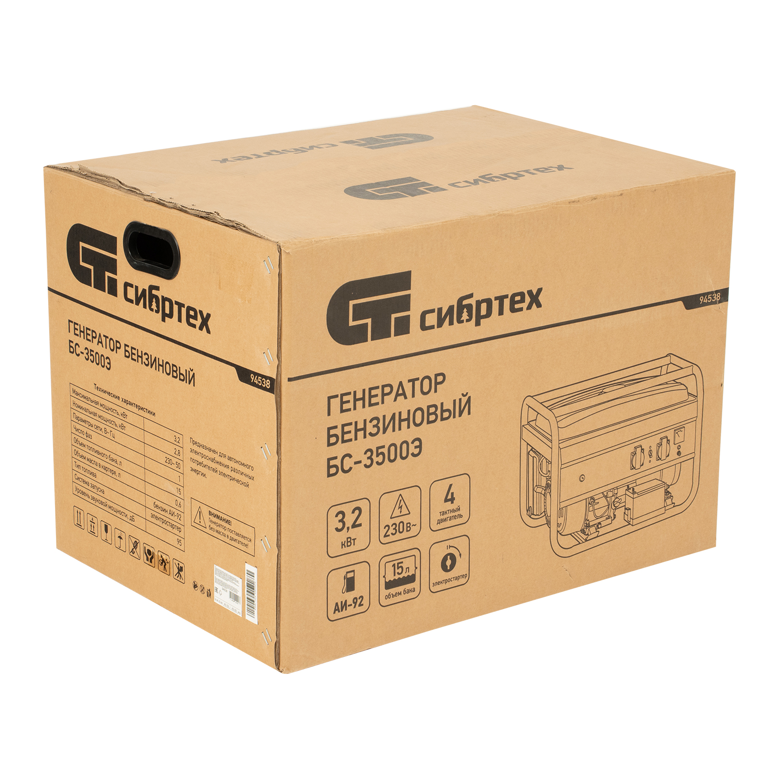 Генератор бензиновый БС-3500Э, 3.2 кВт, 230В, 4-х тактный, 15 л, электростартер Сибртех в Краснодаре