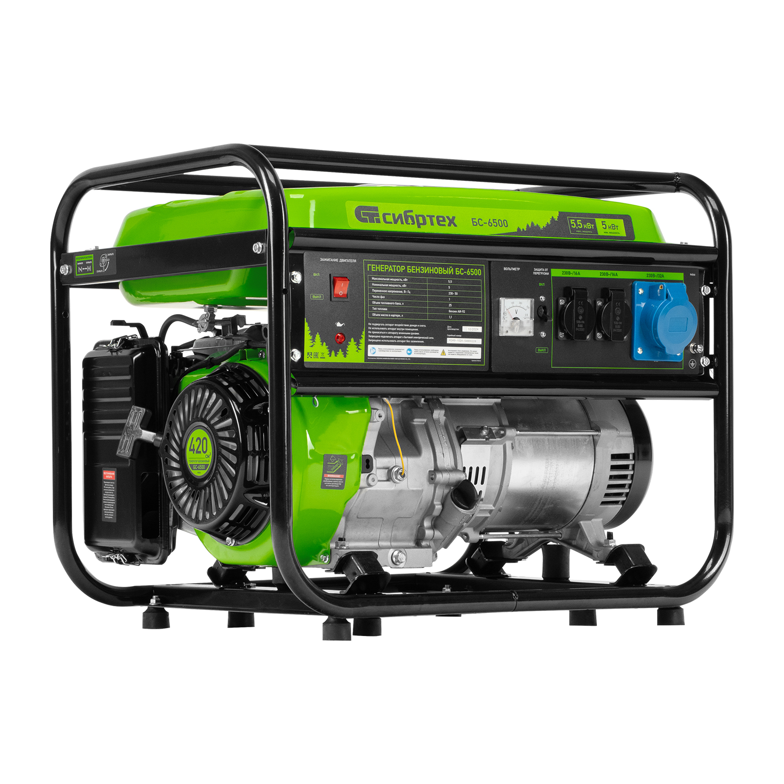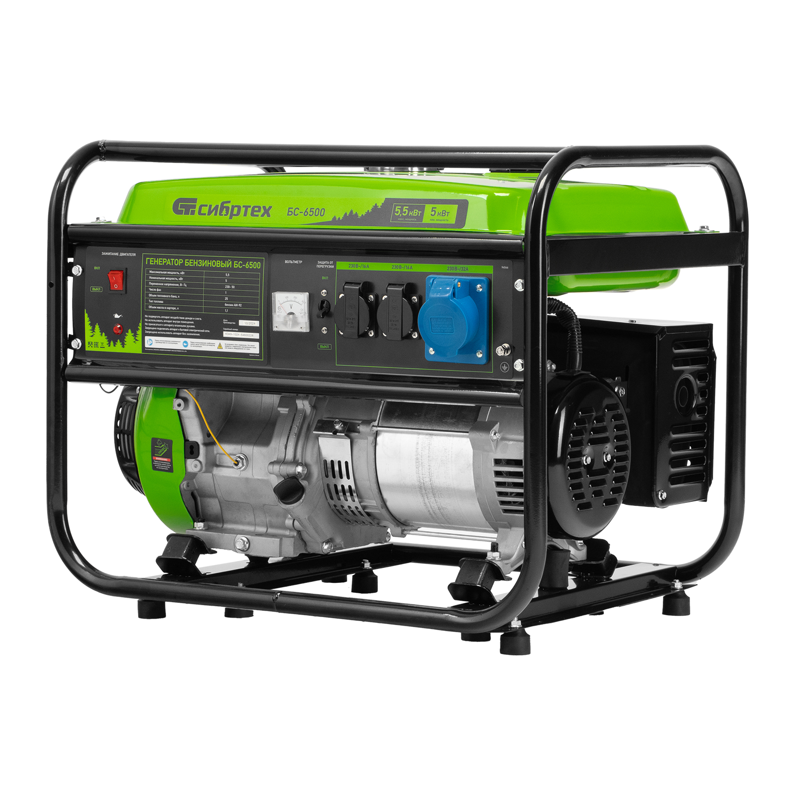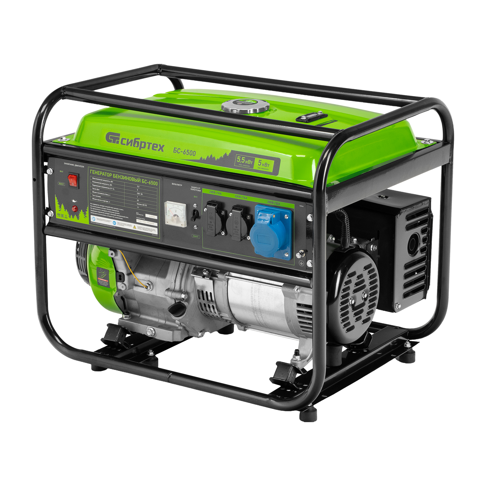 Бензиновый генератор Сибртех БС-6500 94546 на 230 В, с 4-тактным двигателем, баком на 25 л и ручным стартером, выдает 5,5 кВт и подходит для создания целой электросети в загородном доме, магазине, мастерской или на строительной площадке. К нему можно одновременно подключить 5 ламп накаливания, холодильник, телевизор. Для подключения приборов предусмотрено 3 розетки. Одна из них силовая на 32А, что позволяет запитать мощное оборудование, например, электрическую плиту.