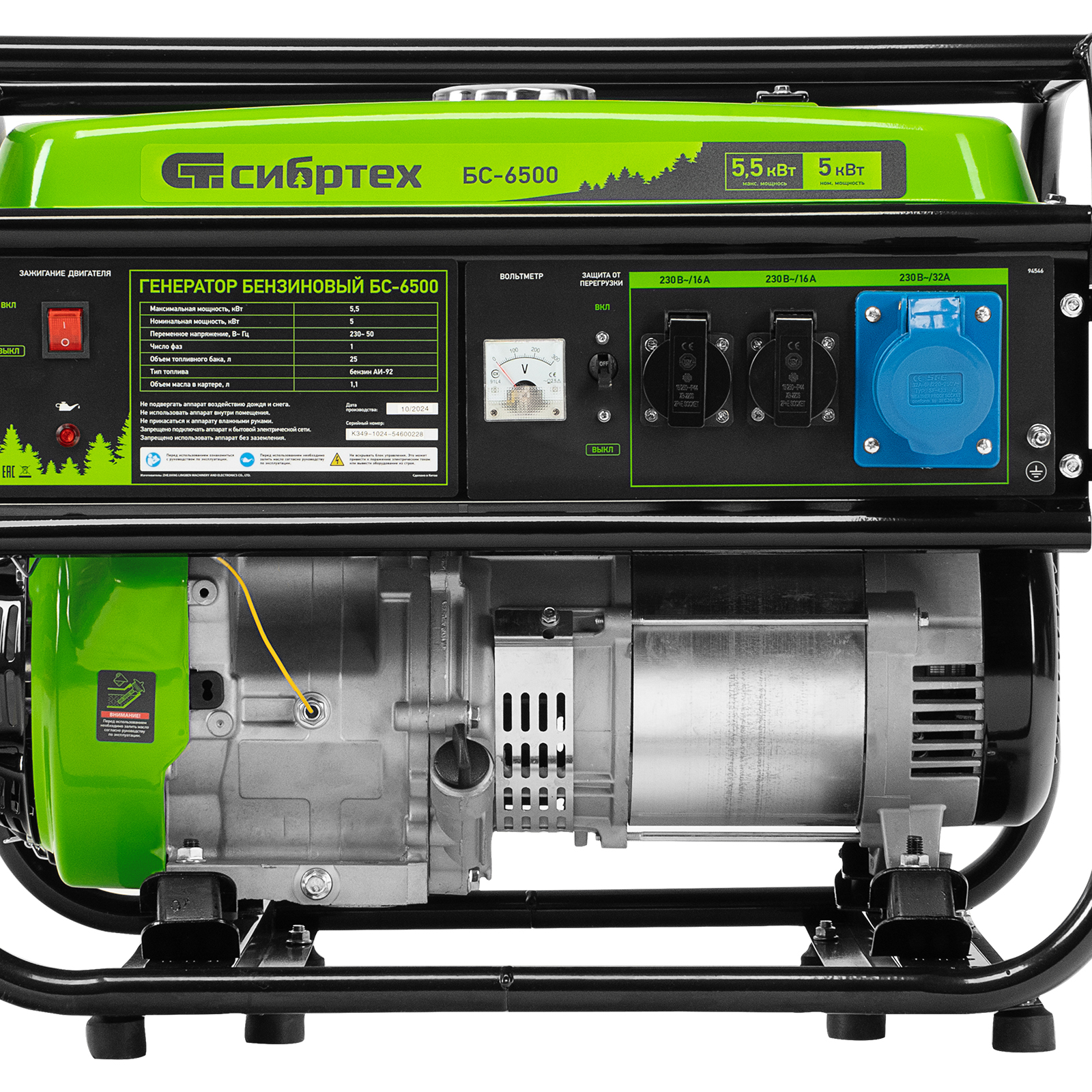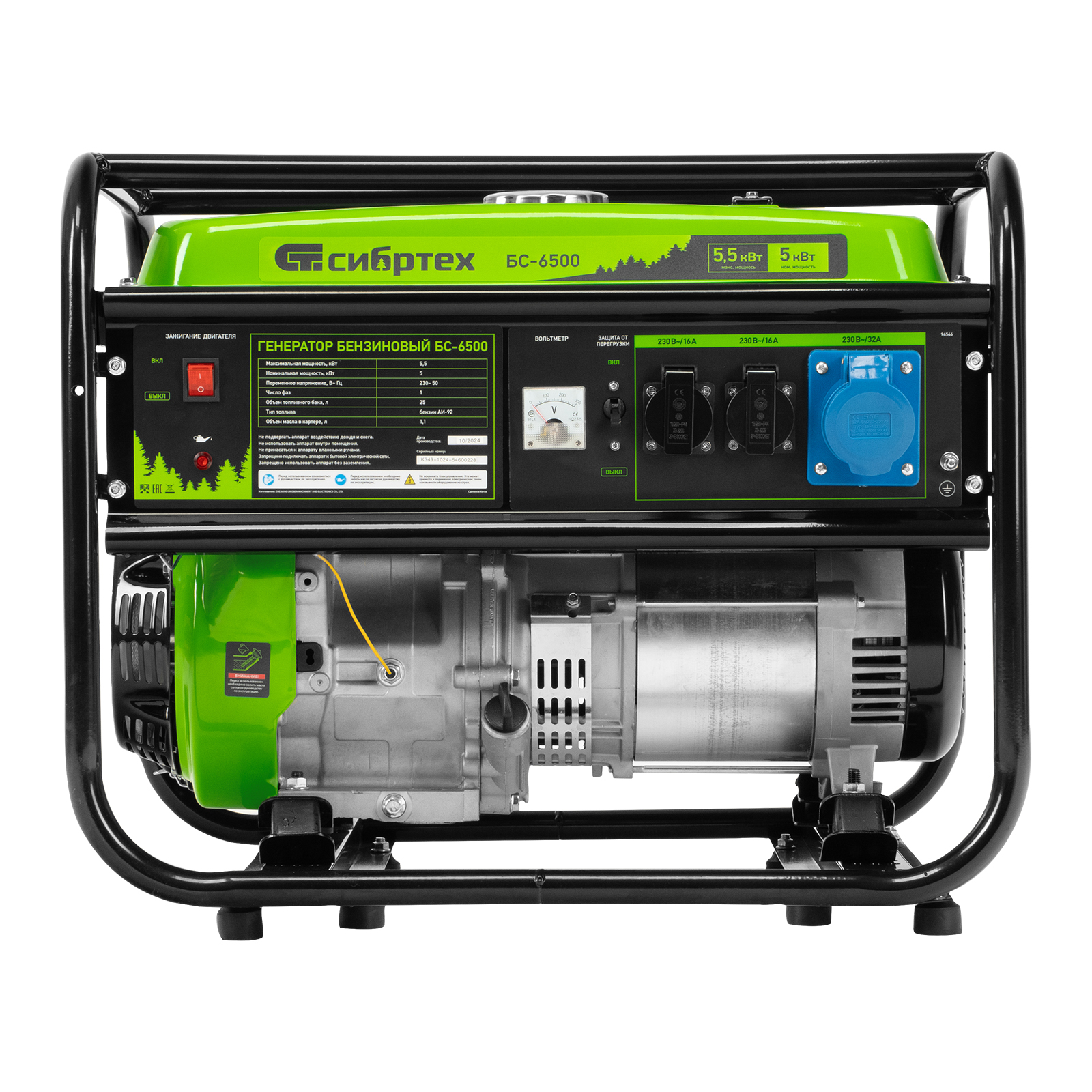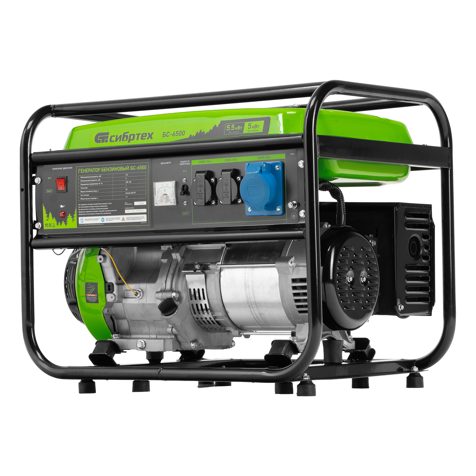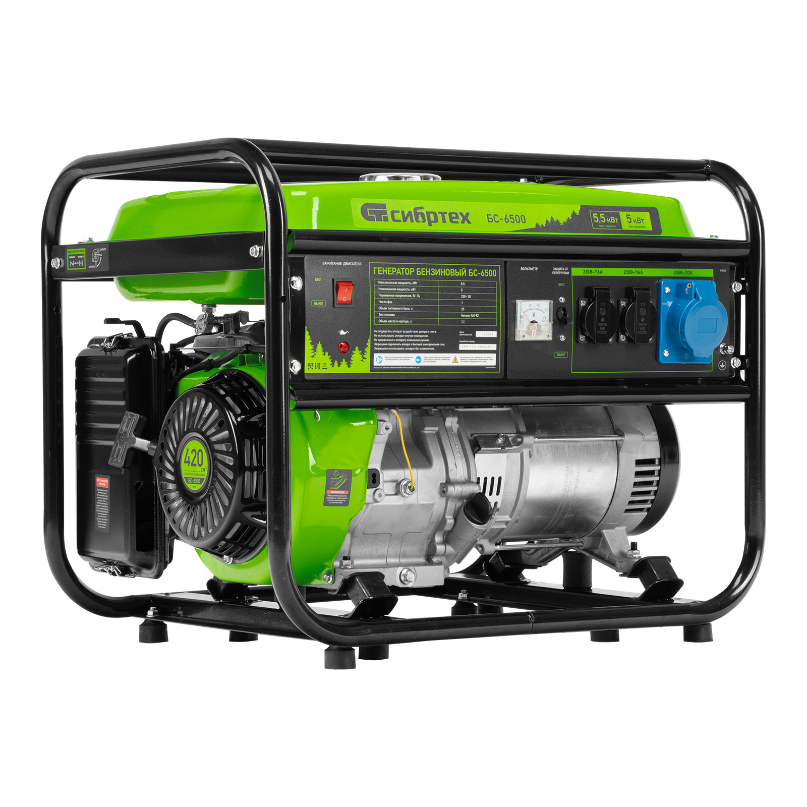Бензиновый генератор Сибртех БС-6500 94546 на 230 В, с 4-тактным двигателем, баком на 25 л и ручным стартером, выдает 5,5 кВт и подходит для создания целой электросети в загородном доме, магазине, мастерской или на строительной площадке. К нему можно одновременно подключить 5 ламп накаливания, холодильник, телевизор. Для подключения приборов предусмотрено 3 розетки. Одна из них силовая на 32А, что позволяет запитать мощное оборудование, например, электрическую плиту.